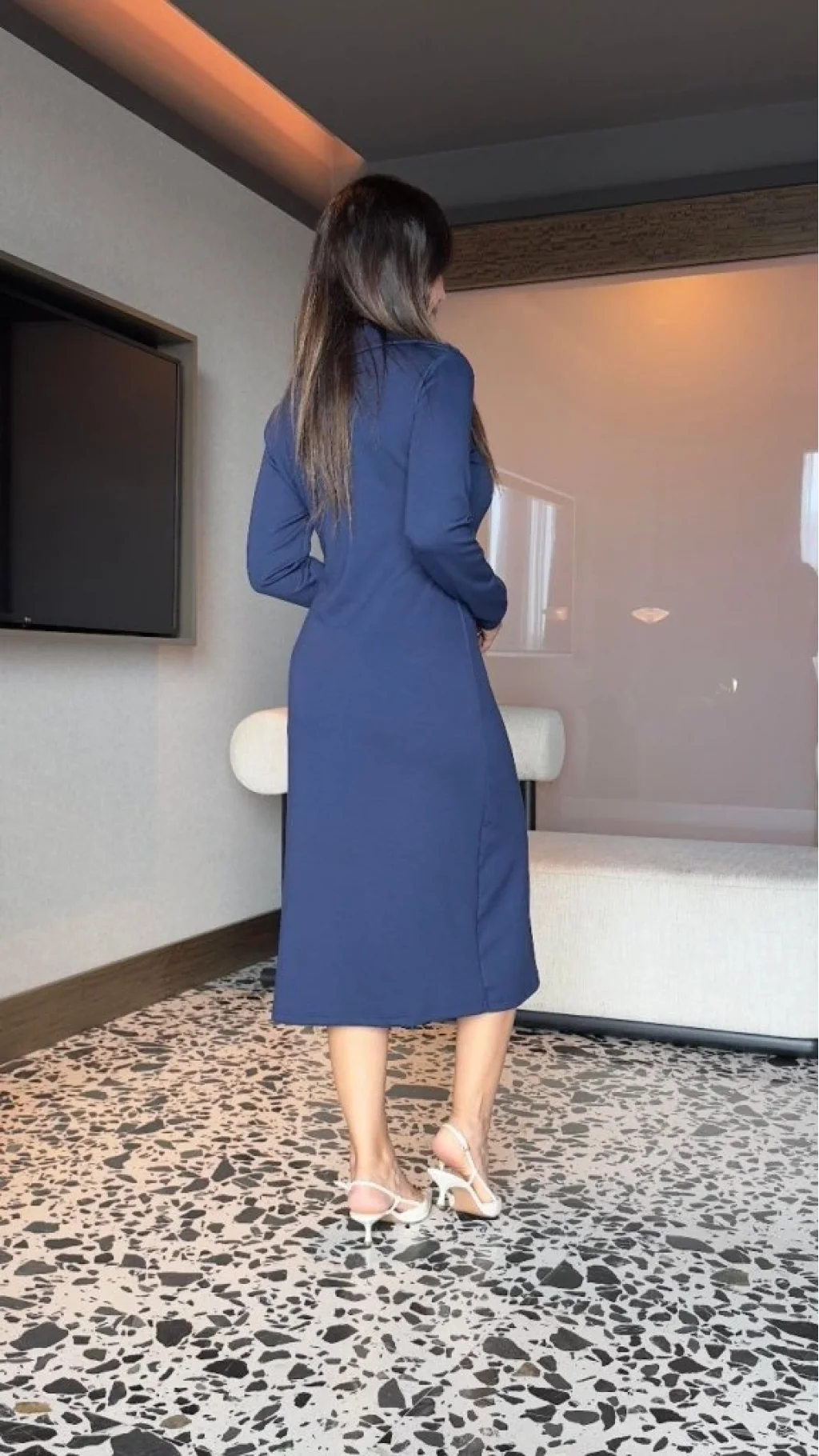 Kadın Uzun Kollu Balıkçı Yaka önden Fermuarlı Yırtmaçlı Midi Viskon Iki Iplik Elbise