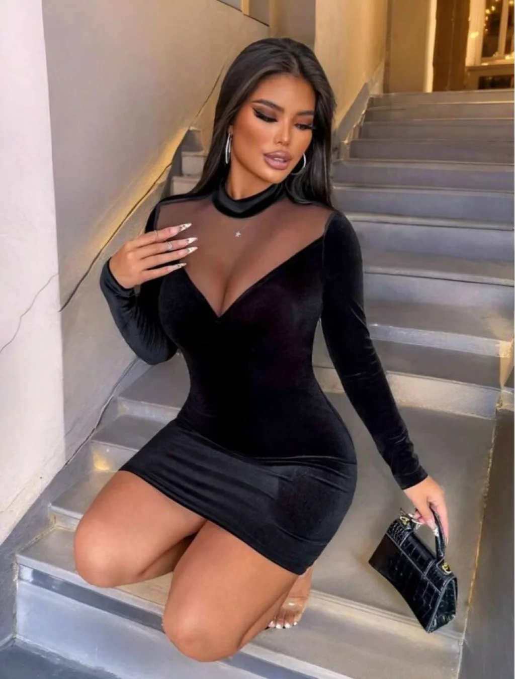 Kadın Uzun Kollu Balıkçı Yaka Tül Detaylı Mini Kadife Elbise