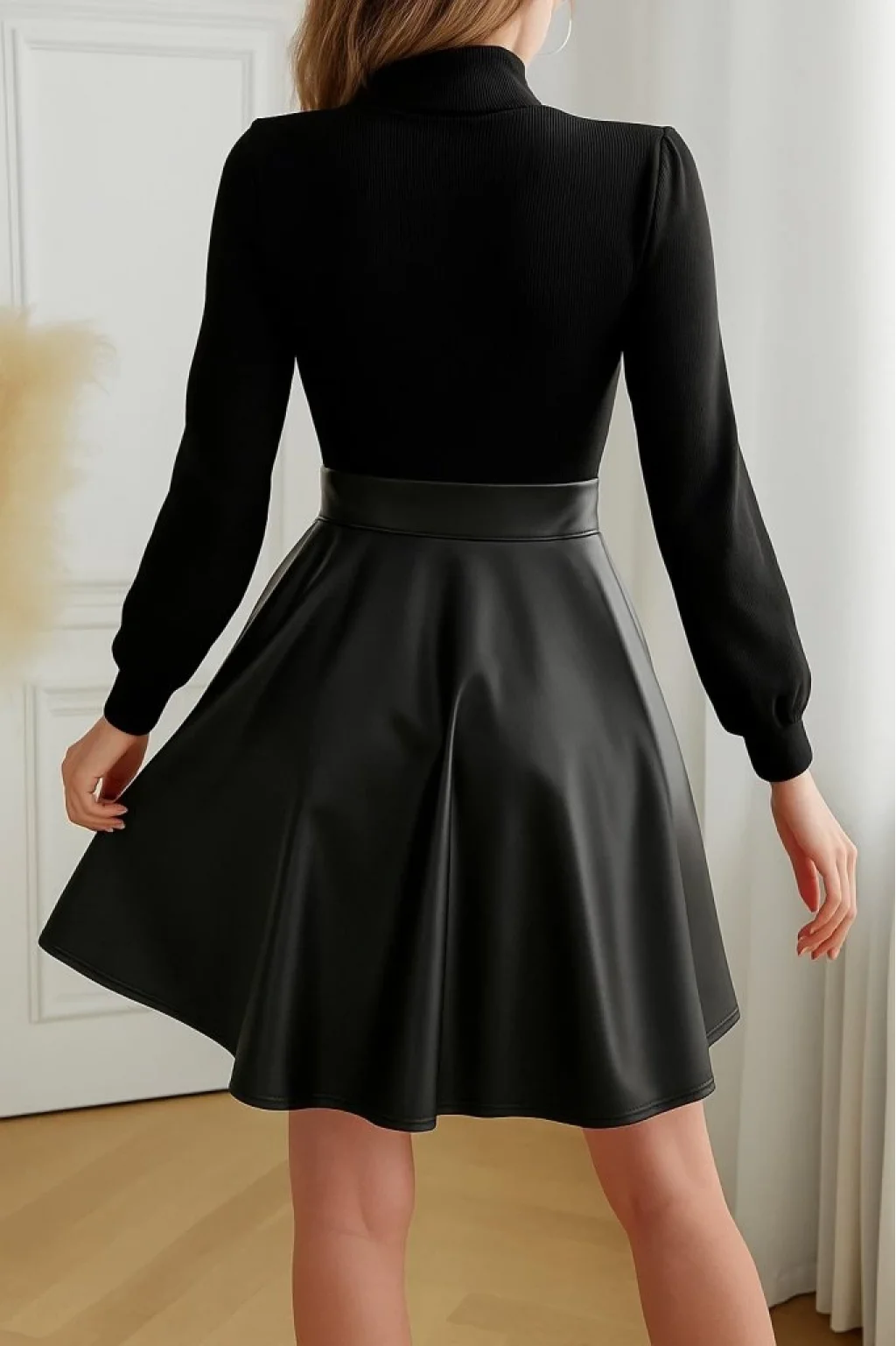 Kadın Uzun Kollu Balıkçı Yaka üst Kaşkorse Alt Deri Detaylı Mini Elbise