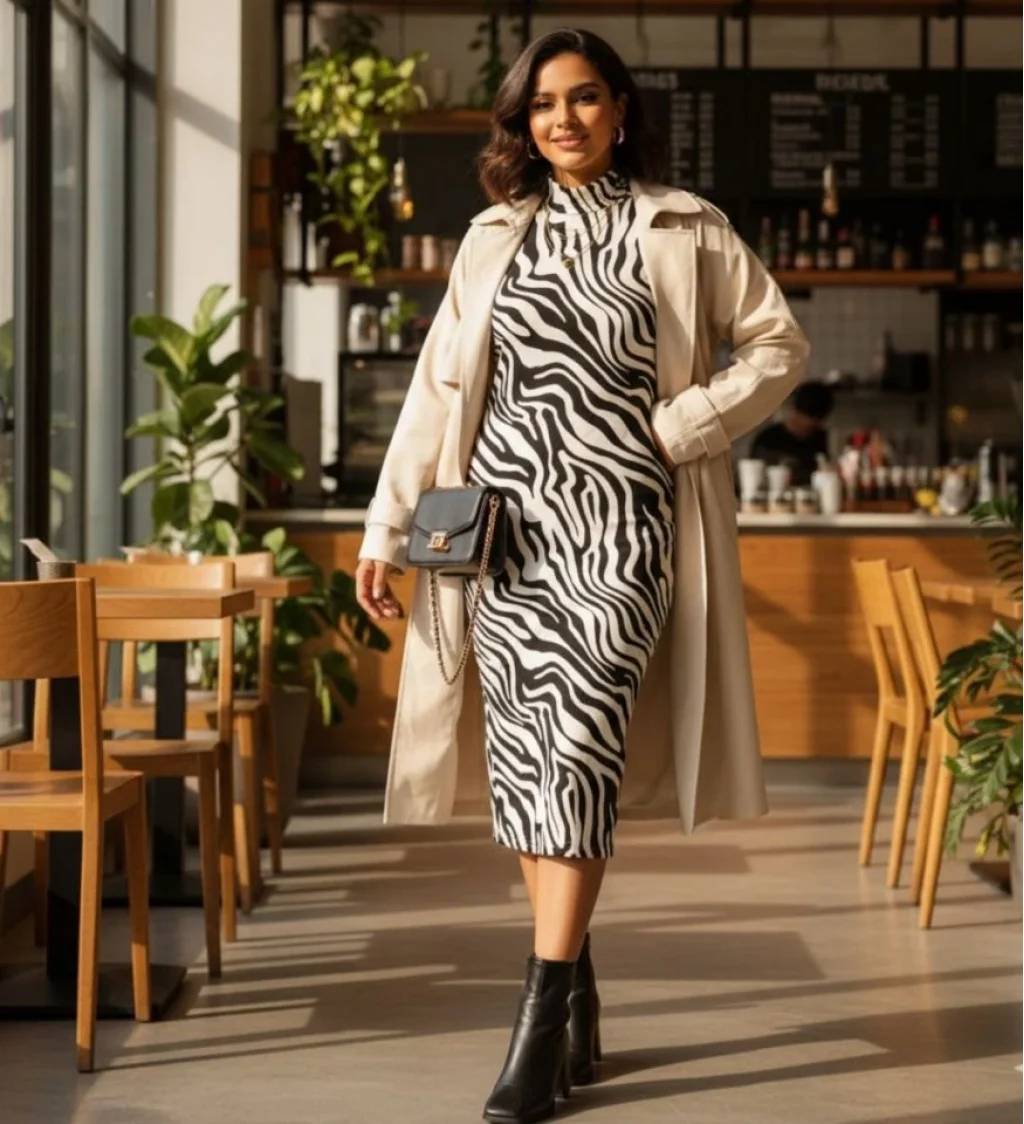 Kadın Uzun Kollu Balıkçı Yaka Zebra Detay Midi Boy Elbise