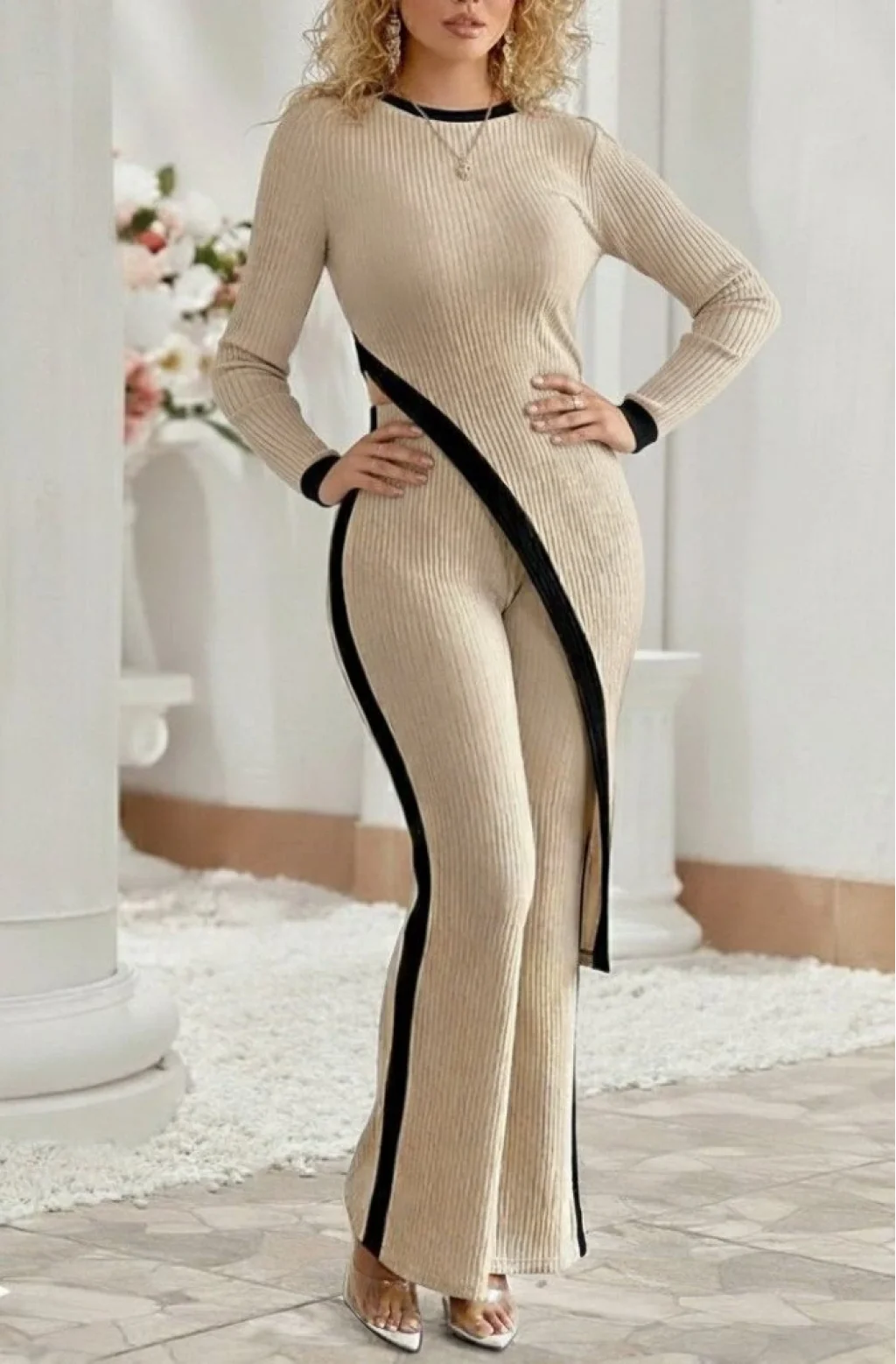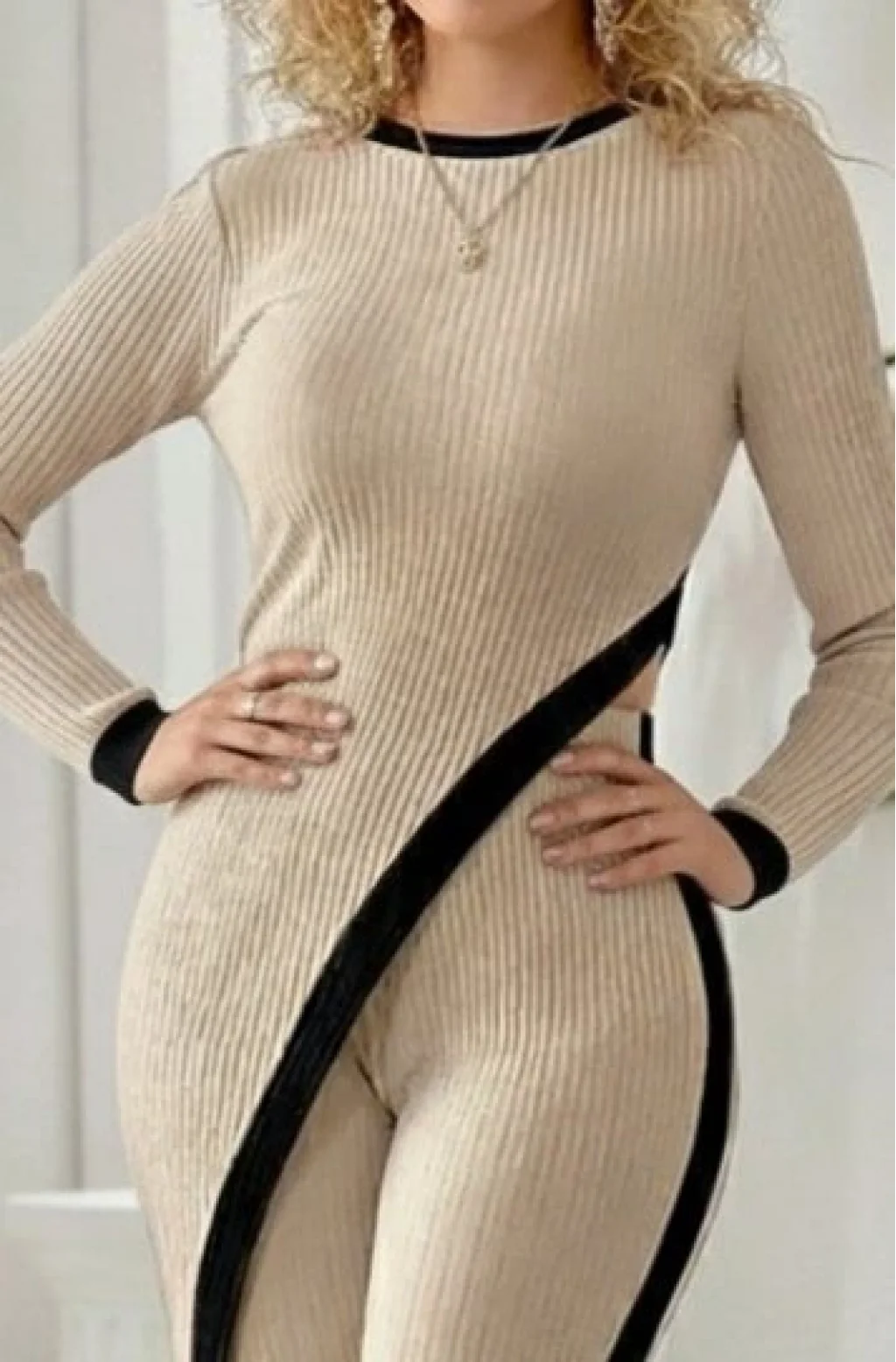 Kadın Uzun Kollu Bisiklet Yaka Asimetrik Kesim Bluz şardonlu Kaşkorse Bluz Ve Pantolon Ikili Takım