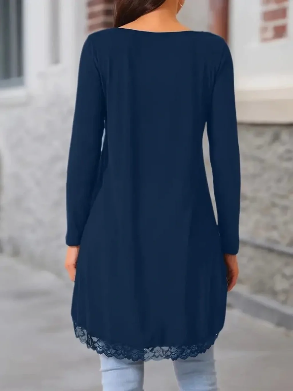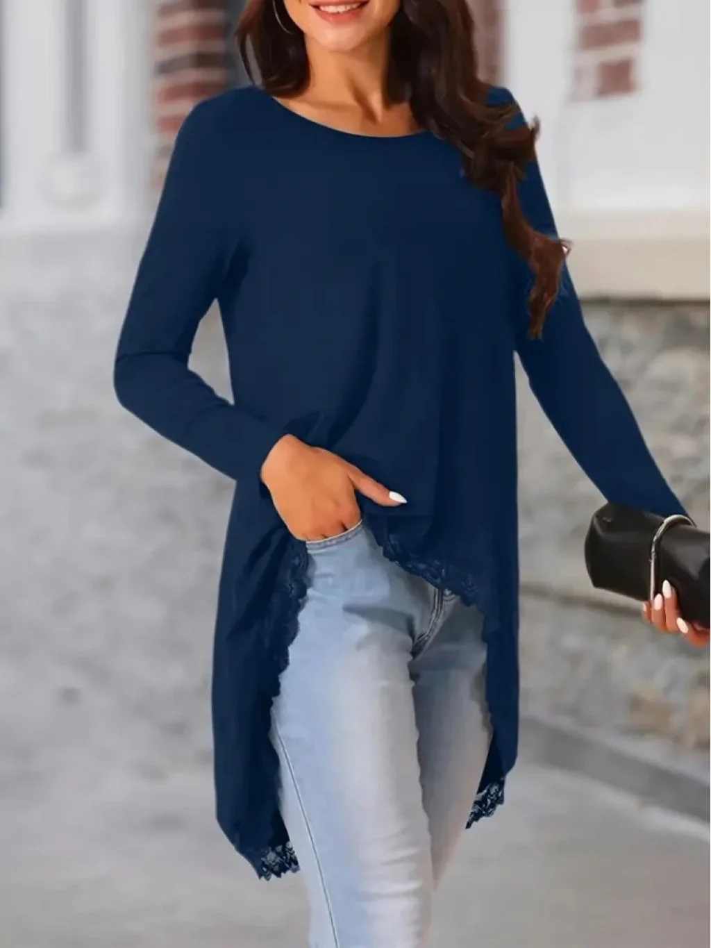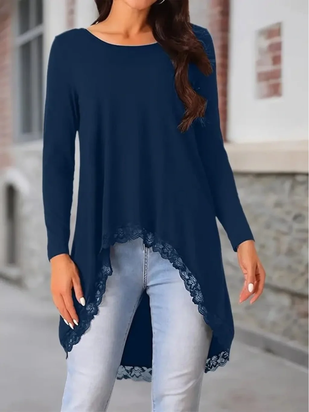 Kadın Uzun Kollu Bisiklet Yaka Asimetrik Kesim Detaylı Dantelli Viskon Bluz