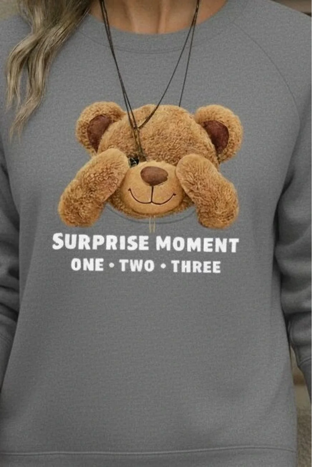 Kadın Uzun Kollu Bisiklet Yaka Ayıcık Desenli Viskon Iki Iplik Bluz