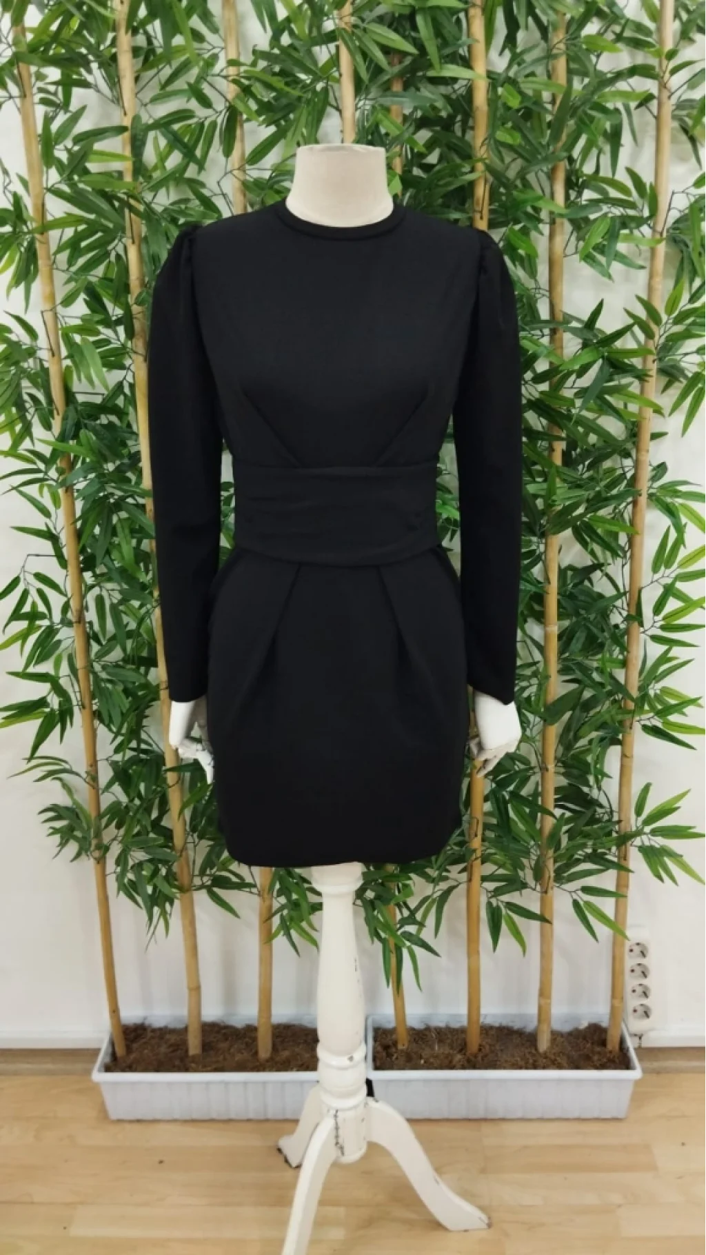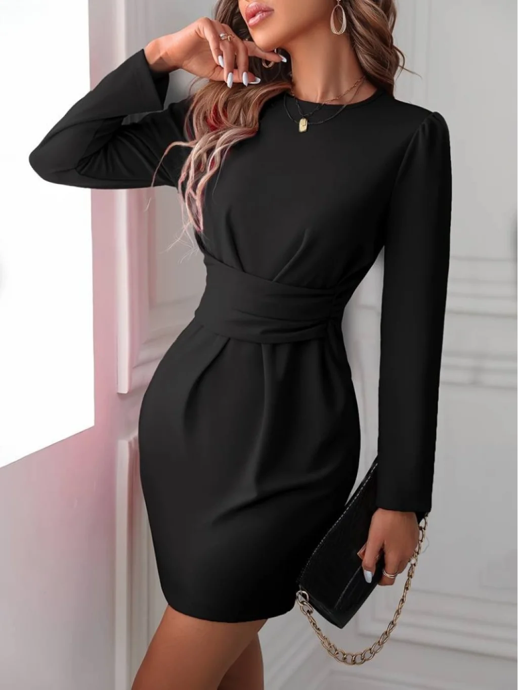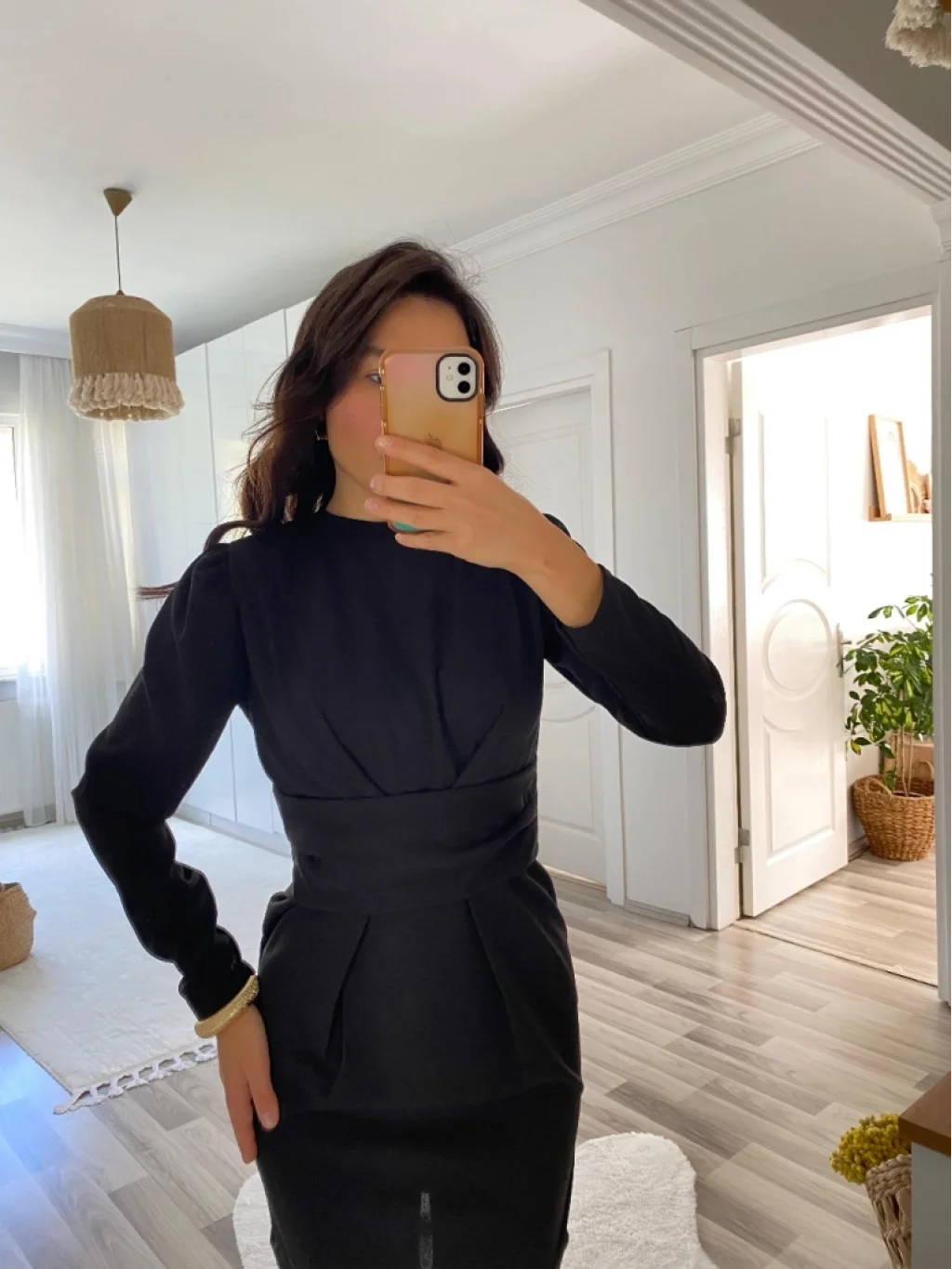 Kadın Uzun Kollu Bisiklet Yaka Bel Kemer Detay Ithal Krep Elbise