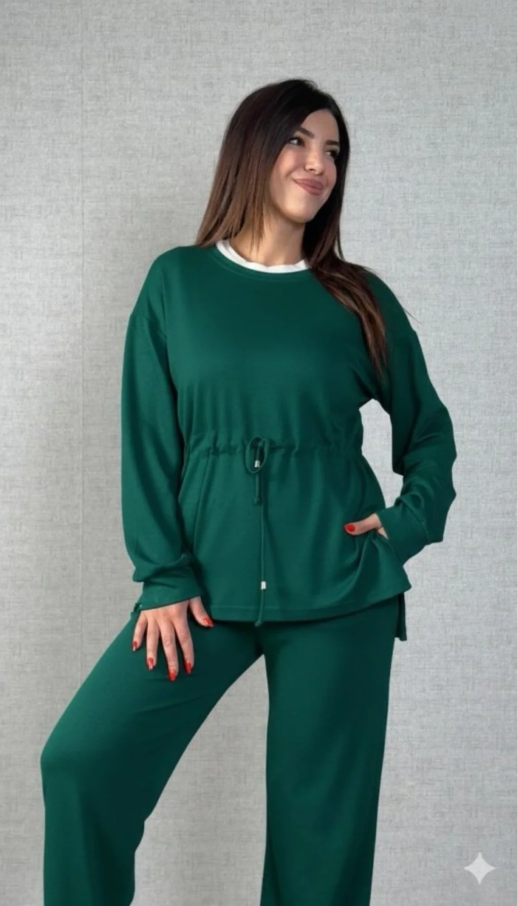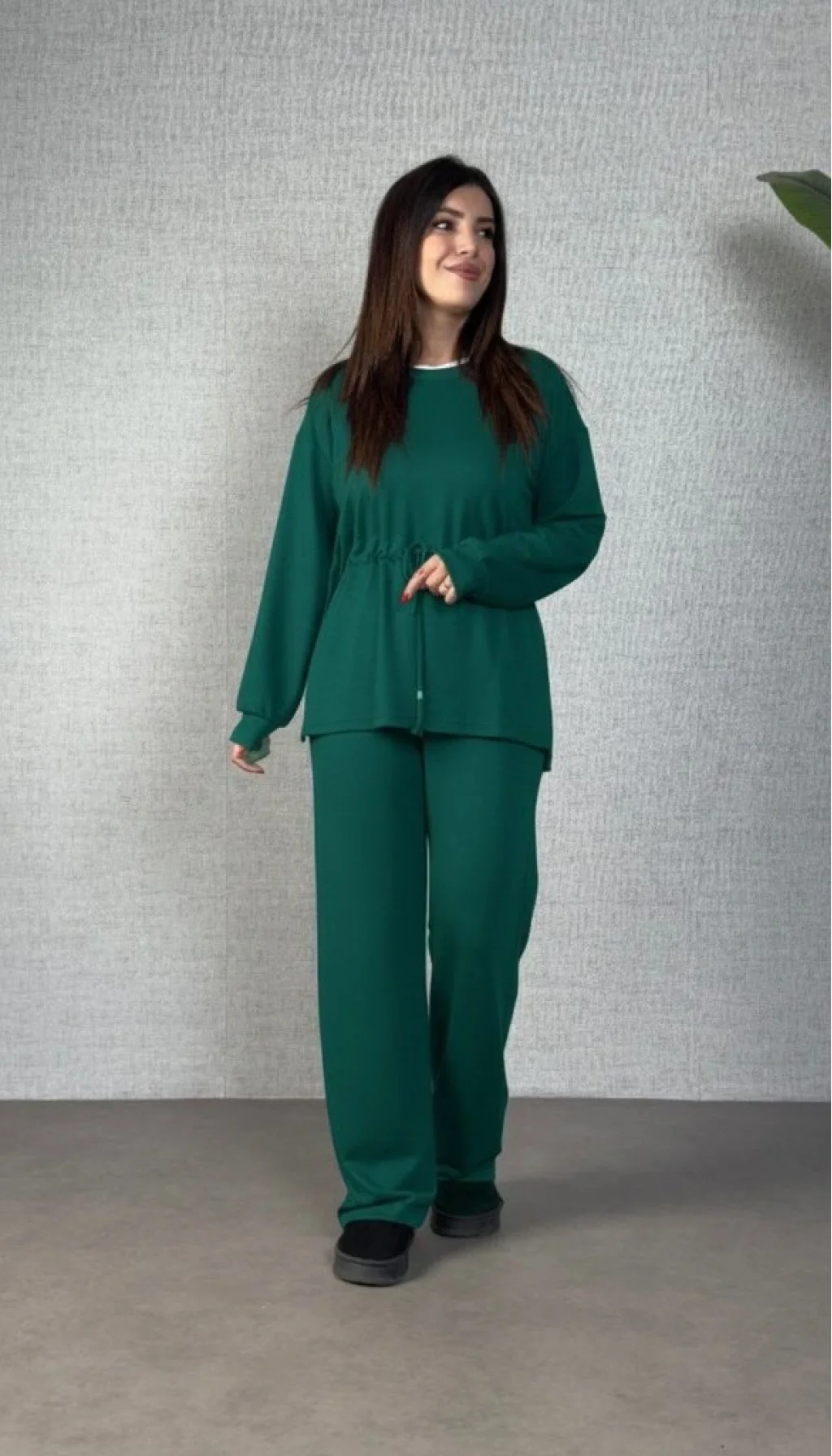 Kadın Uzun Kollu Bisiklet Yaka Belden Büzgülü Bağcıklı Viskon Iki Iplik Bluz Ve Pantolon Ikili Takım