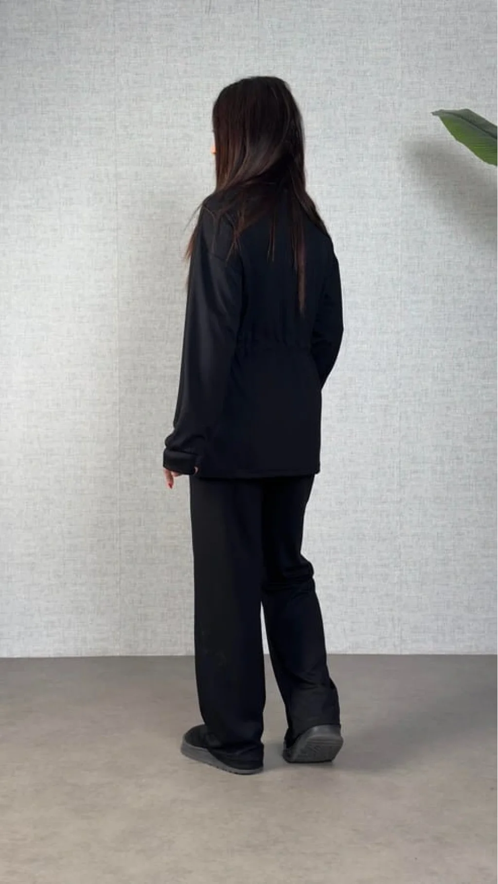 Kadın Uzun Kollu Bisiklet Yaka Belden Büzgülü Bağcıklı Viskon Iki Iplik Bluz Ve Pantolon Ikili Takım