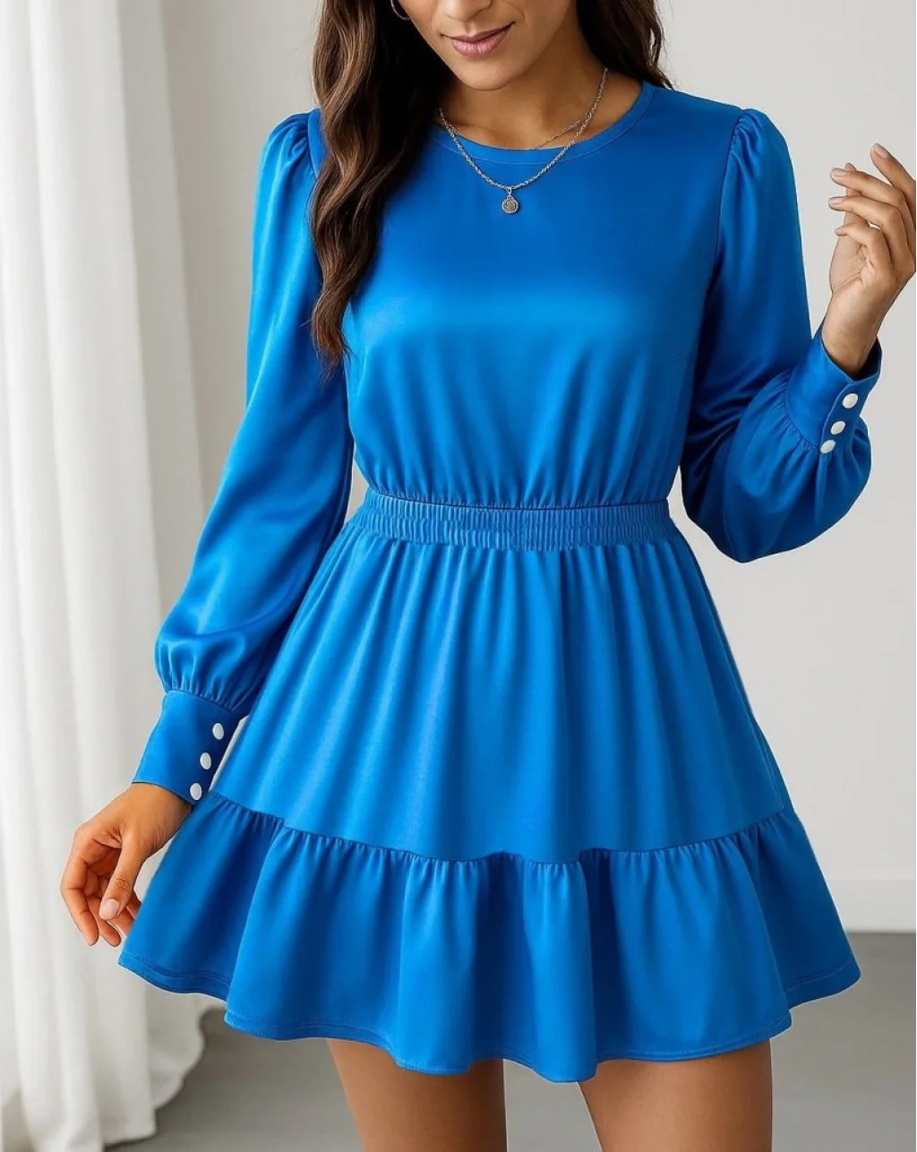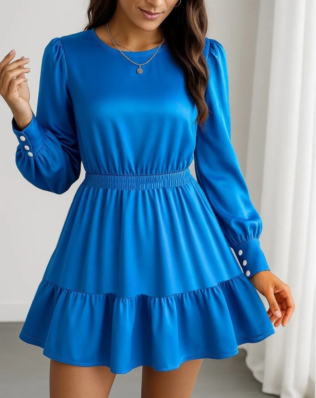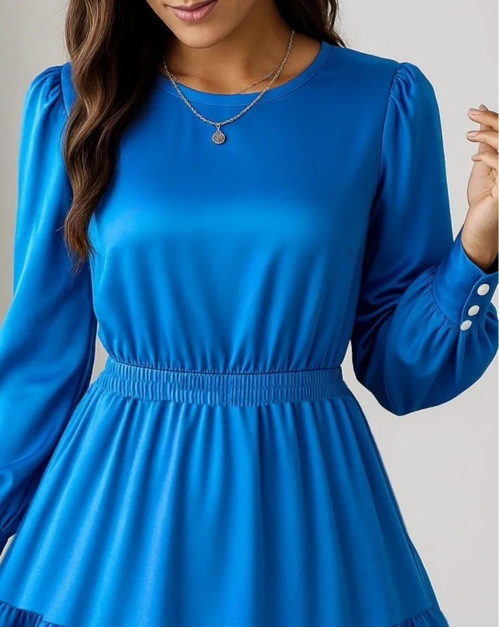 Kadın Uzun Kollu Bisiklet Yaka Beli Lastikli Fırfırlı Ithal Krep Elbise
