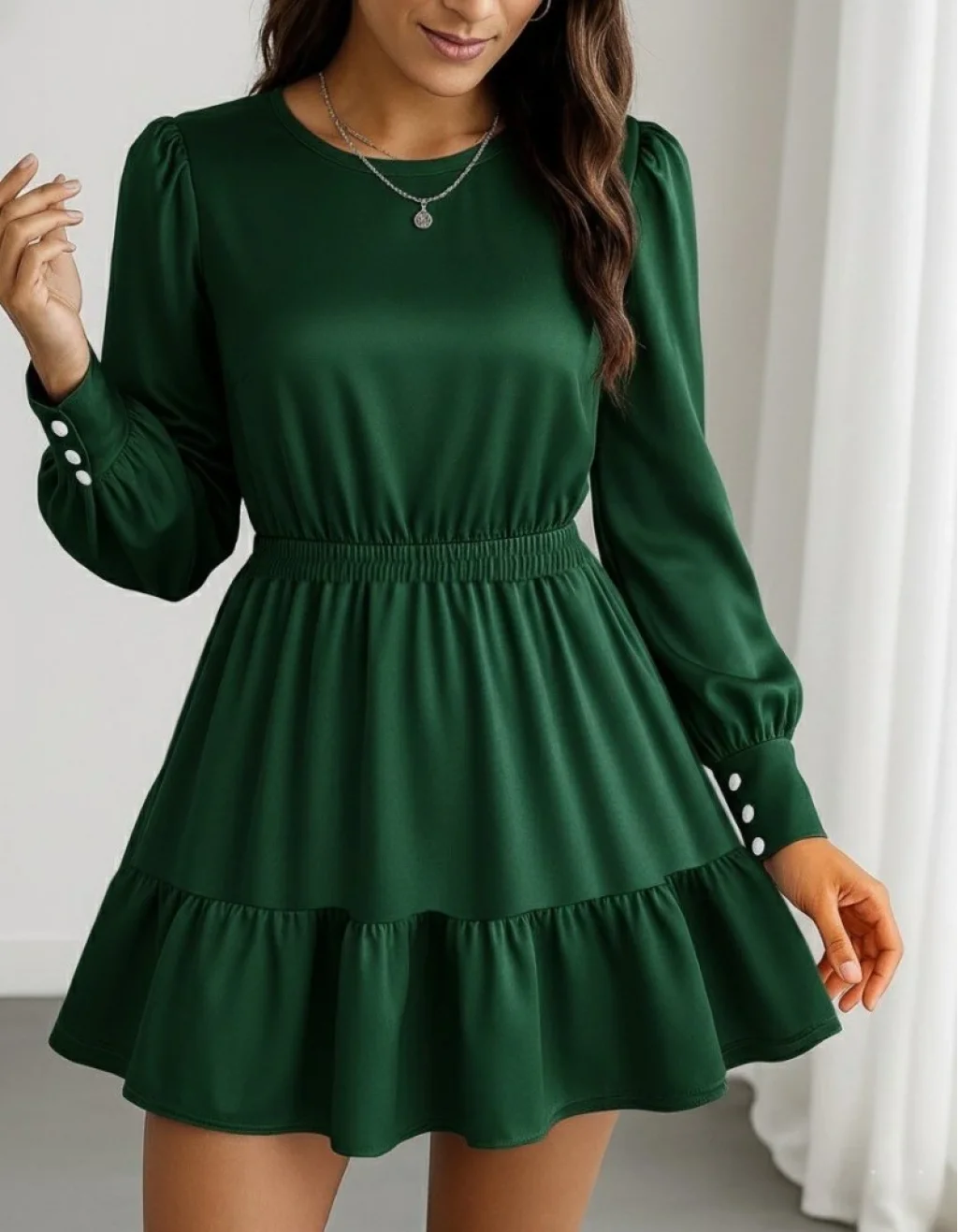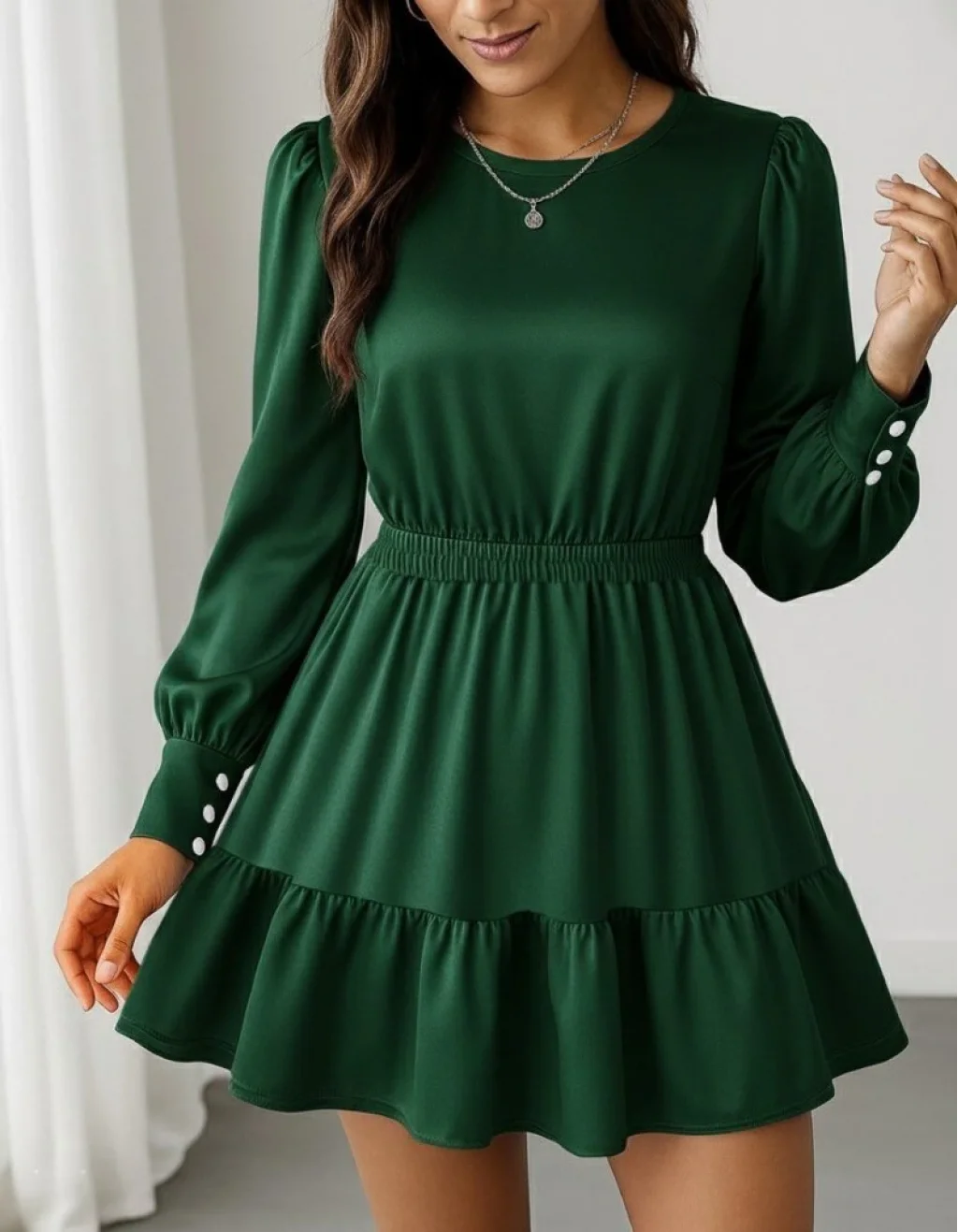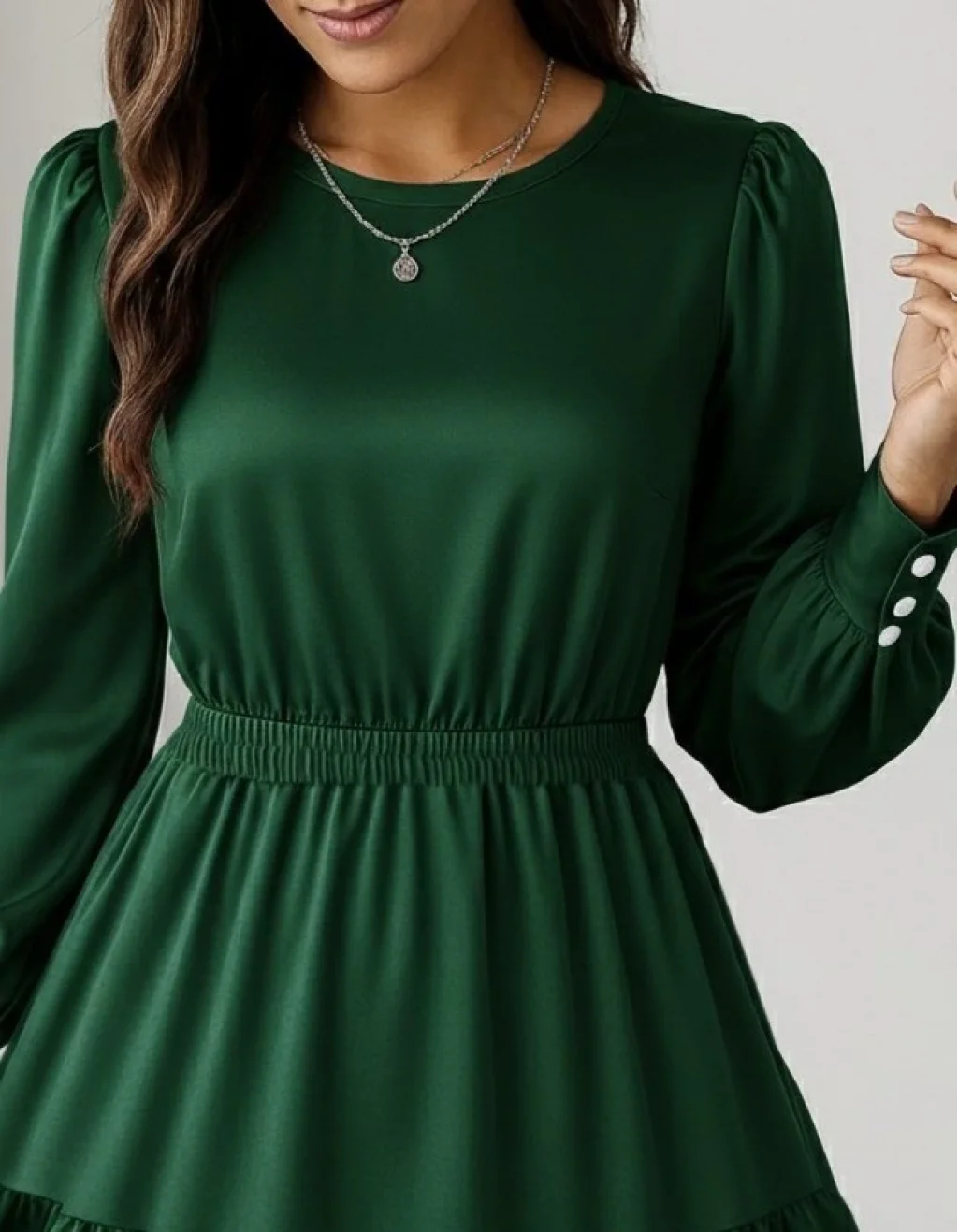 Kadın Uzun Kollu Bisiklet Yaka Beli Lastikli Fırfırlı Ithal Krep Elbise