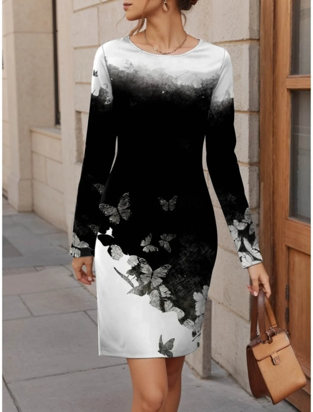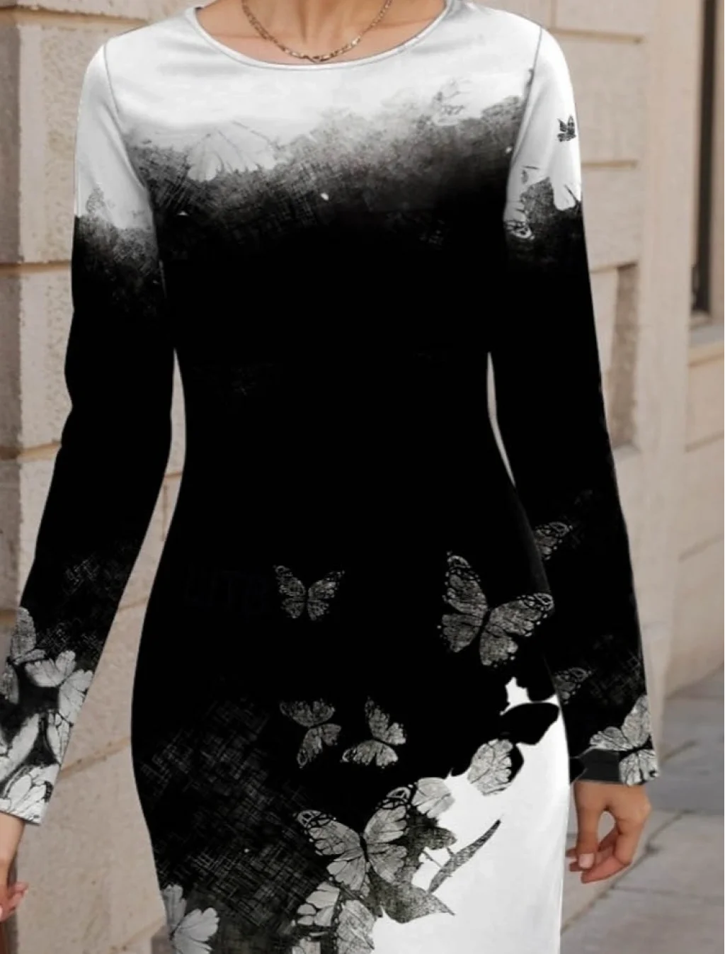 Kadın Uzun Kollu Bisiklet Yaka çiçek Desenli Kısa şardonlu Dalgıç Elbise
