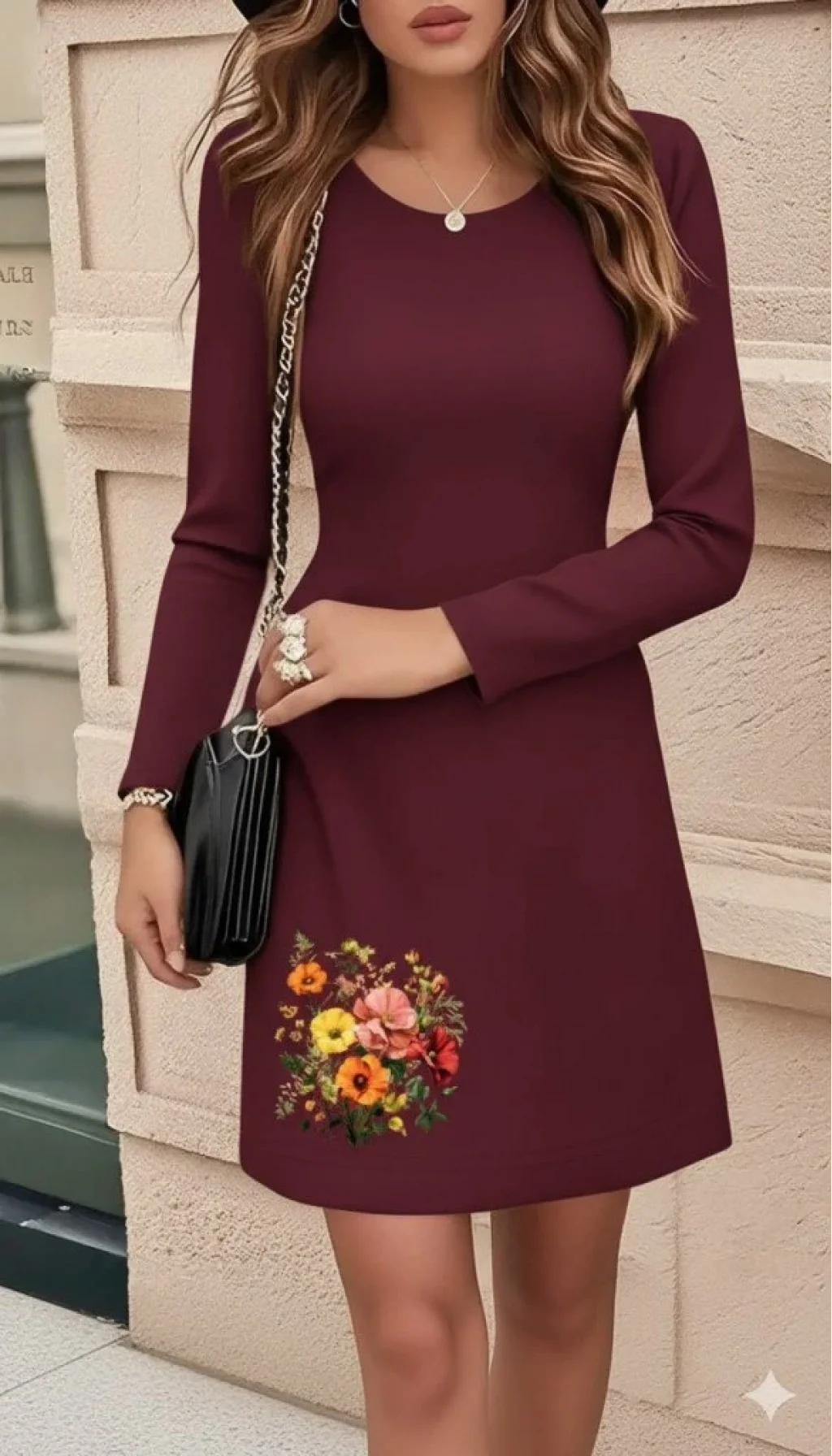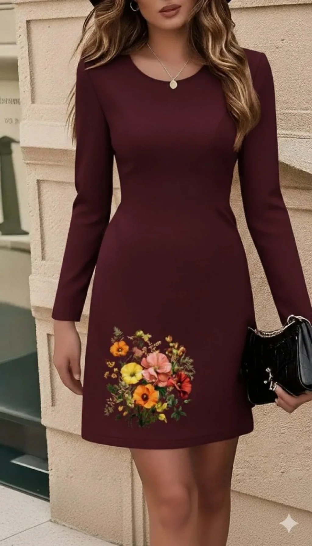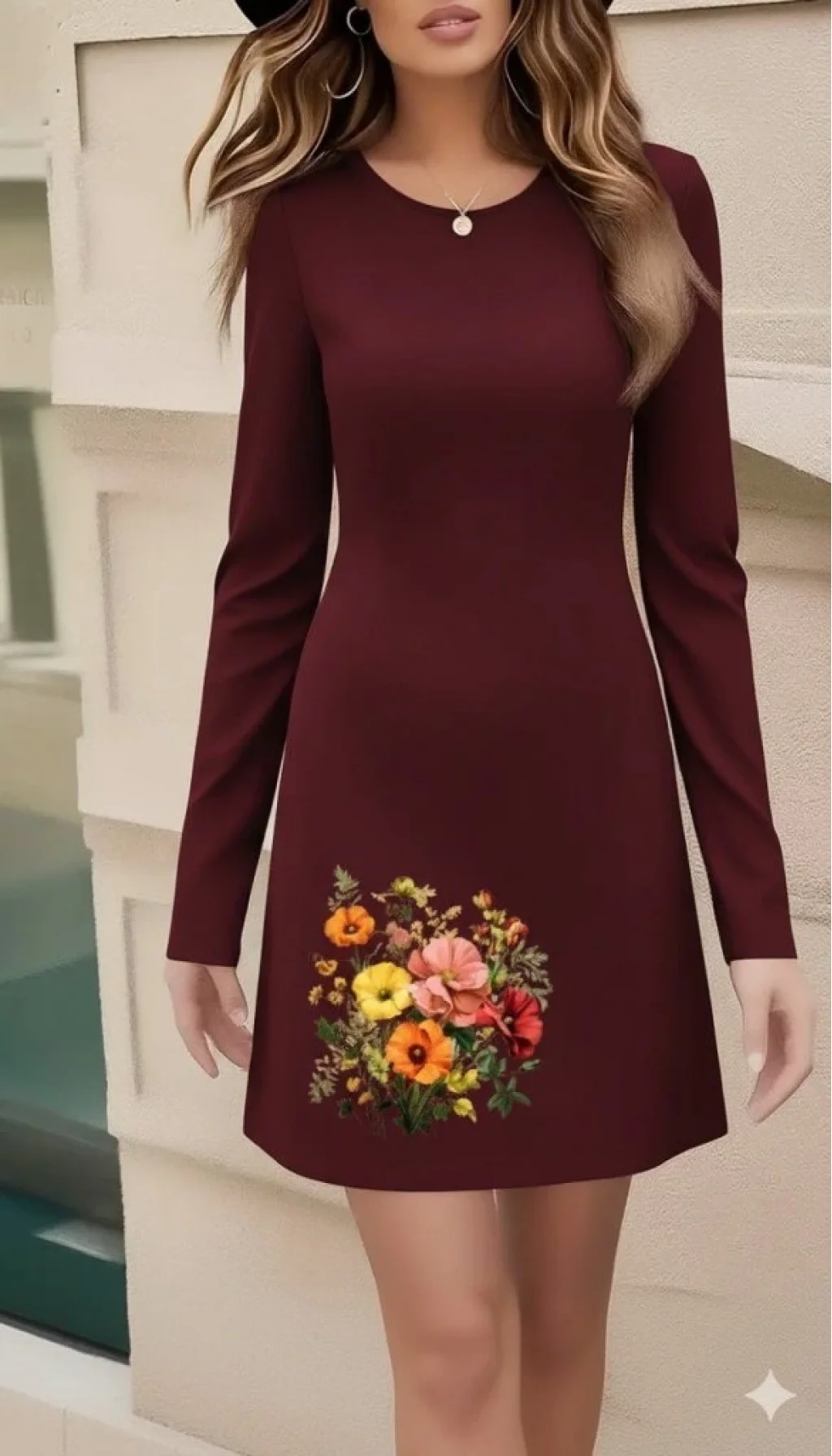 Kadın Uzun Kollu Bisiklet Yaka çiçek Desenli Mini Dalgıç Elbise