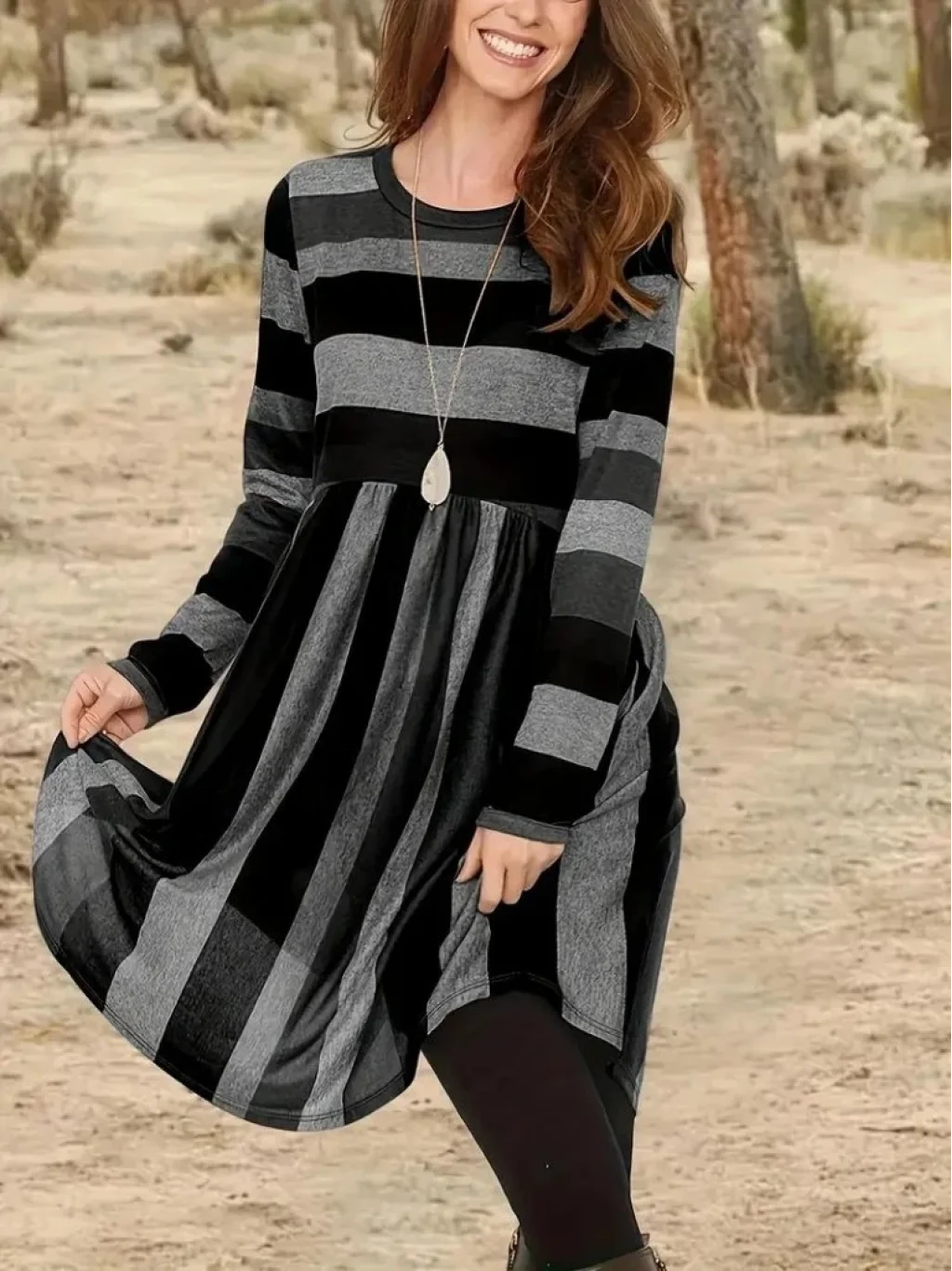 Kadın Uzun Kollu Bisiklet Yaka çizgili Desen Detaylı Süprem Mini Elbise