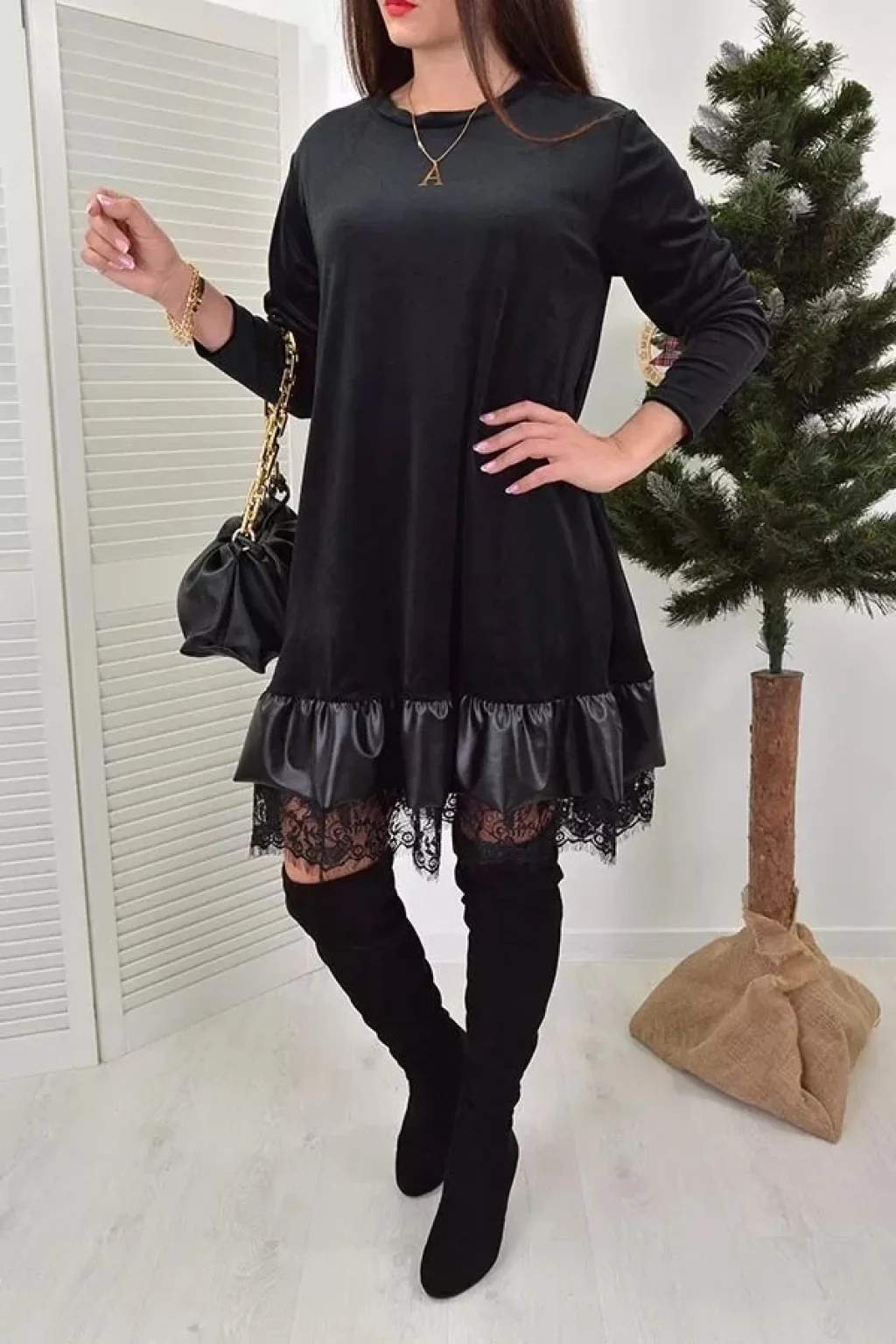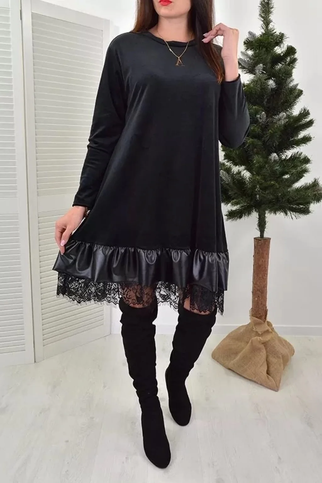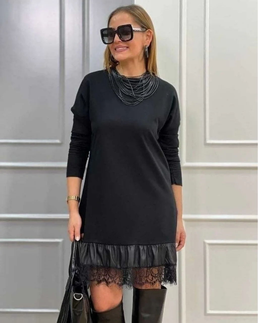 Kadın Uzun Kollu Bisiklet Yaka Etek Ucu Deri Ve Tül Detay Iki Iplik Mini Boy Elbise