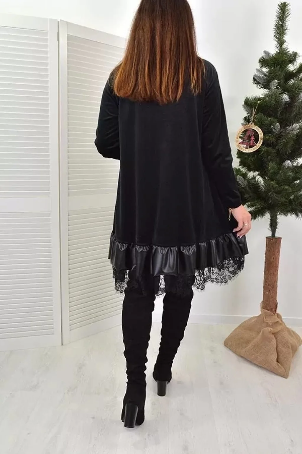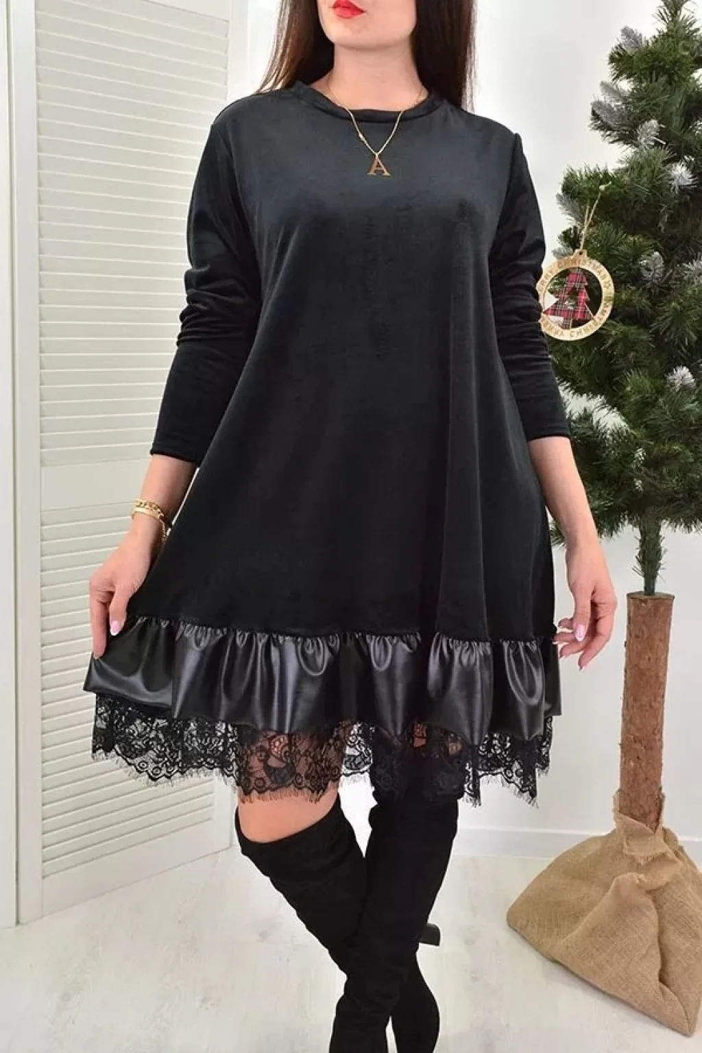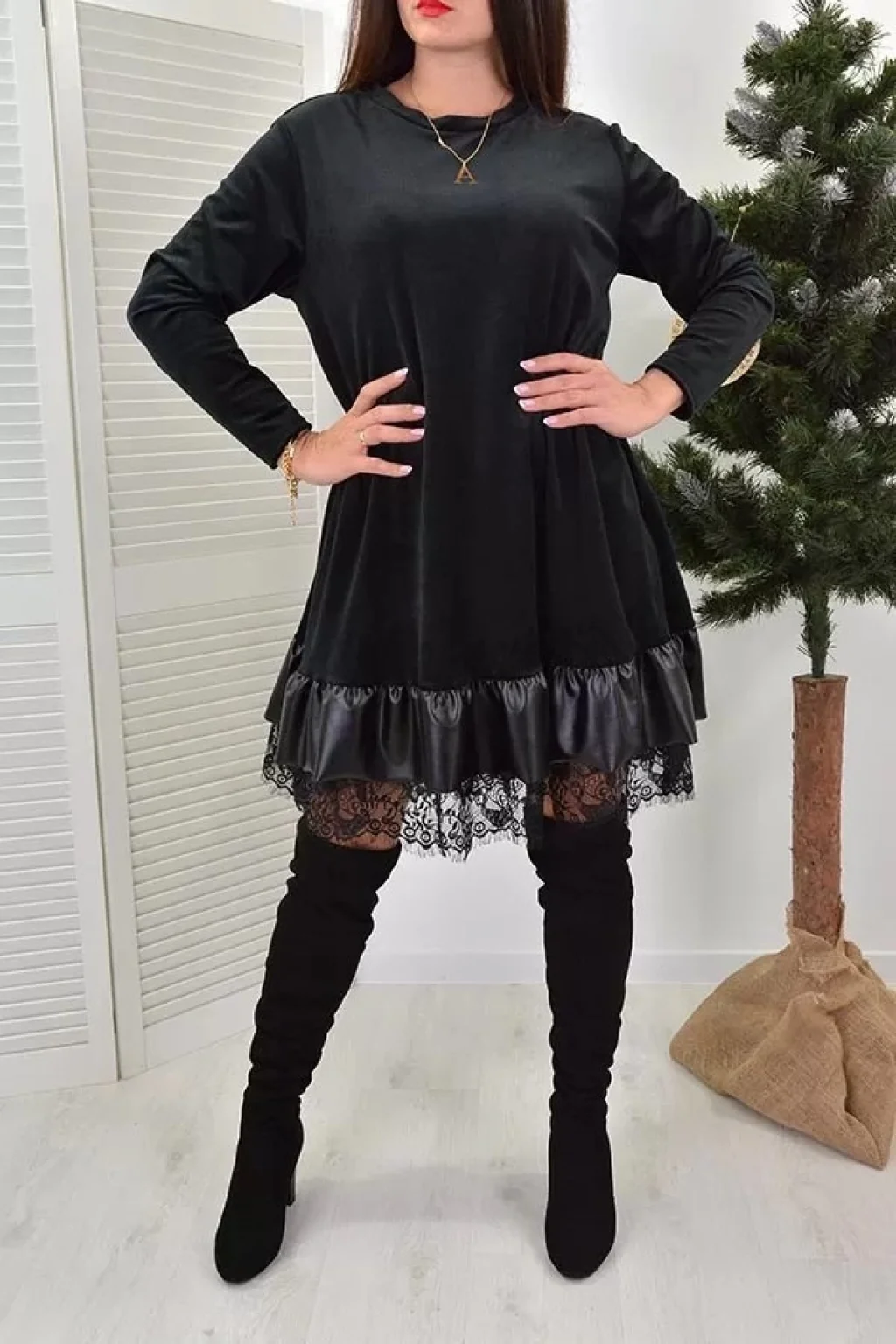 Kadın Uzun Kollu Bisiklet Yaka Etek Ucu Deri Ve Tül Detay Iki Iplik Mini Boy Elbise