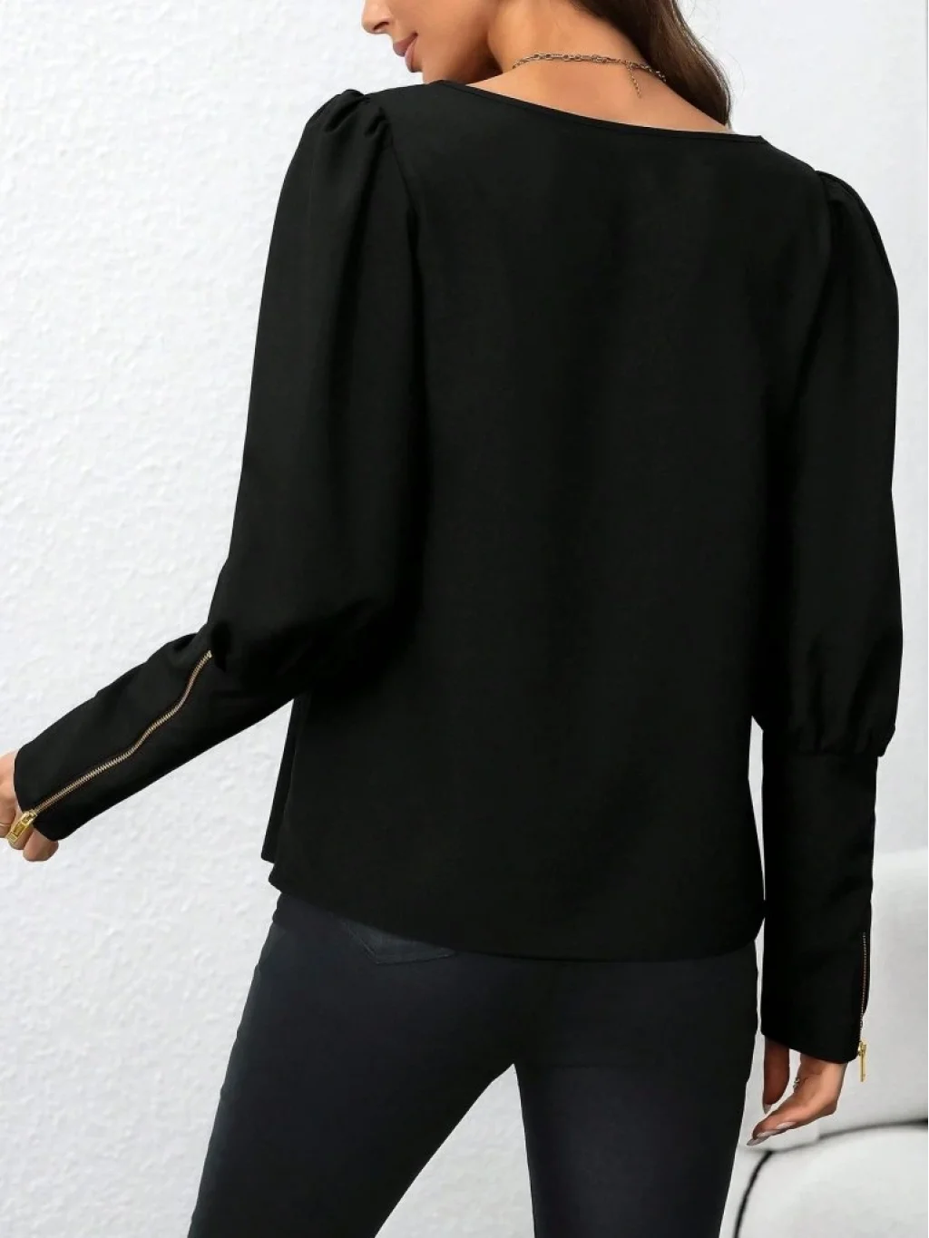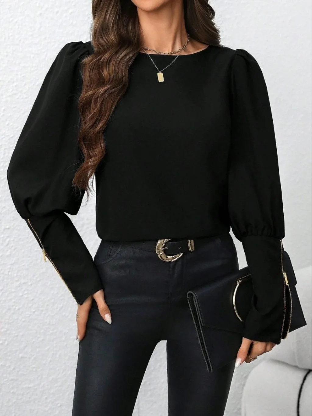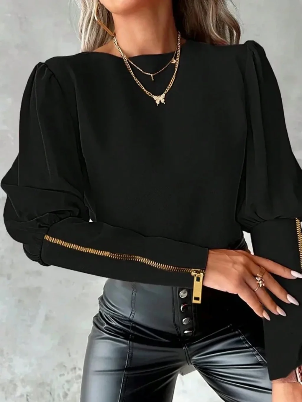 Kadın Uzun Kollu Bisiklet Yaka Fermuar Detaylı Ithal Krep Bluz