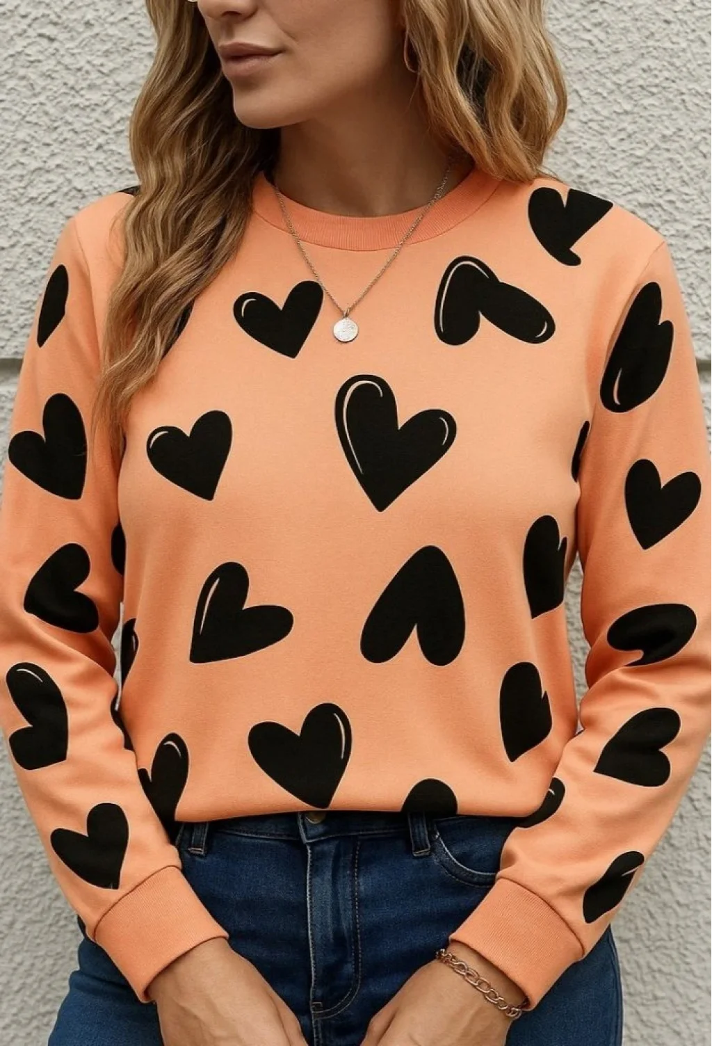 Kadın Uzun Kollu Bisiklet Yaka Kalp Desenli Iki Iplik Bluz