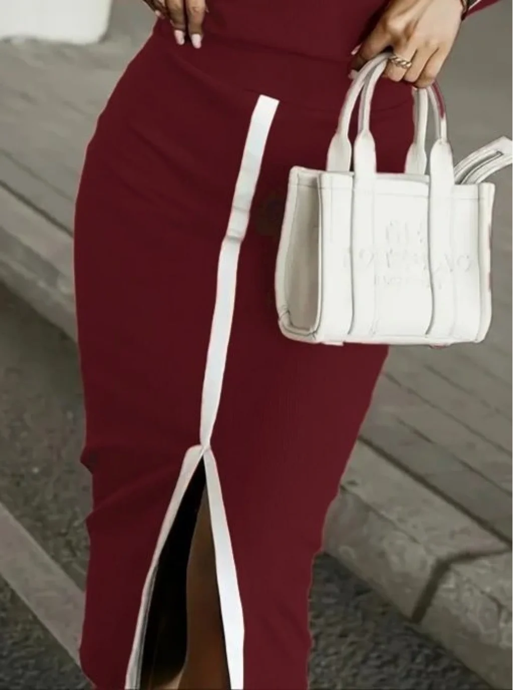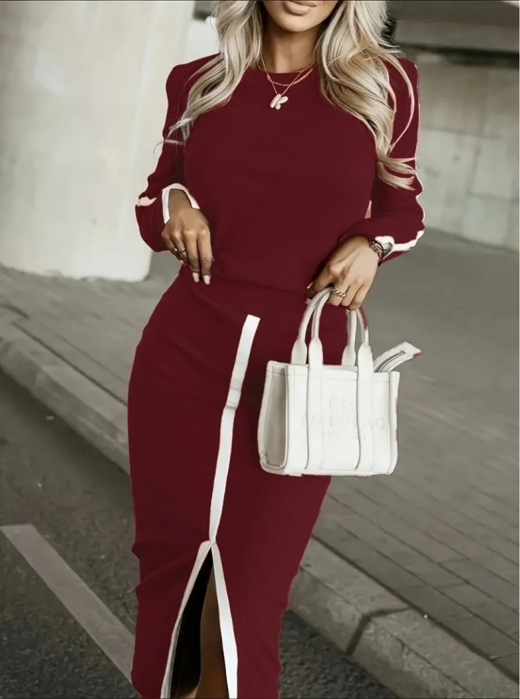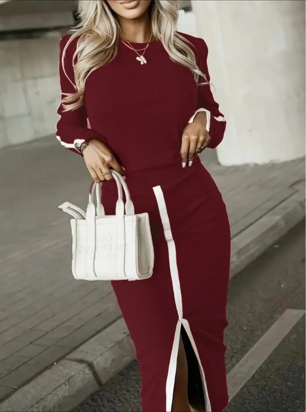 Kadın Uzun Kollu Bisiklet Yaka Kaşkorse Bluz Ve Yırtmaçlı Etek Ikili Takım