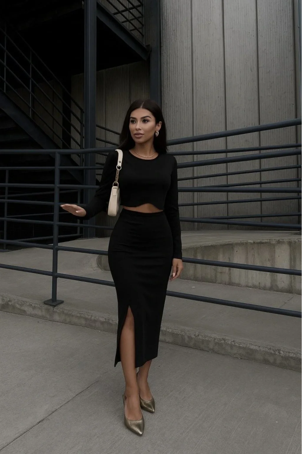 Kadın Uzun Kollu Bisiklet Yaka Kısa Krop Dalgıç Bluz Ile önden Yırtmaçlı Uzun Etek Ikili Takım