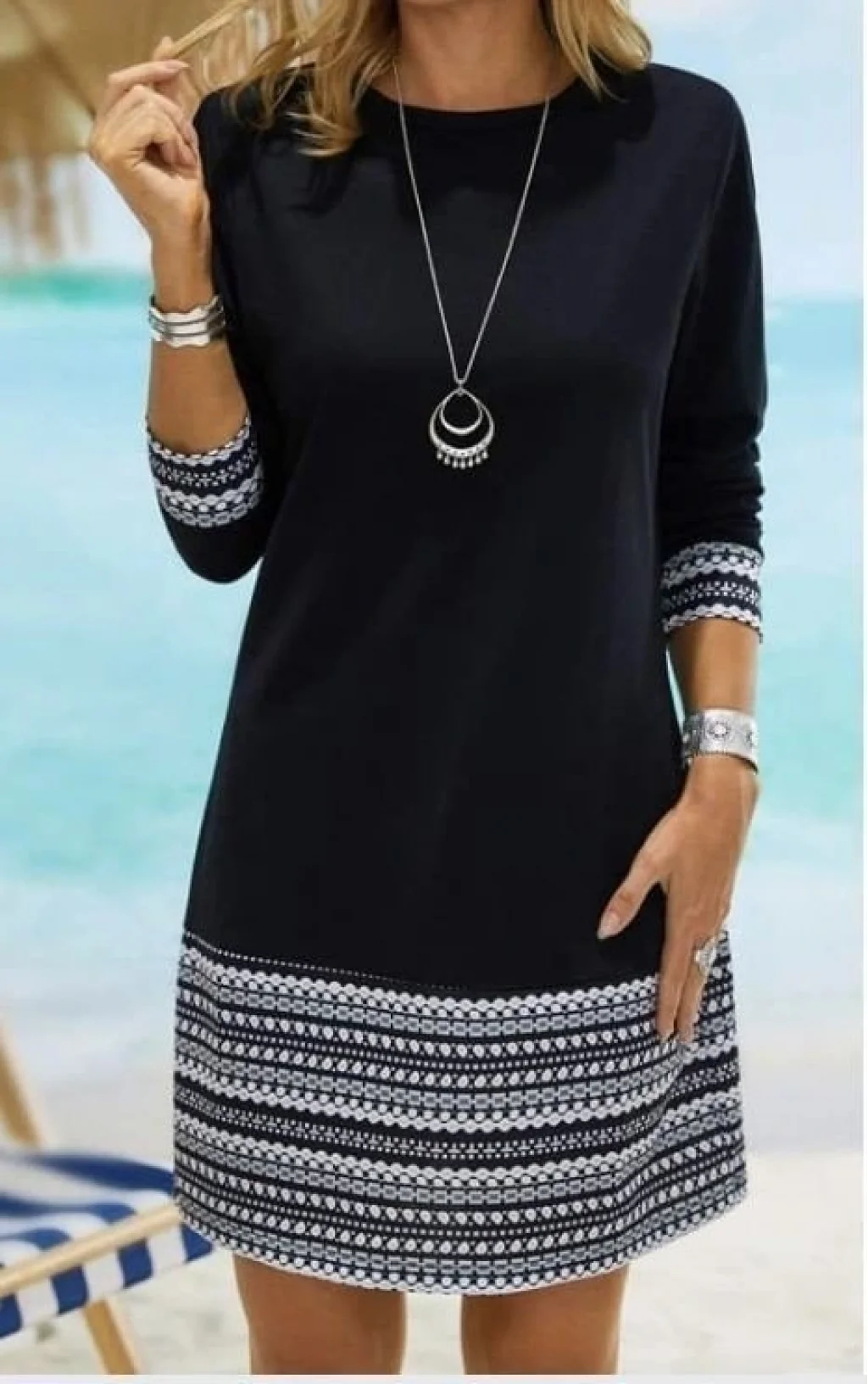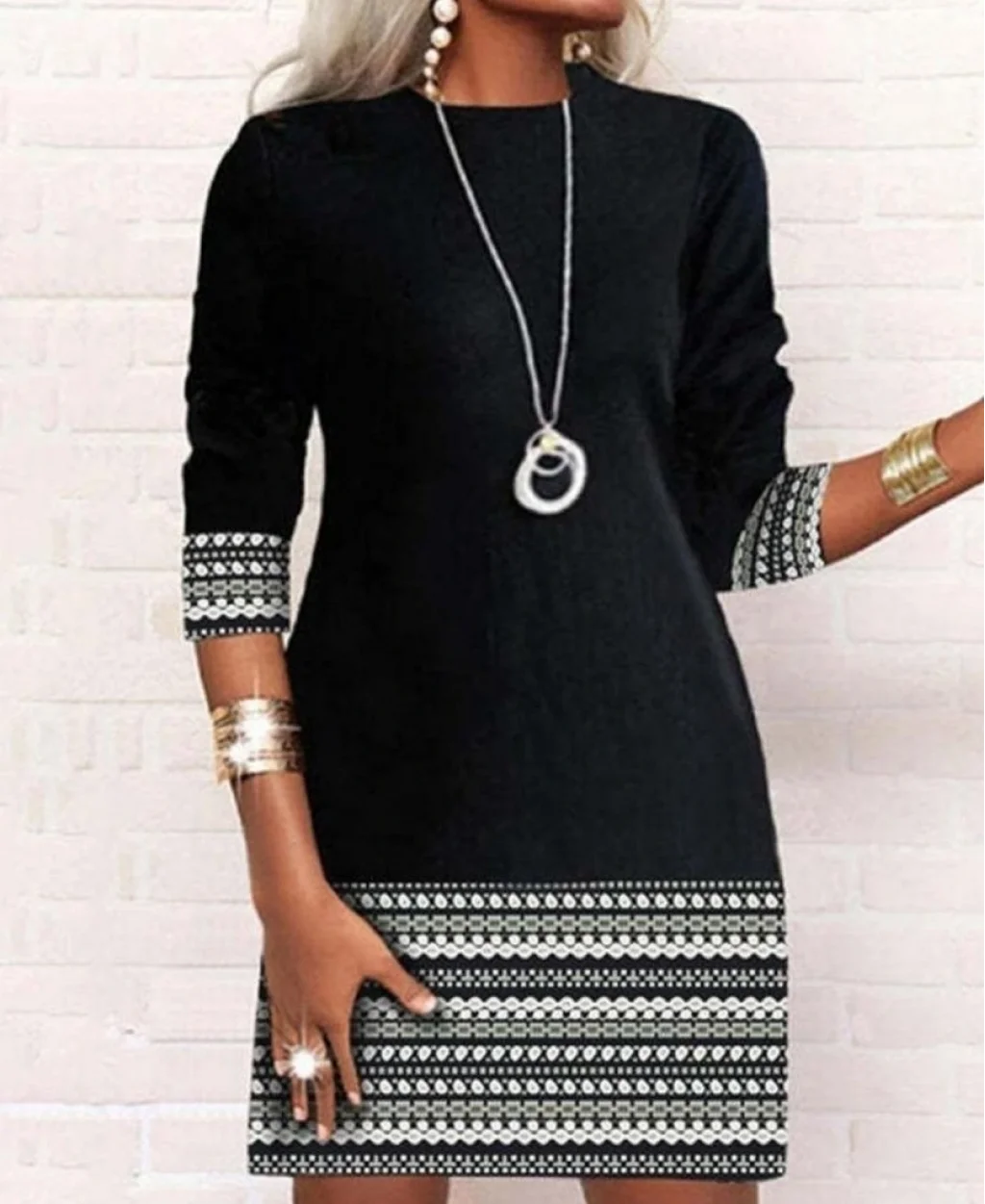 Kadın Uzun Kollu Bisiklet Yaka Kol Ağzı Ve Etek Ucu Baskılı Iki Iplik Elbise