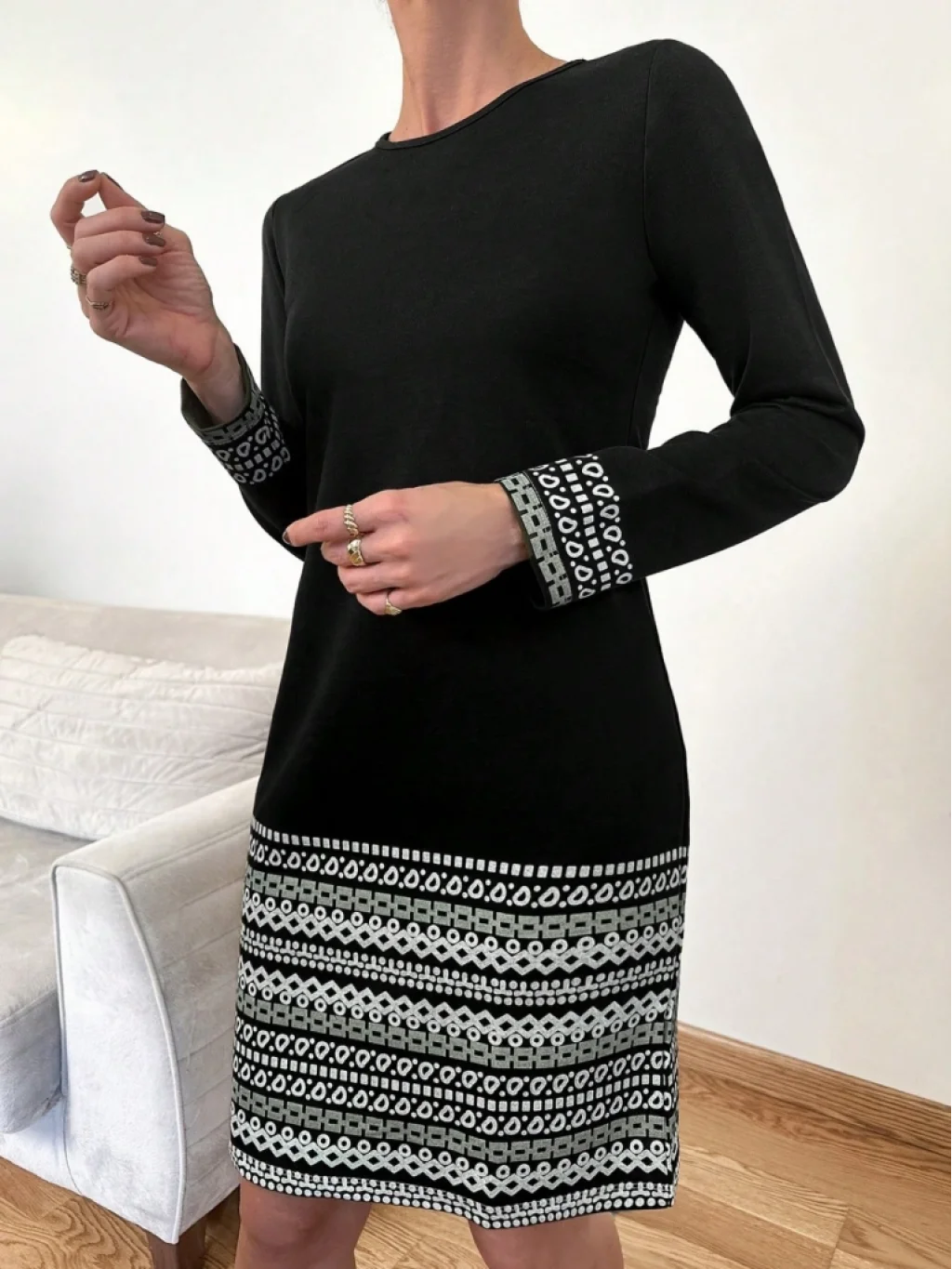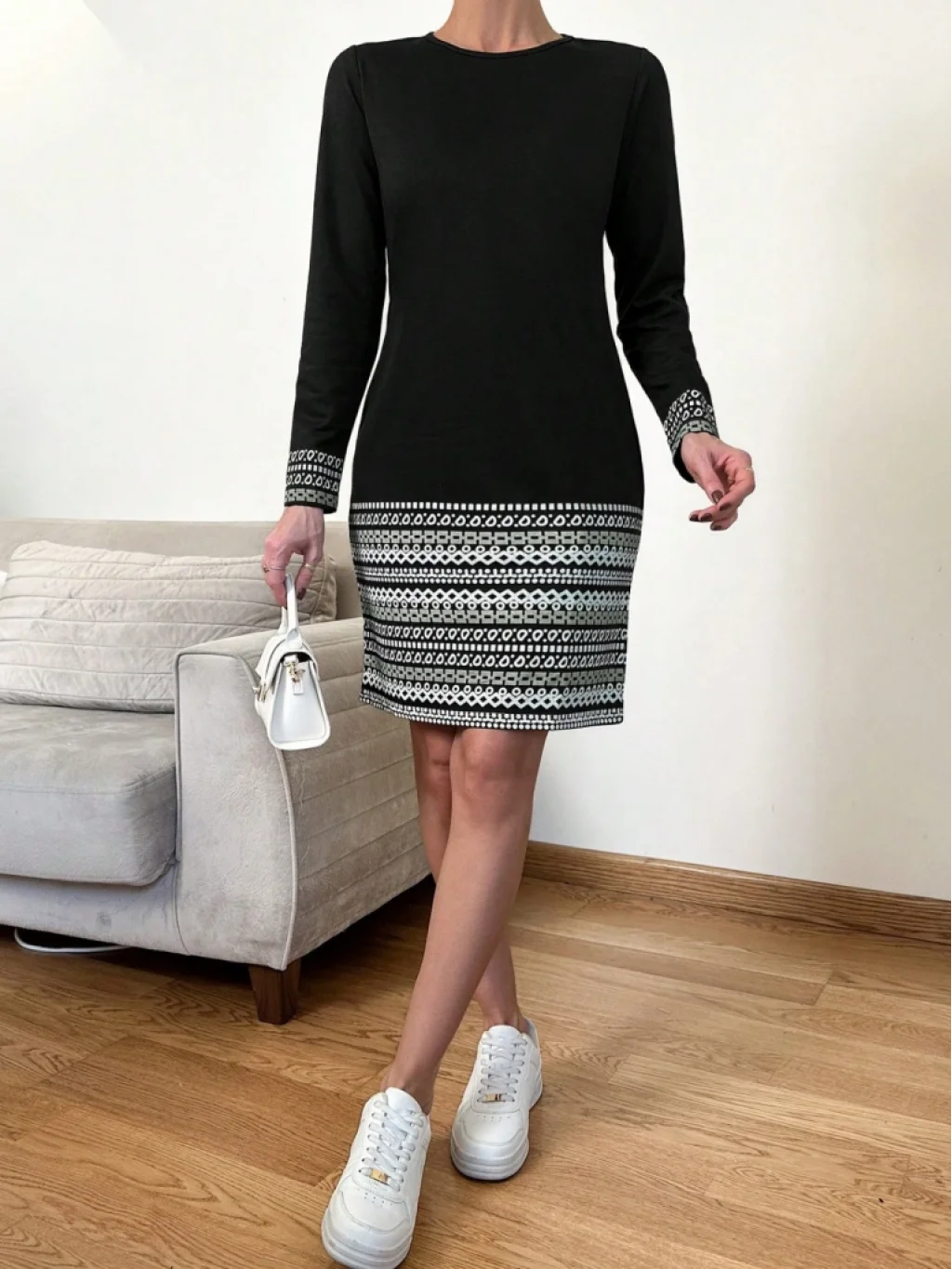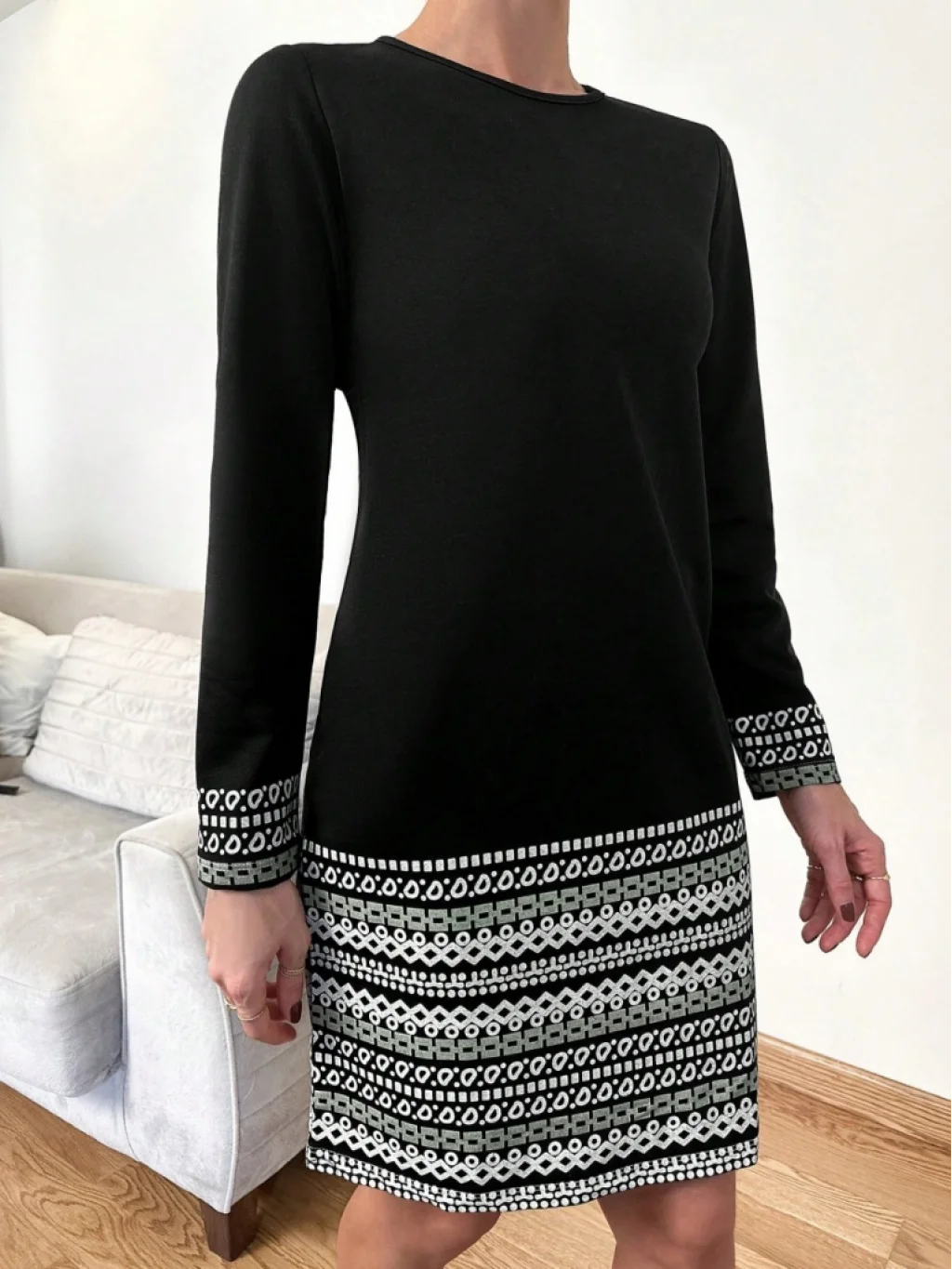 Kadın Uzun Kollu Bisiklet Yaka Kol Ağzı Ve Etek Ucu Baskılı Iki Iplik Elbise