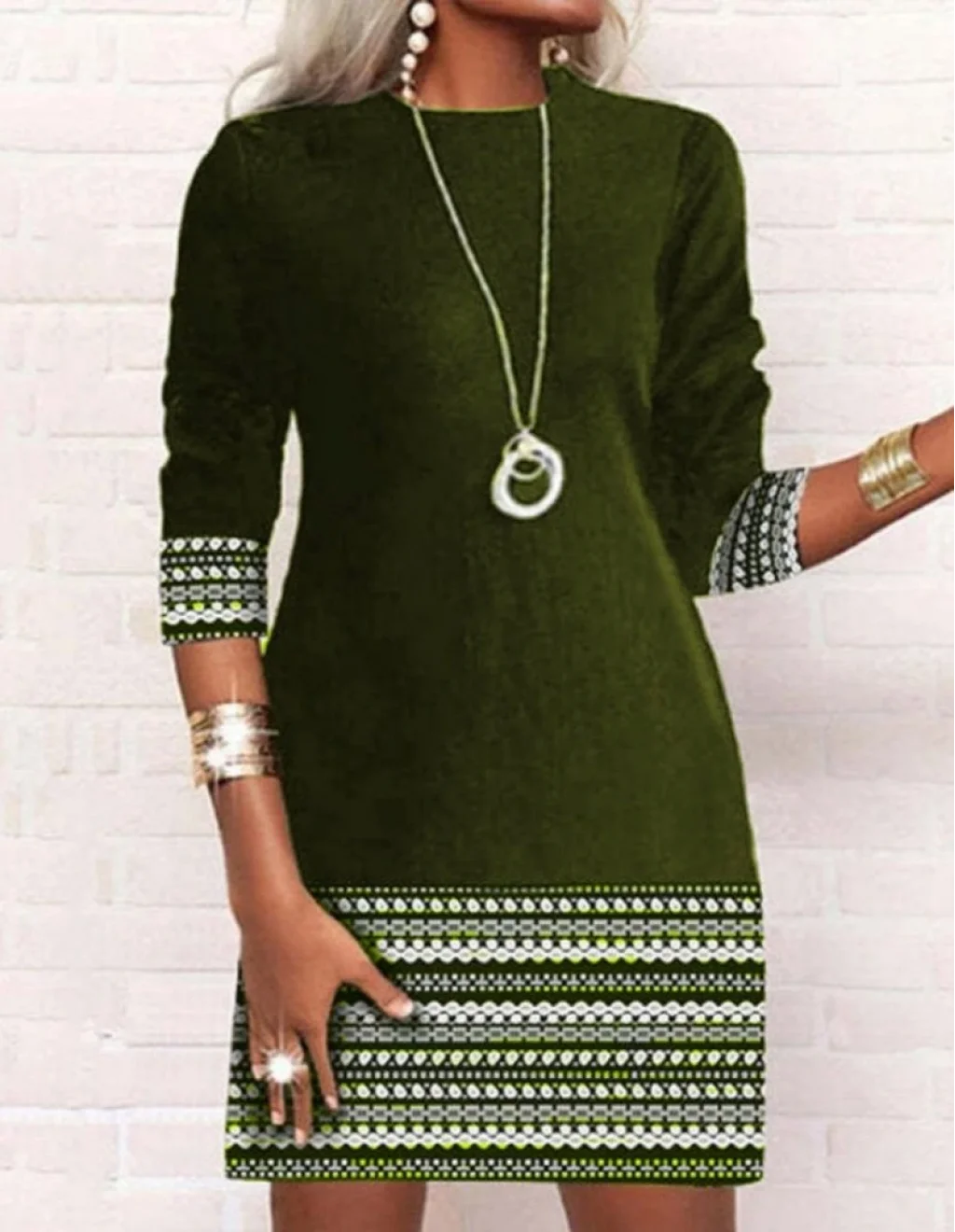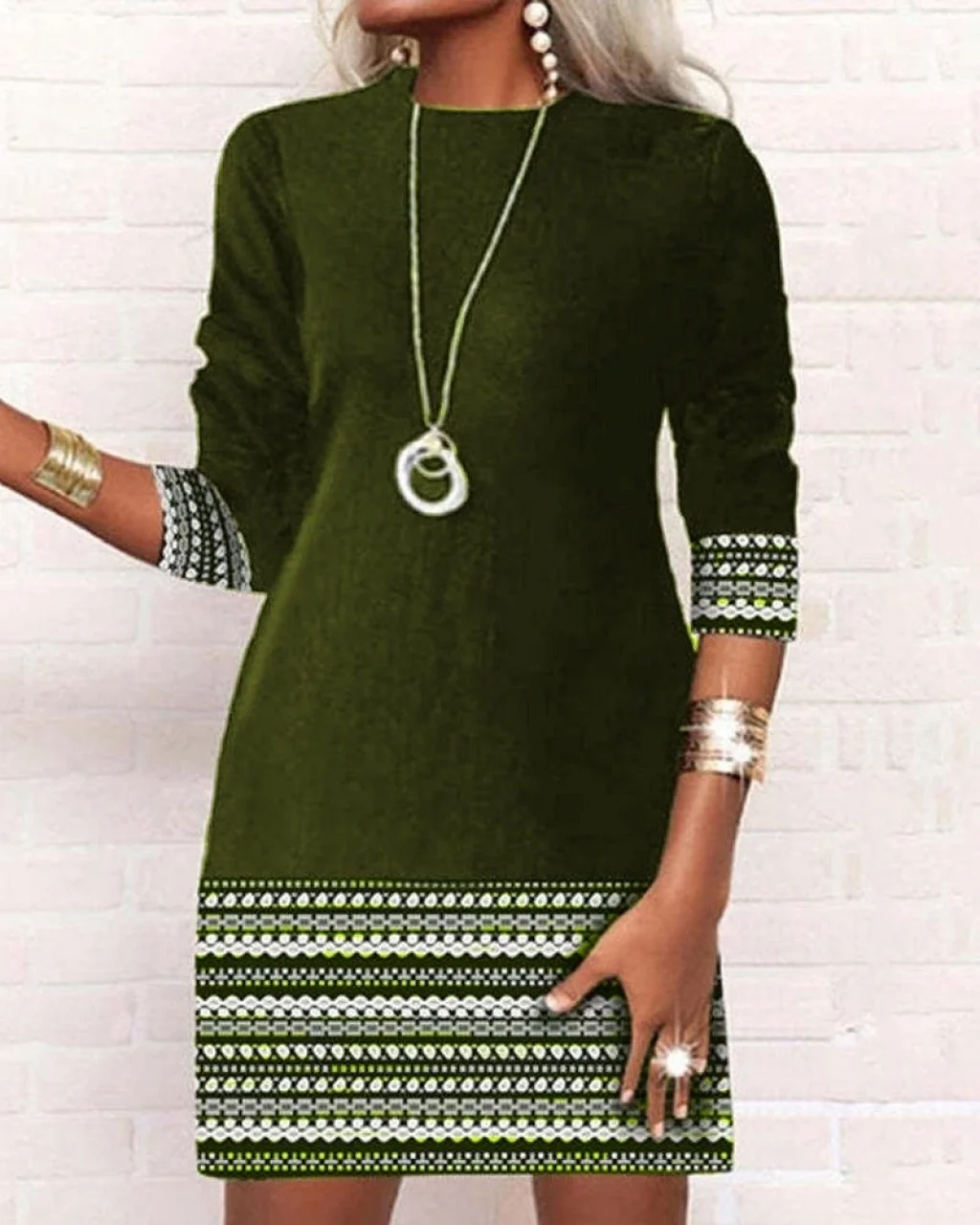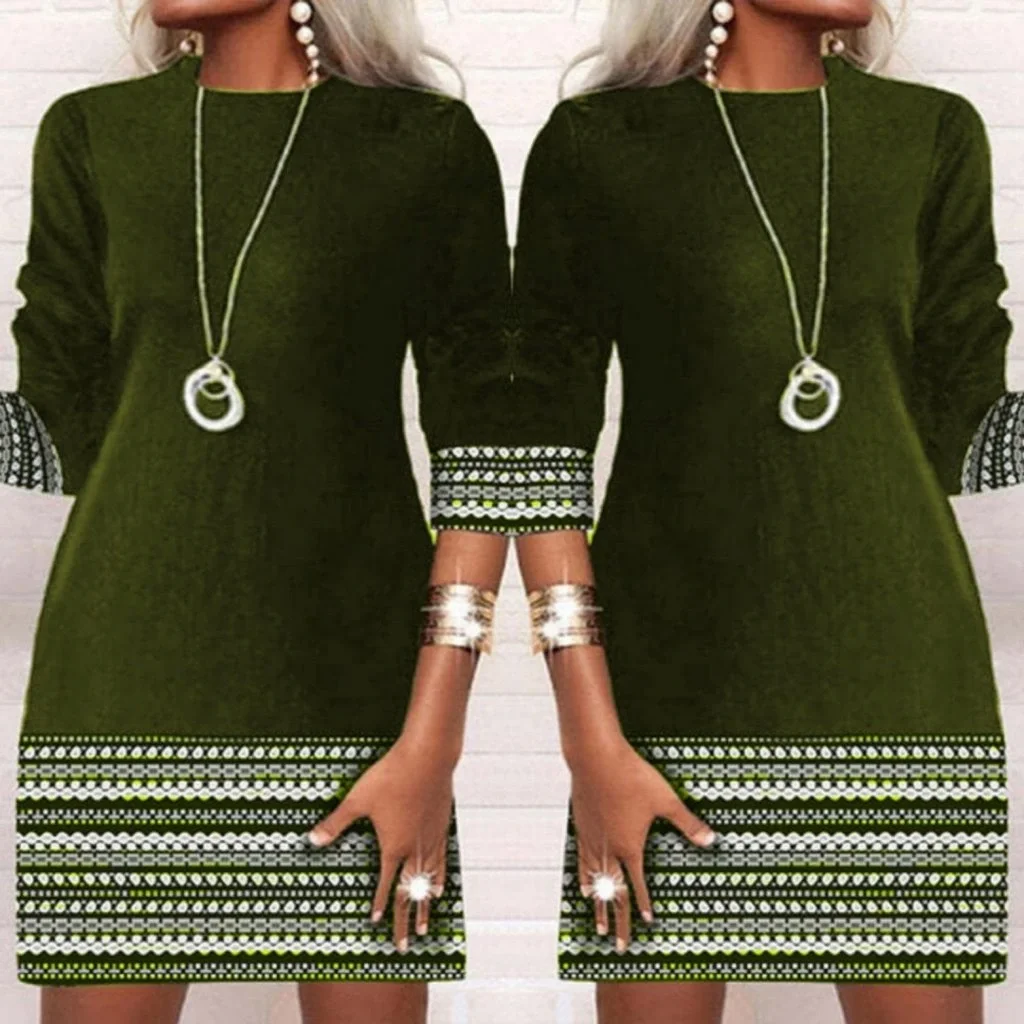 Kadın Uzun Kollu Bisiklet Yaka Kol Ağzı Ve Etek Ucu Baskılı Iki Iplik Elbise