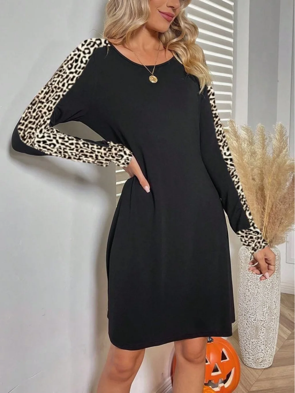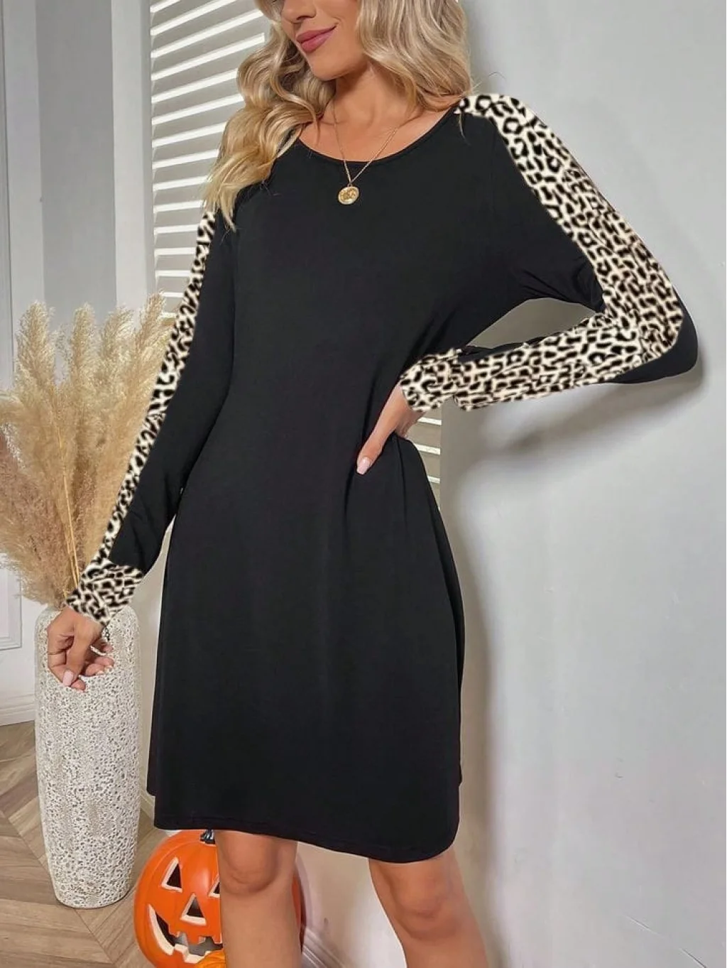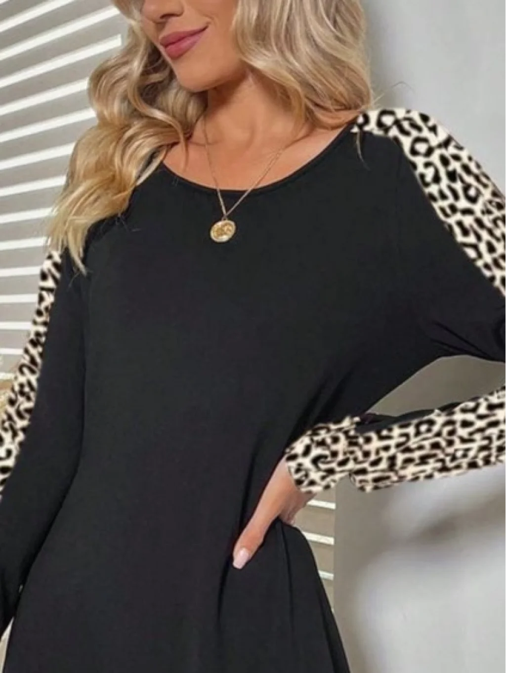 Kadın Uzun Kollu Bisiklet Yaka Kollar Leopar Detay Iki Iplik Mini Boy Elbise