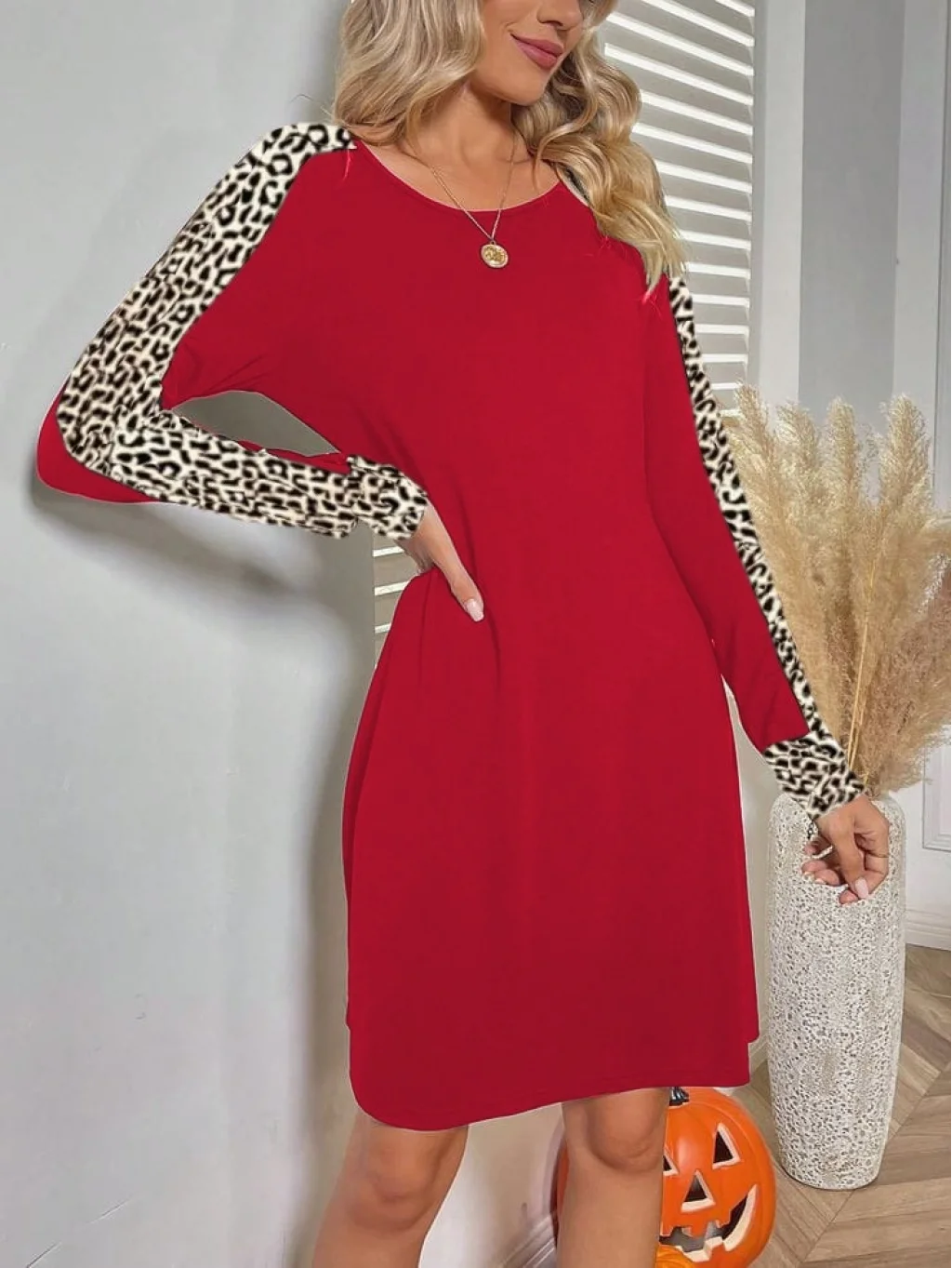 Kadın Uzun Kollu Bisiklet Yaka Kollar Leopar Detay Iki Iplik Mini Boy Elbise