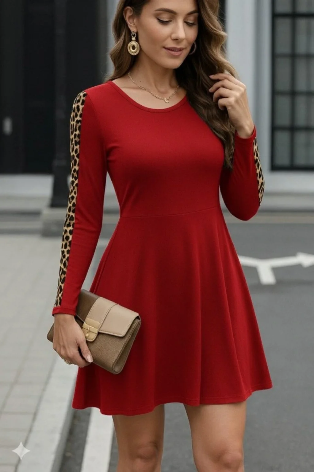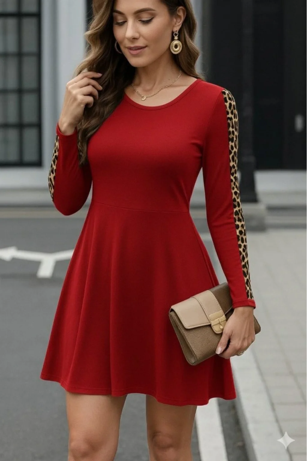 Kadın Uzun Kollu Bisiklet Yaka Kollar Leopar Detay Iki Iplik Mini Boy Elbise
