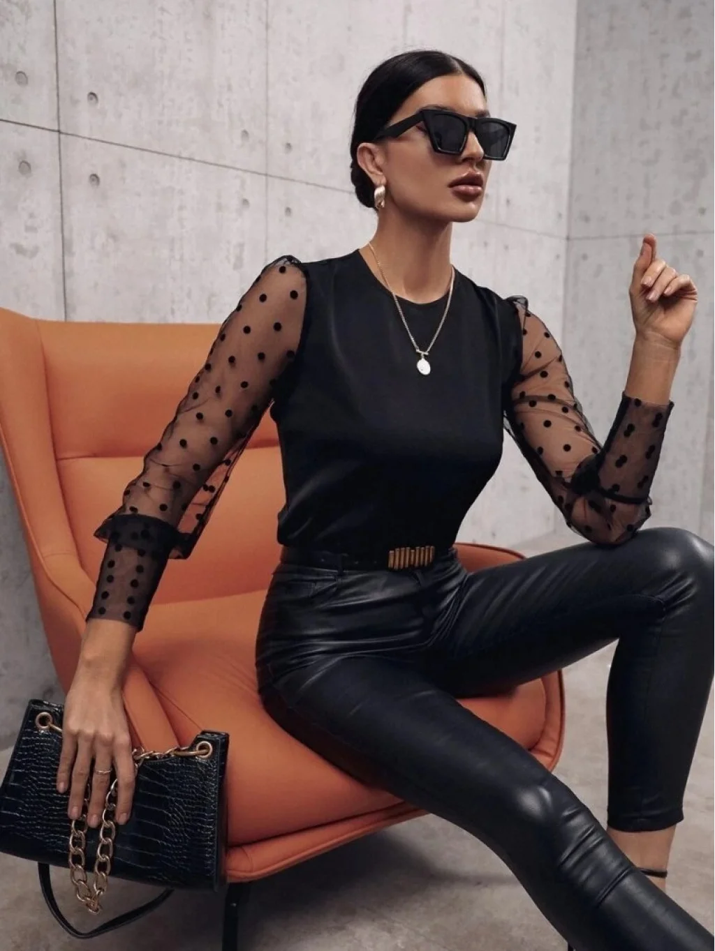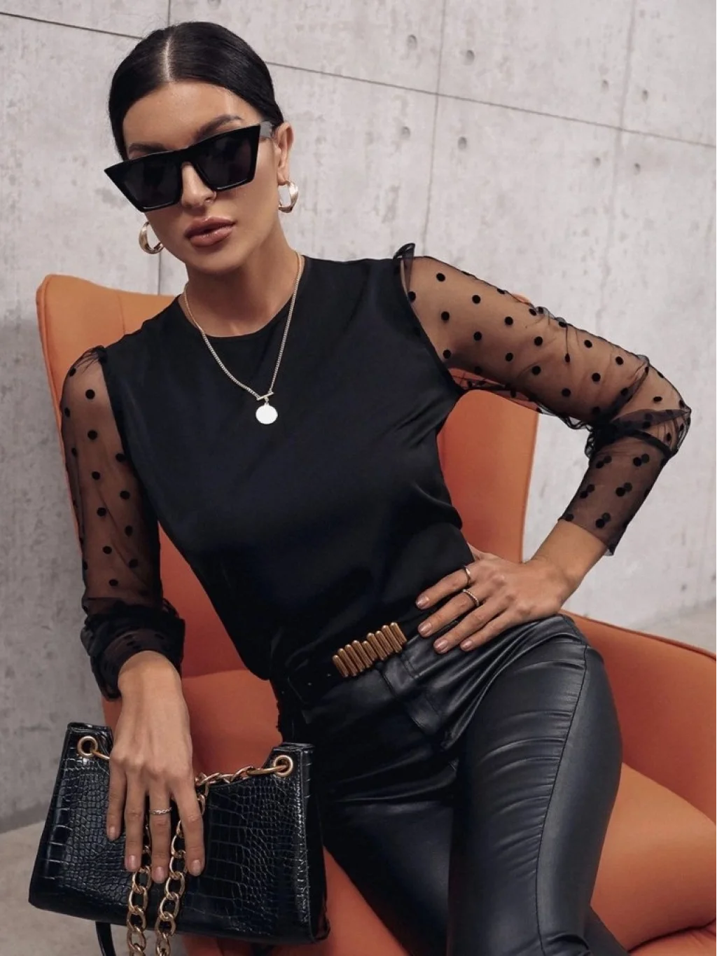 Kadın Uzun Kollu Bisiklet Yaka Kollar Puantiyeli Tül Detaylı Sandy Bluz