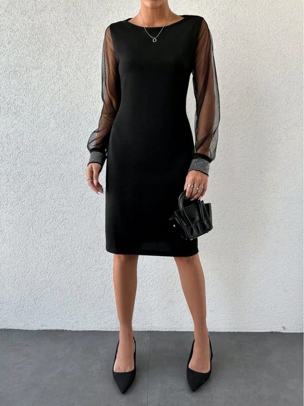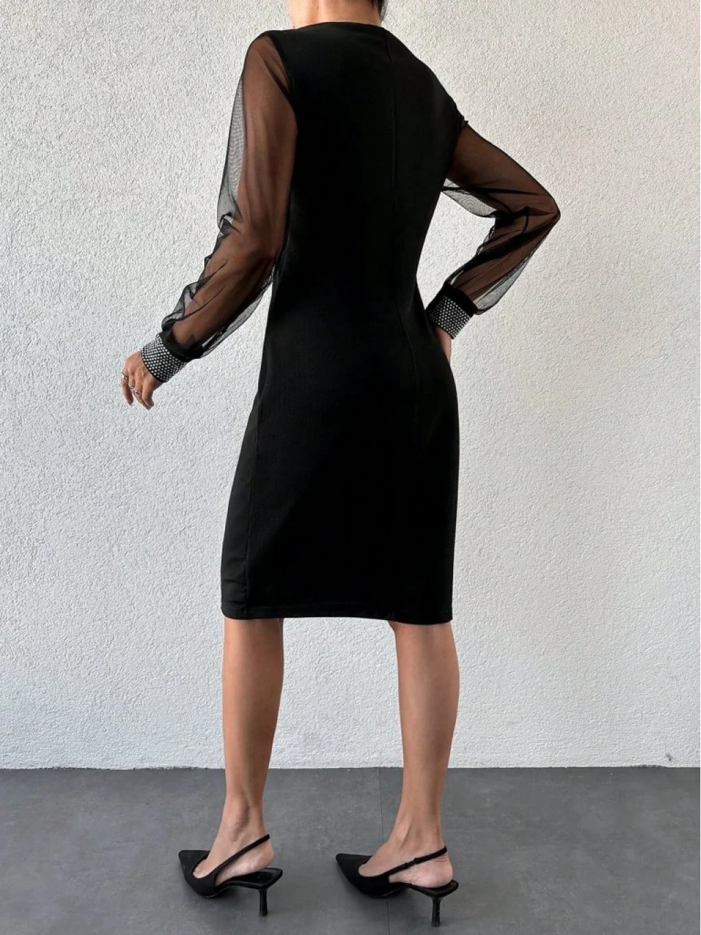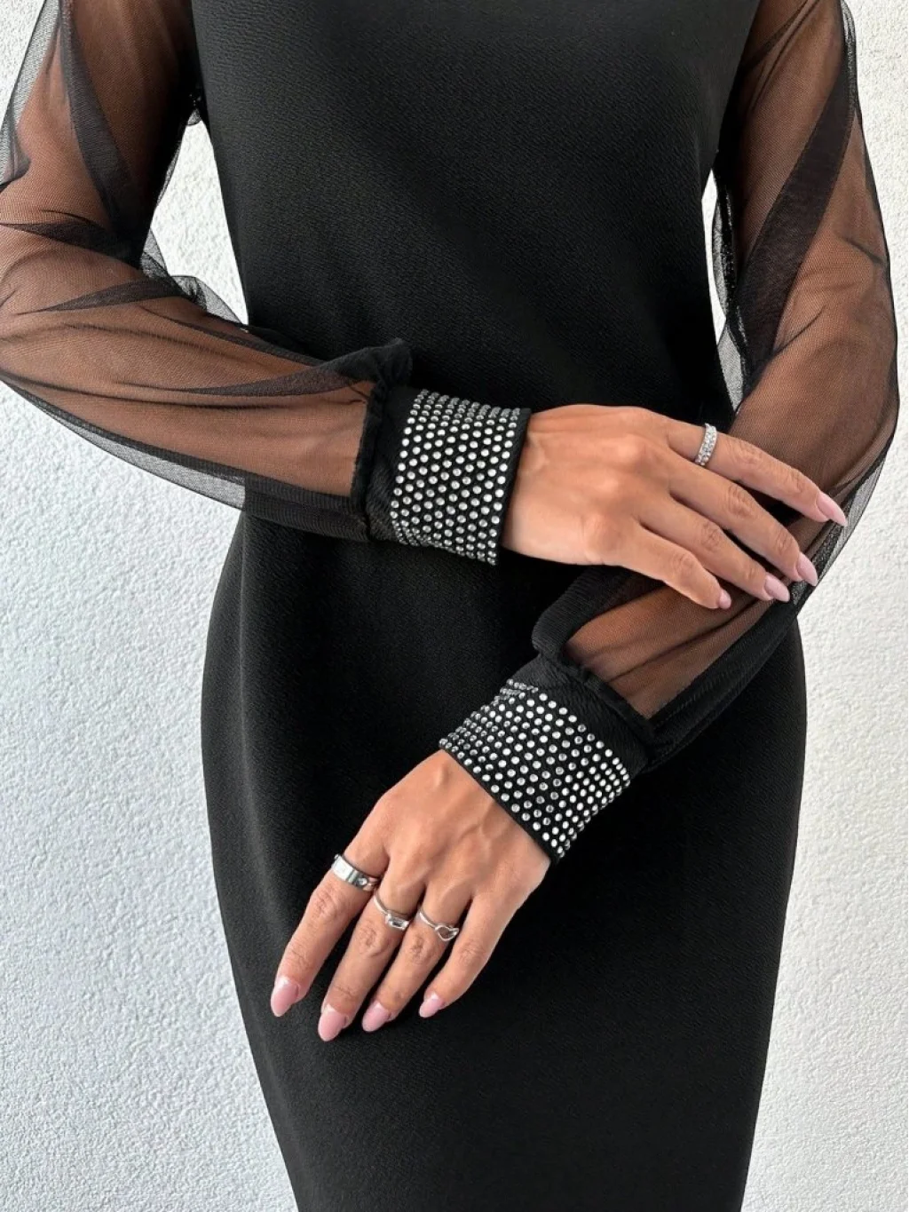 Kadın Uzun Kollu Bisiklet Yaka Kollar Tül Manşet Taş Işlemeli Krep Elbise