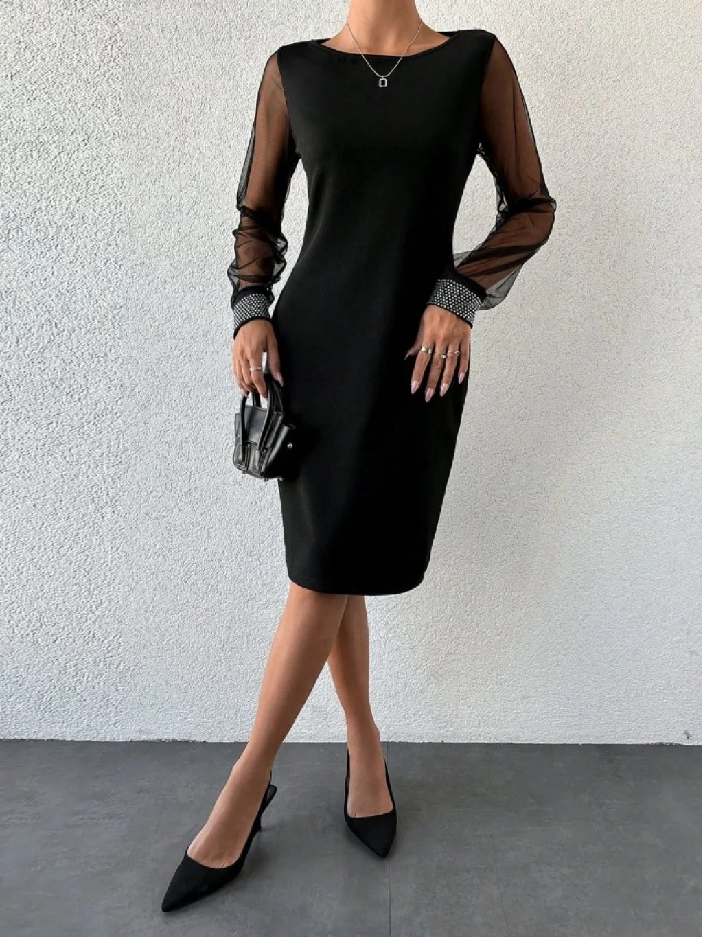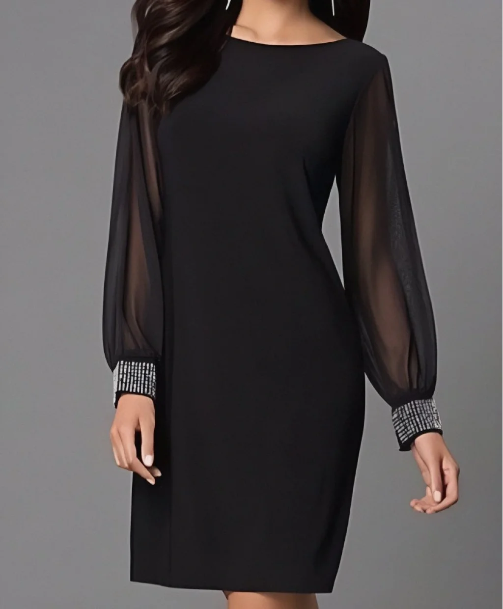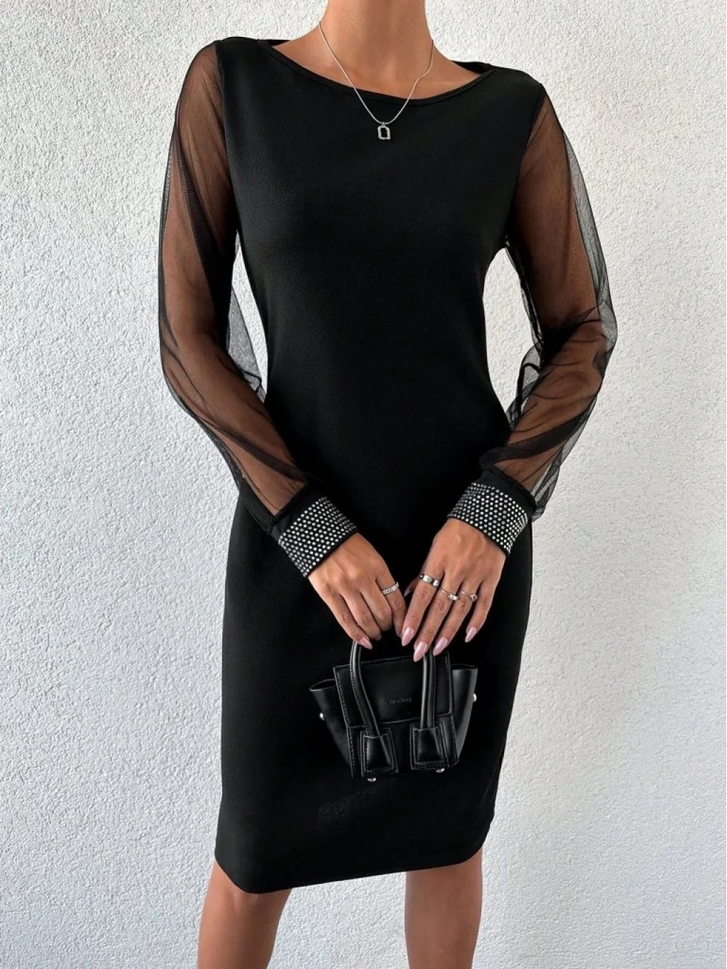 Kadın Uzun Kollu Bisiklet Yaka Kollar Tül Manşet Taş Işlemeli Krep Elbise