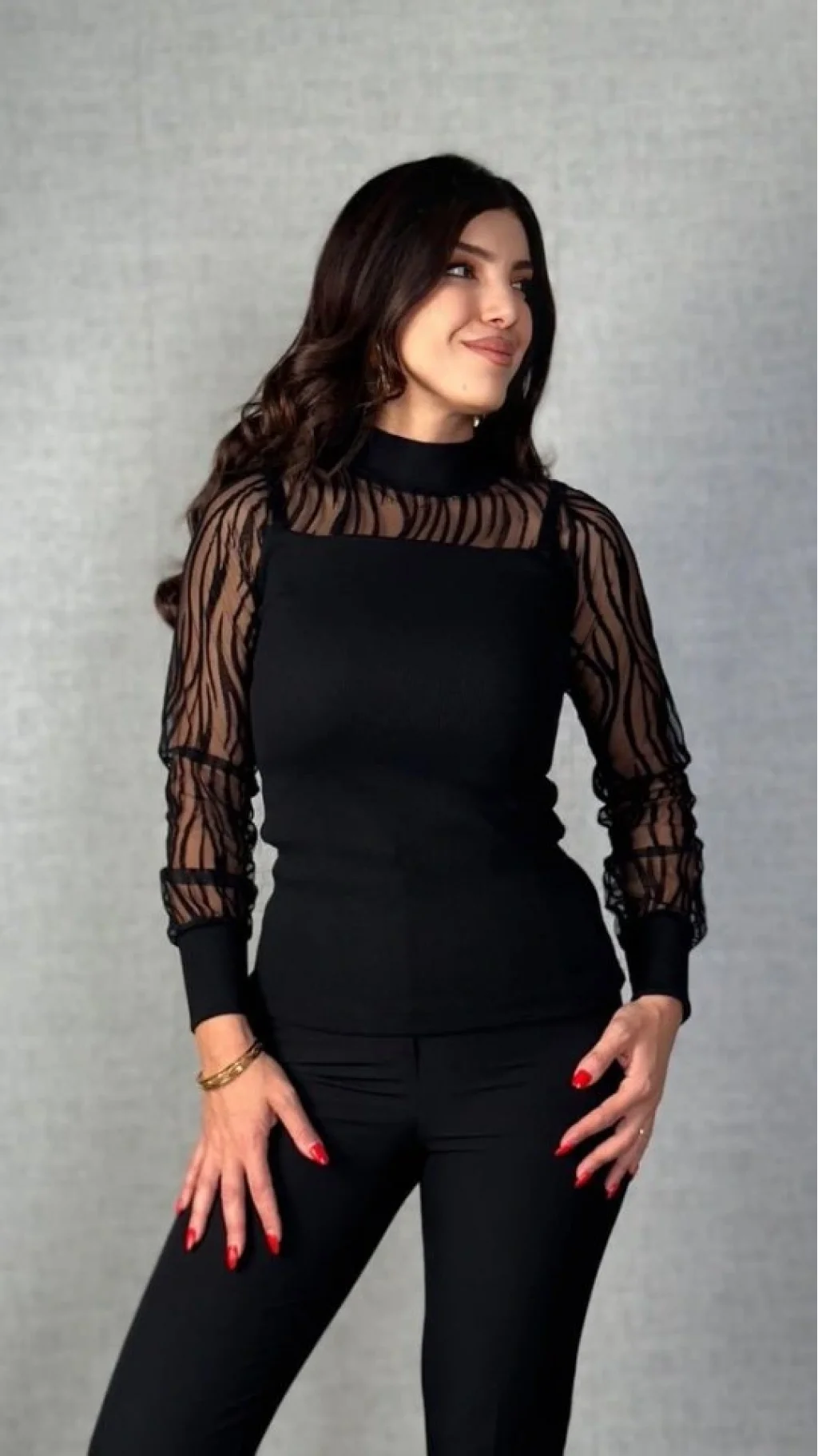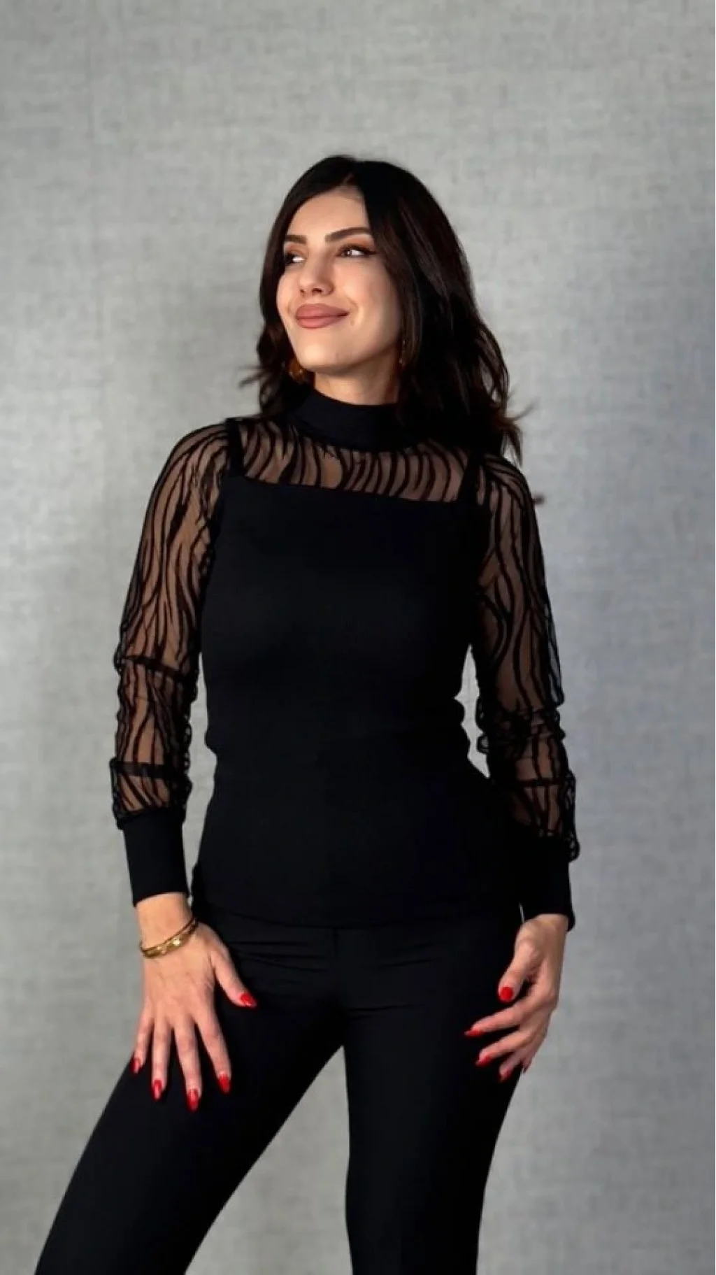 Kadın Uzun Kollu Bisiklet Yaka Kolları Tül Detay Kaşkorse Kumaş Bluz