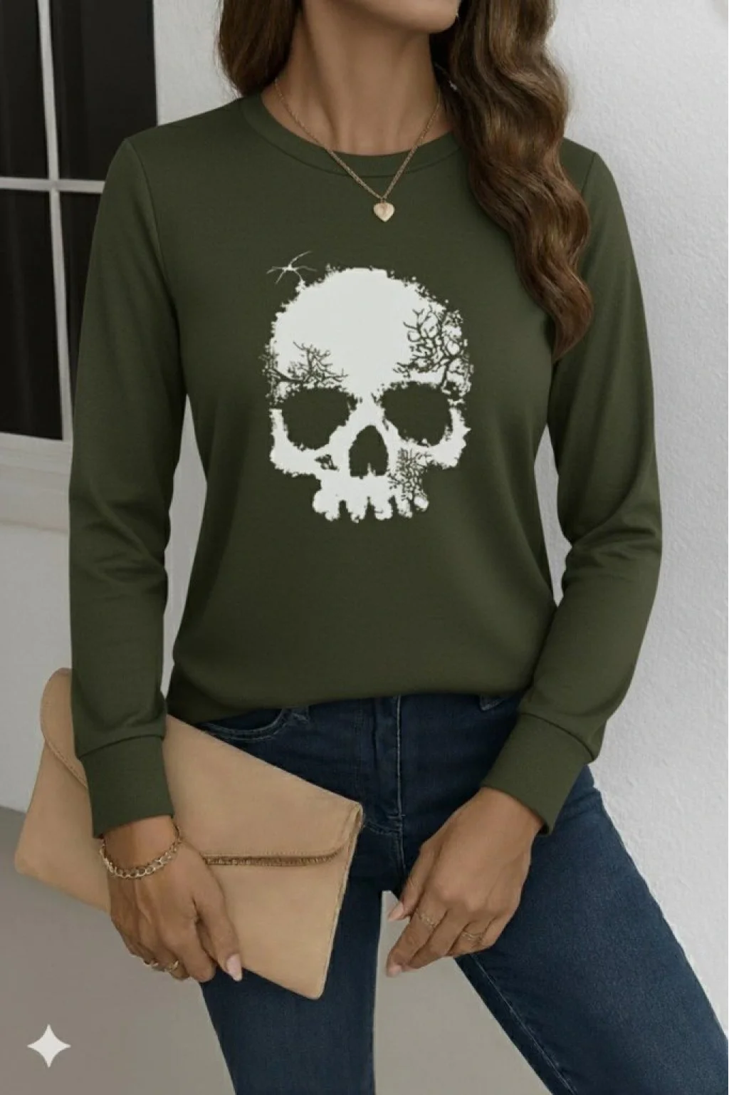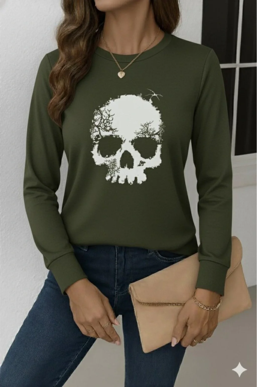 Kadın Uzun Kollu Bisiklet Yaka Kurukafa Desenli Viskon Bluz