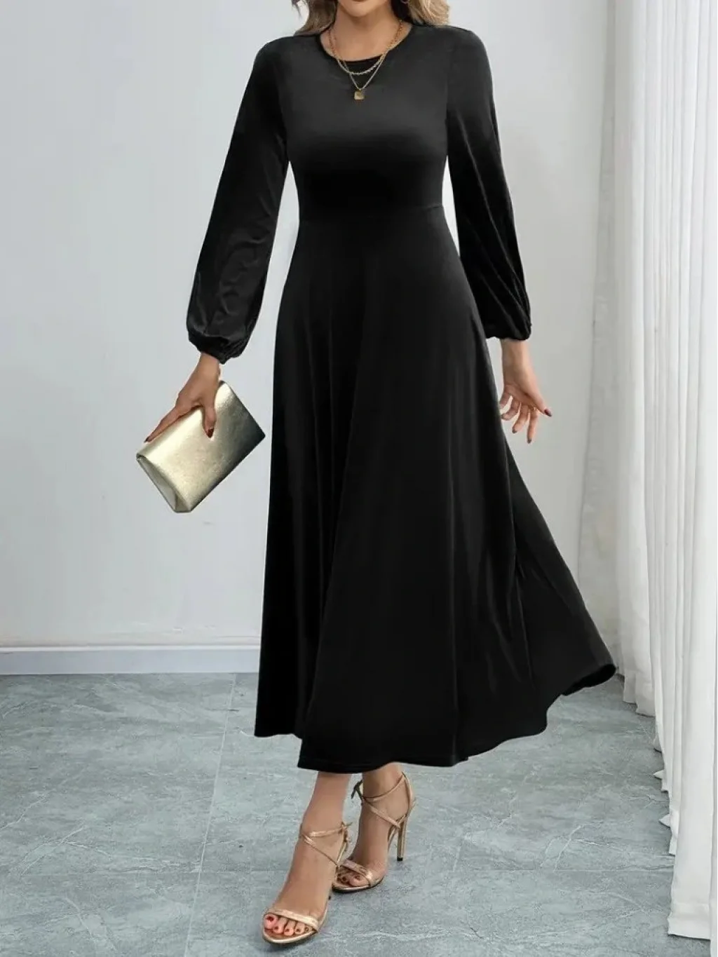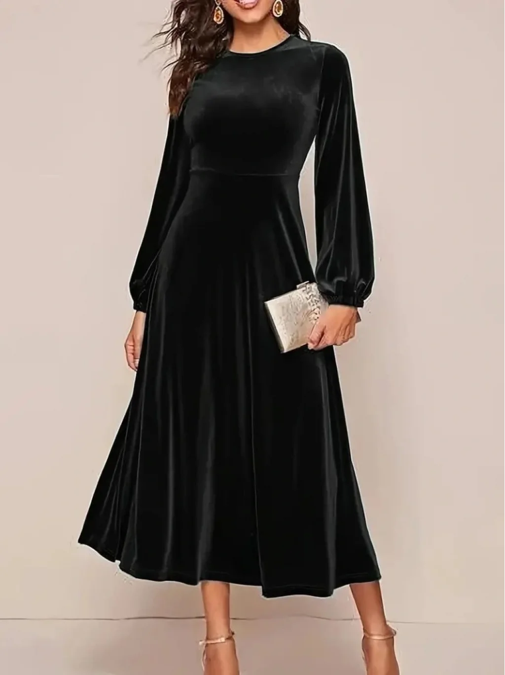 Kadın Uzun Kollu Bisiklet Yaka Midi Kadife Elbise