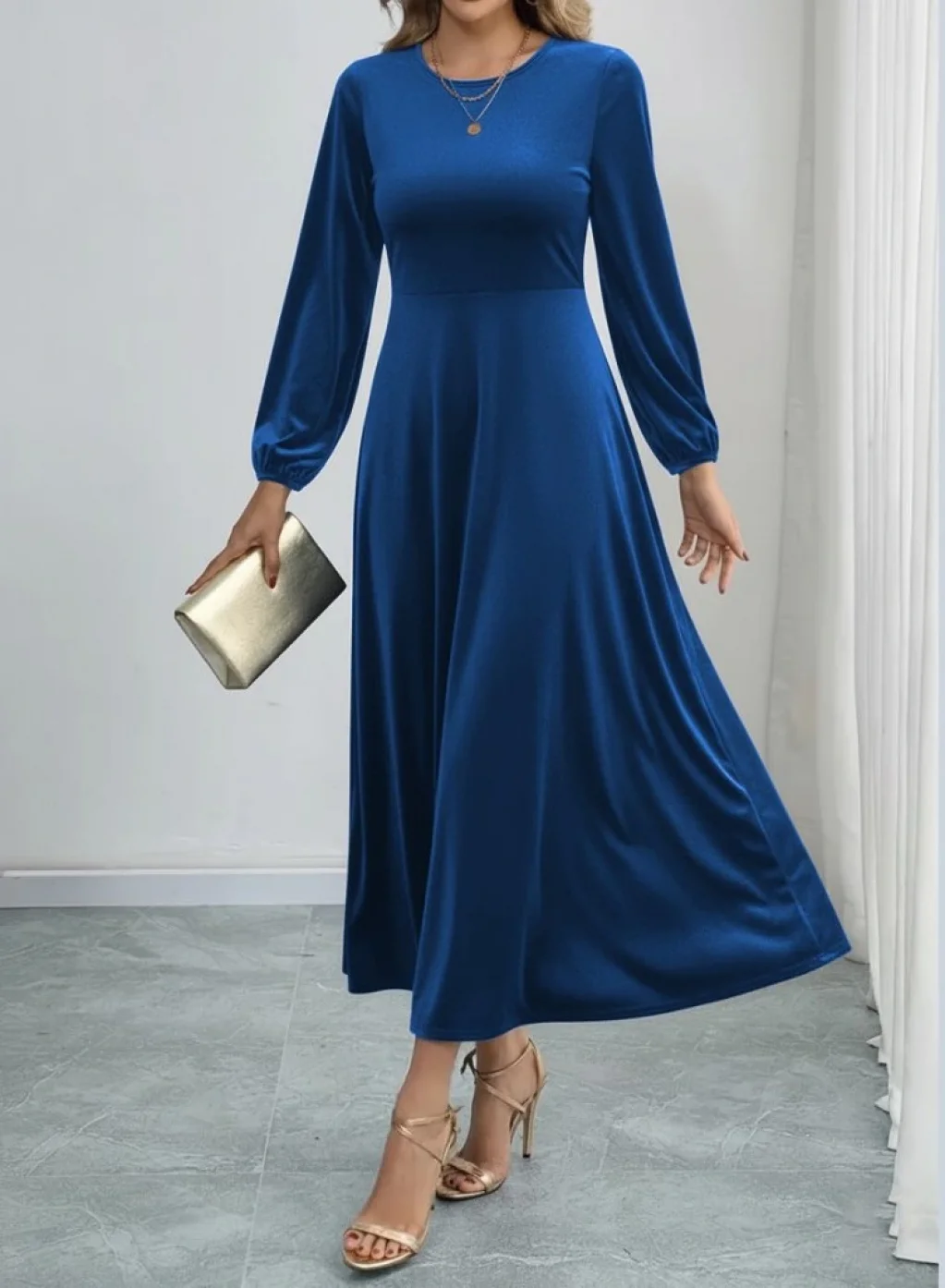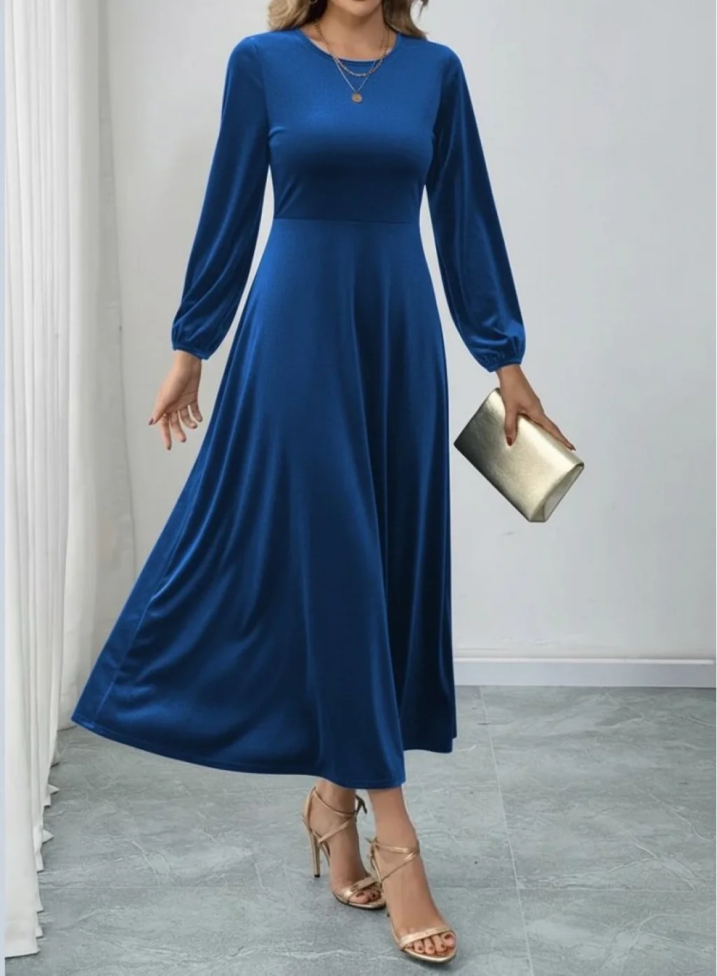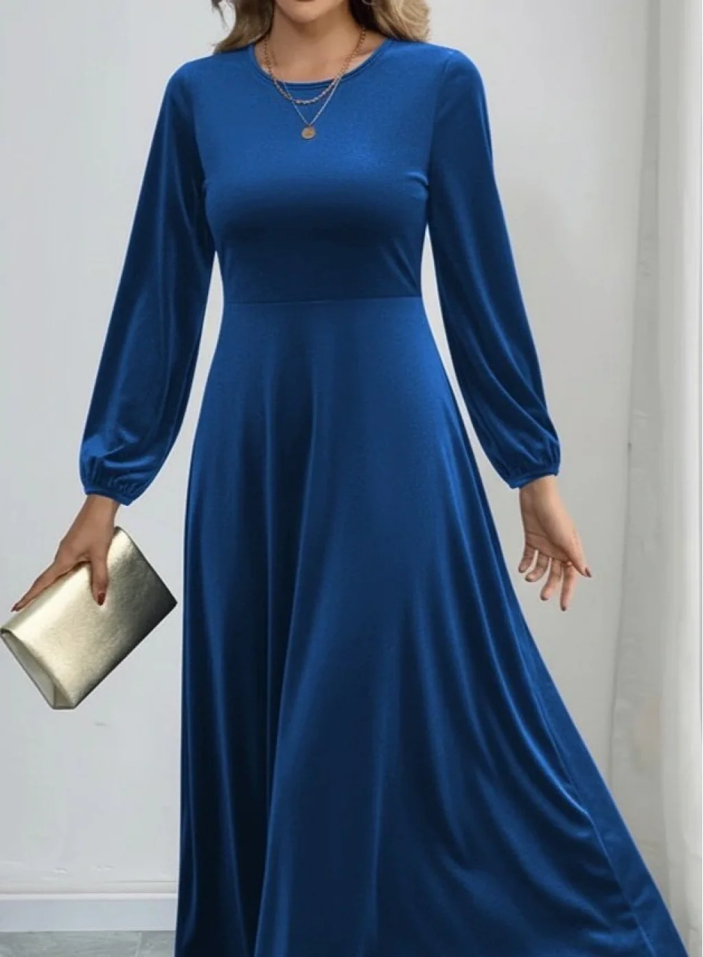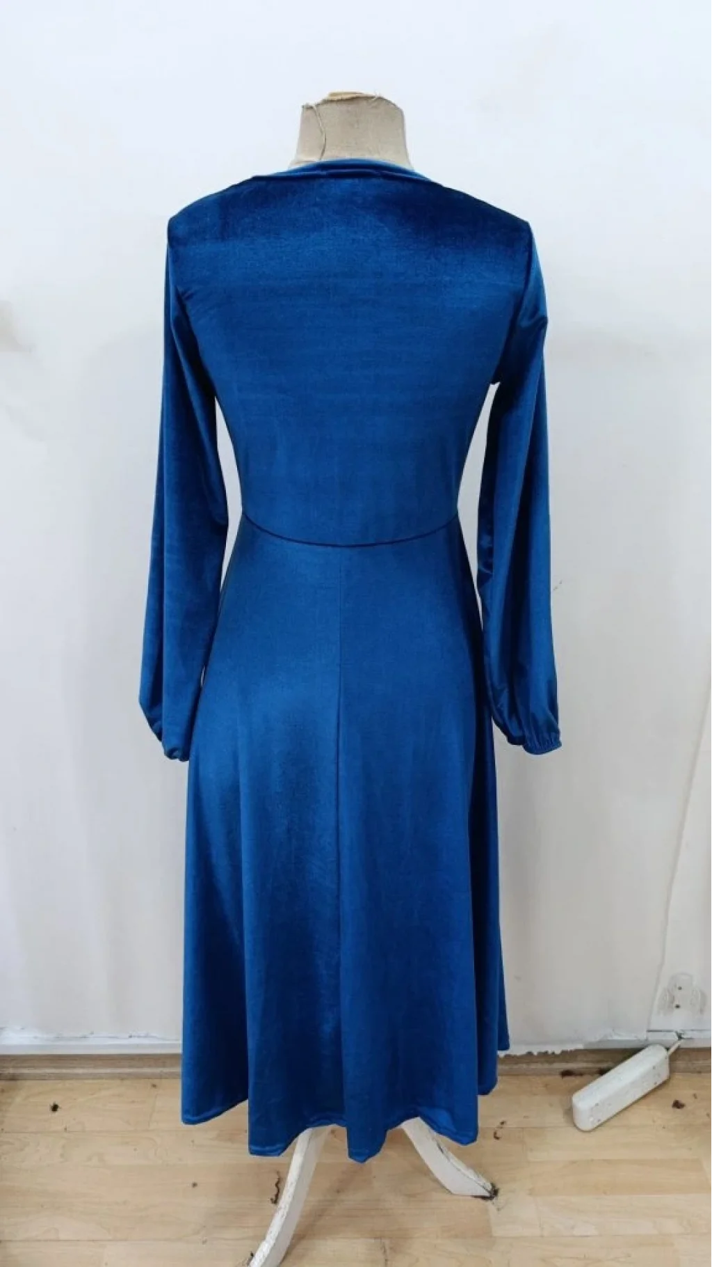 Kadın Uzun Kollu Bisiklet Yaka Midi Kadife Mavi Elbise