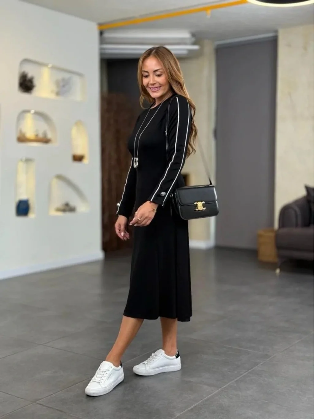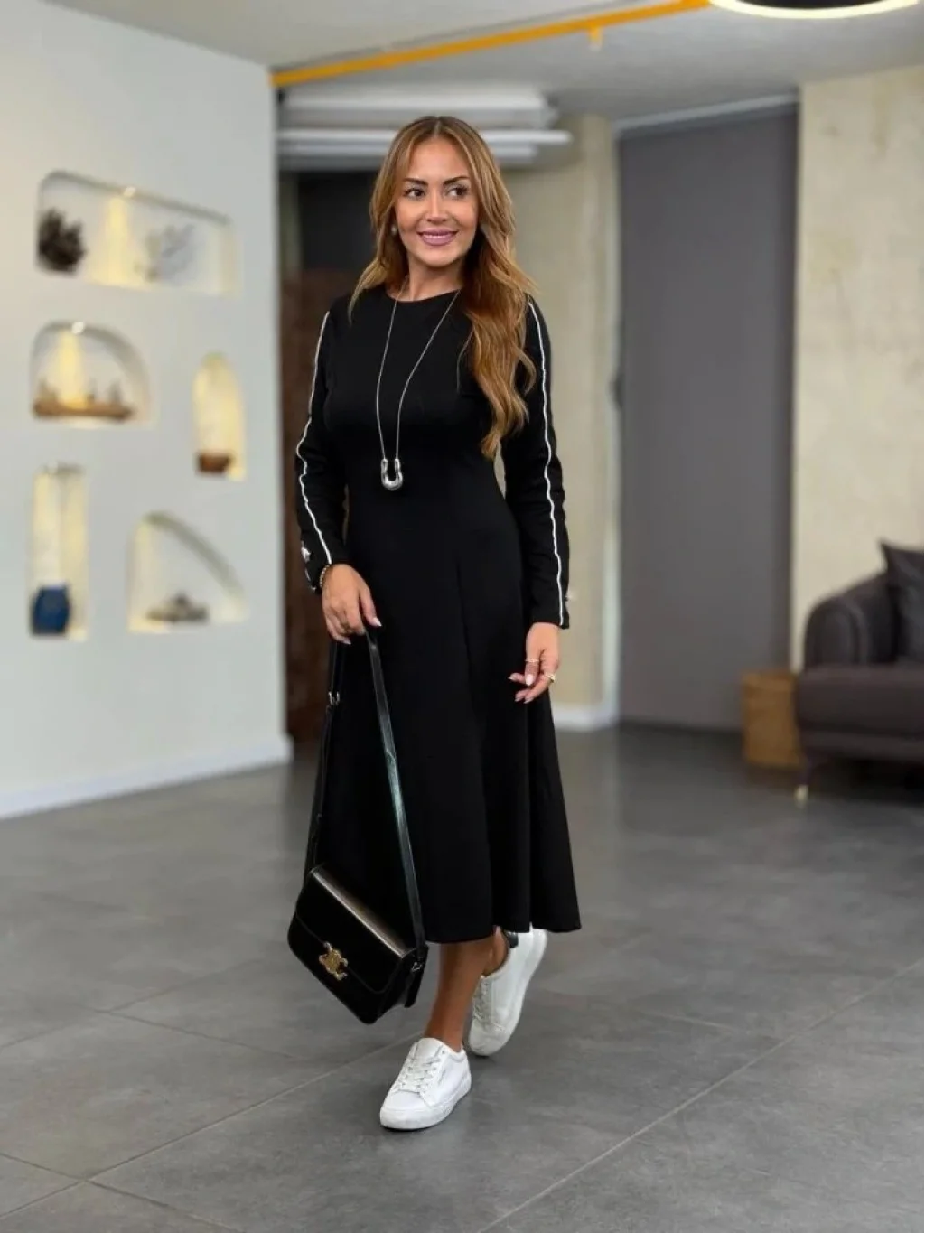 Kadın Uzun Kollu Bisiklet Yaka Midi Modal Elbise