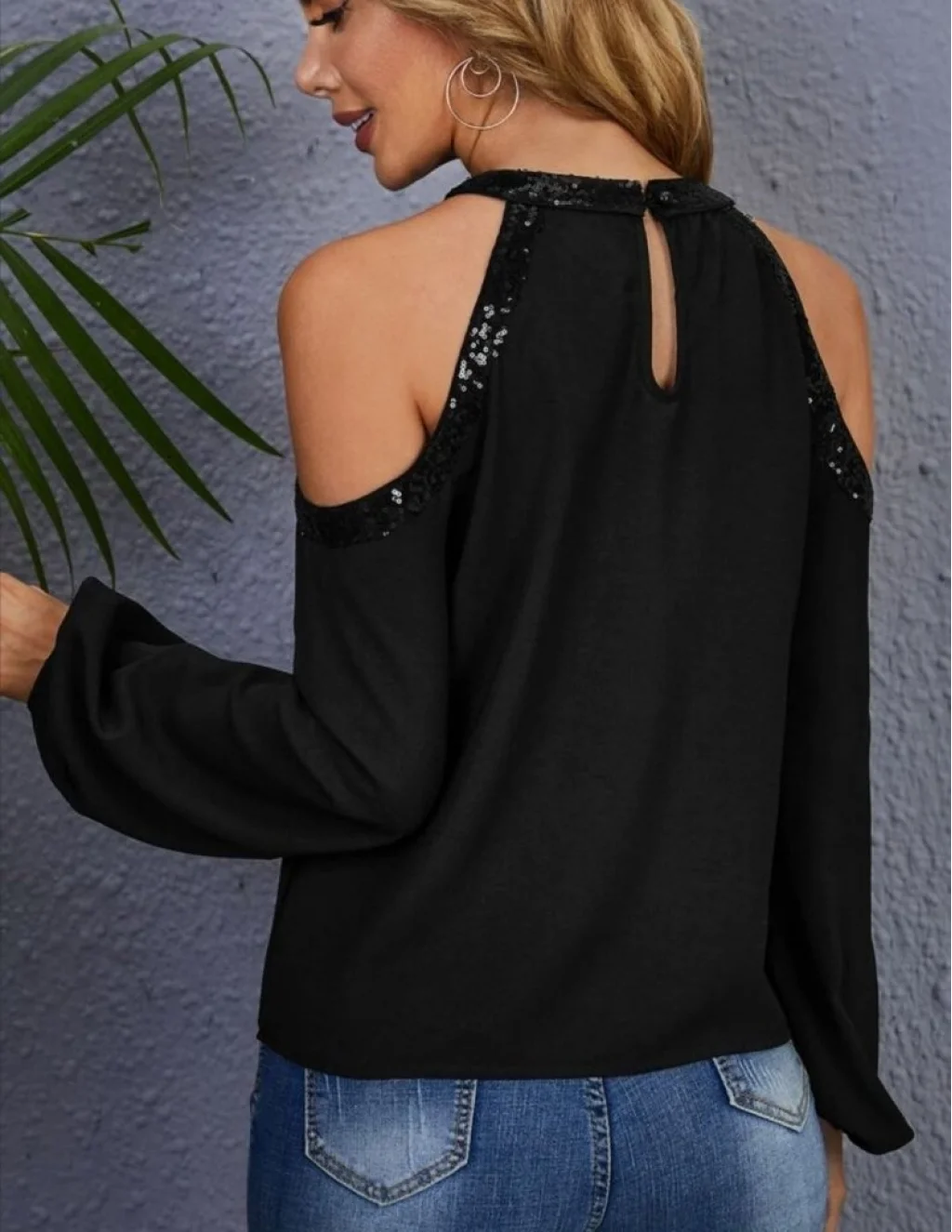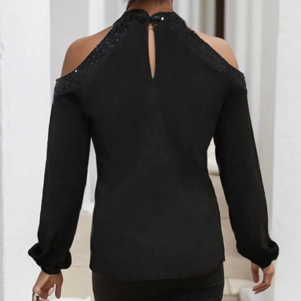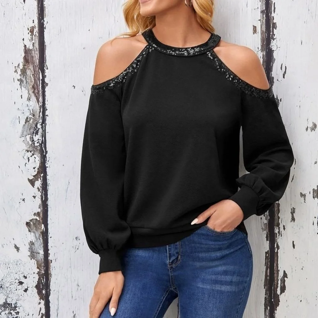 Kadın Uzun Kollu Bisiklet Yaka Omuz Açık Detaylı Krep Bluz