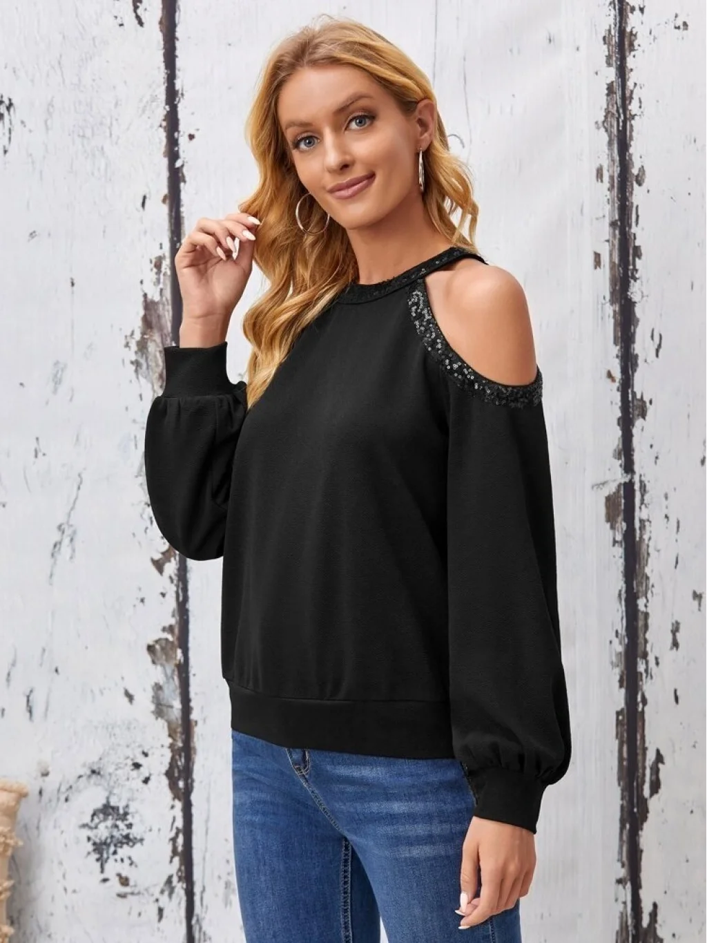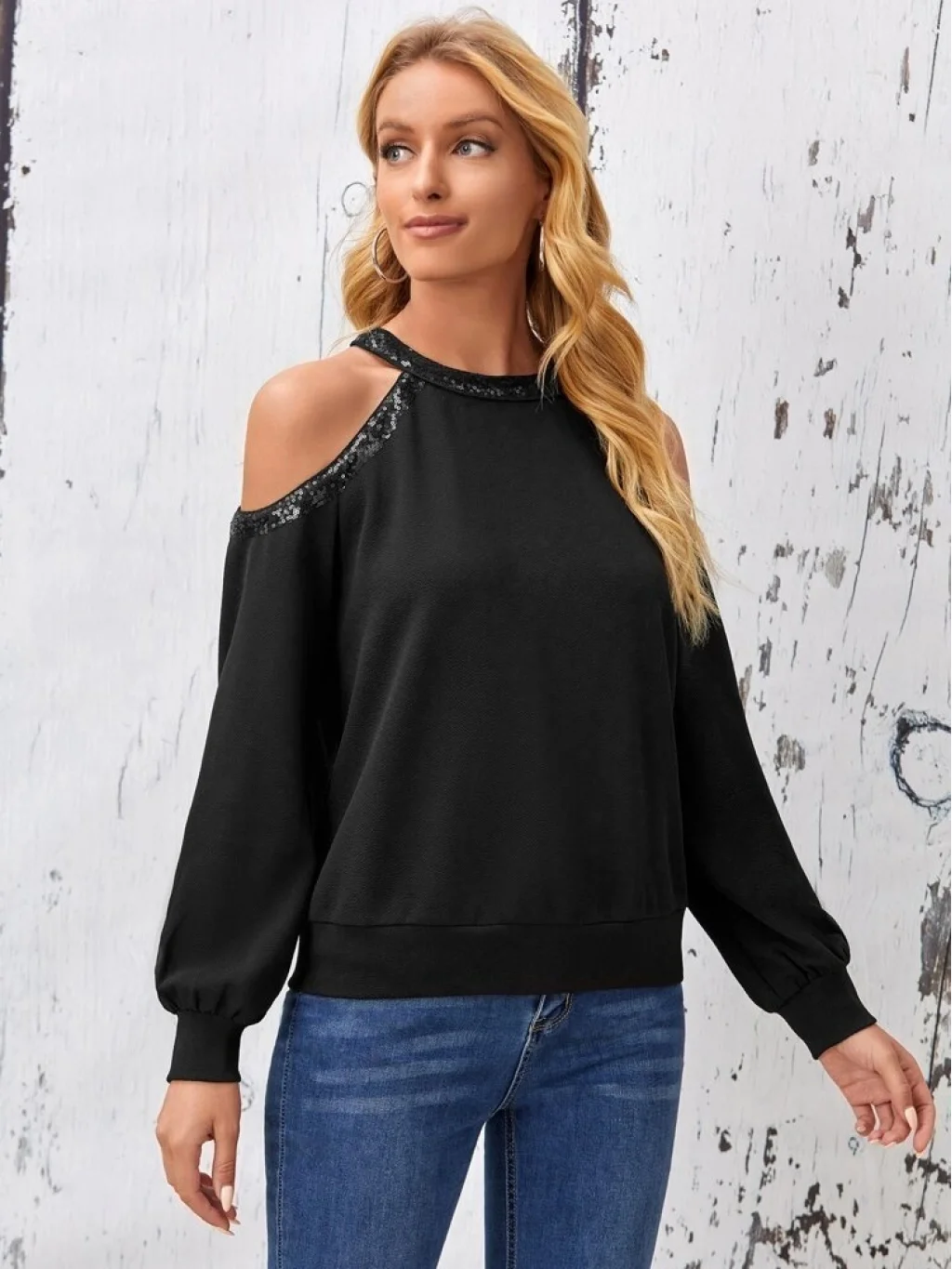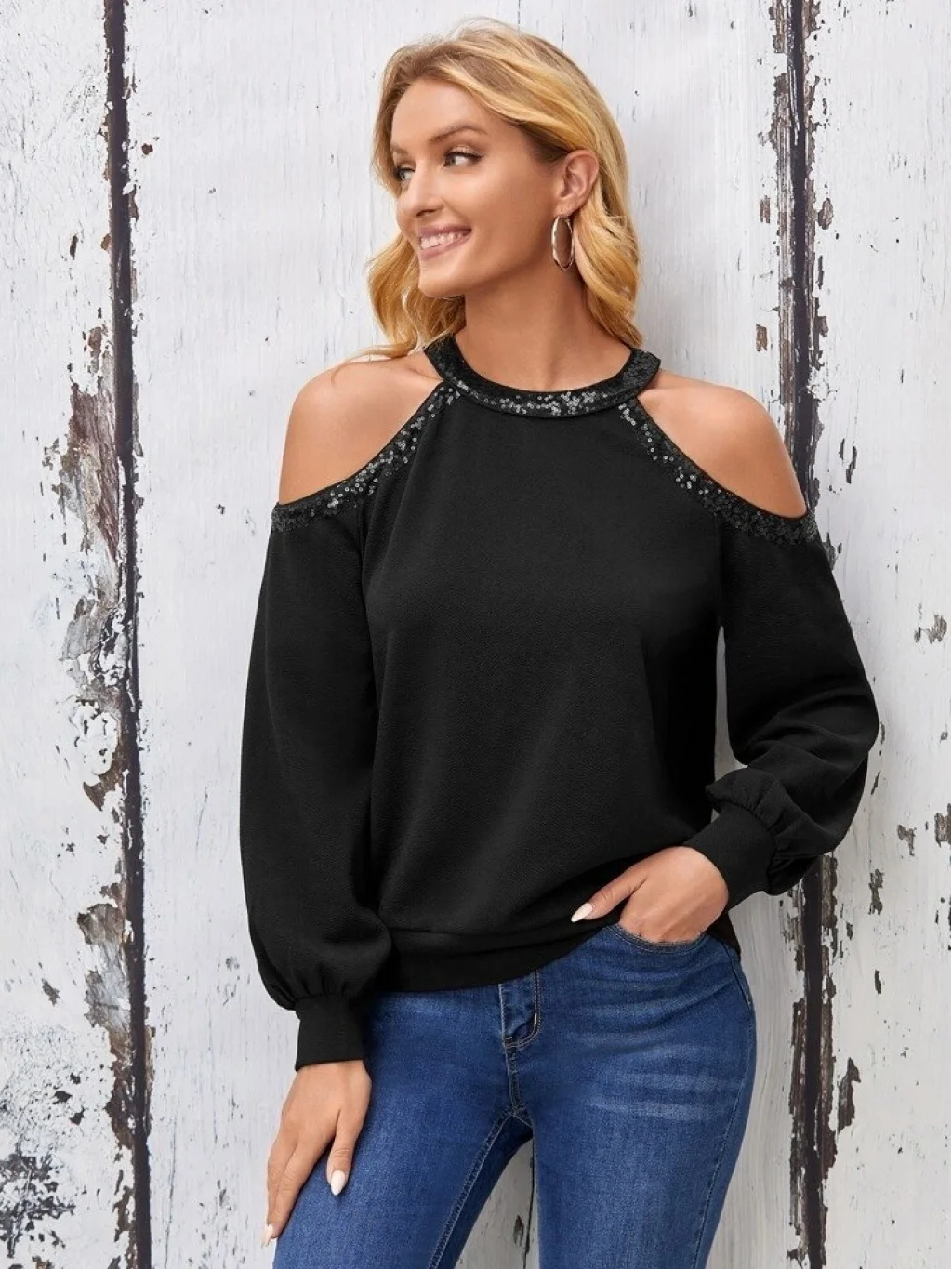 Kadın Uzun Kollu Bisiklet Yaka Omuz Açık Detaylı Krep Bluz