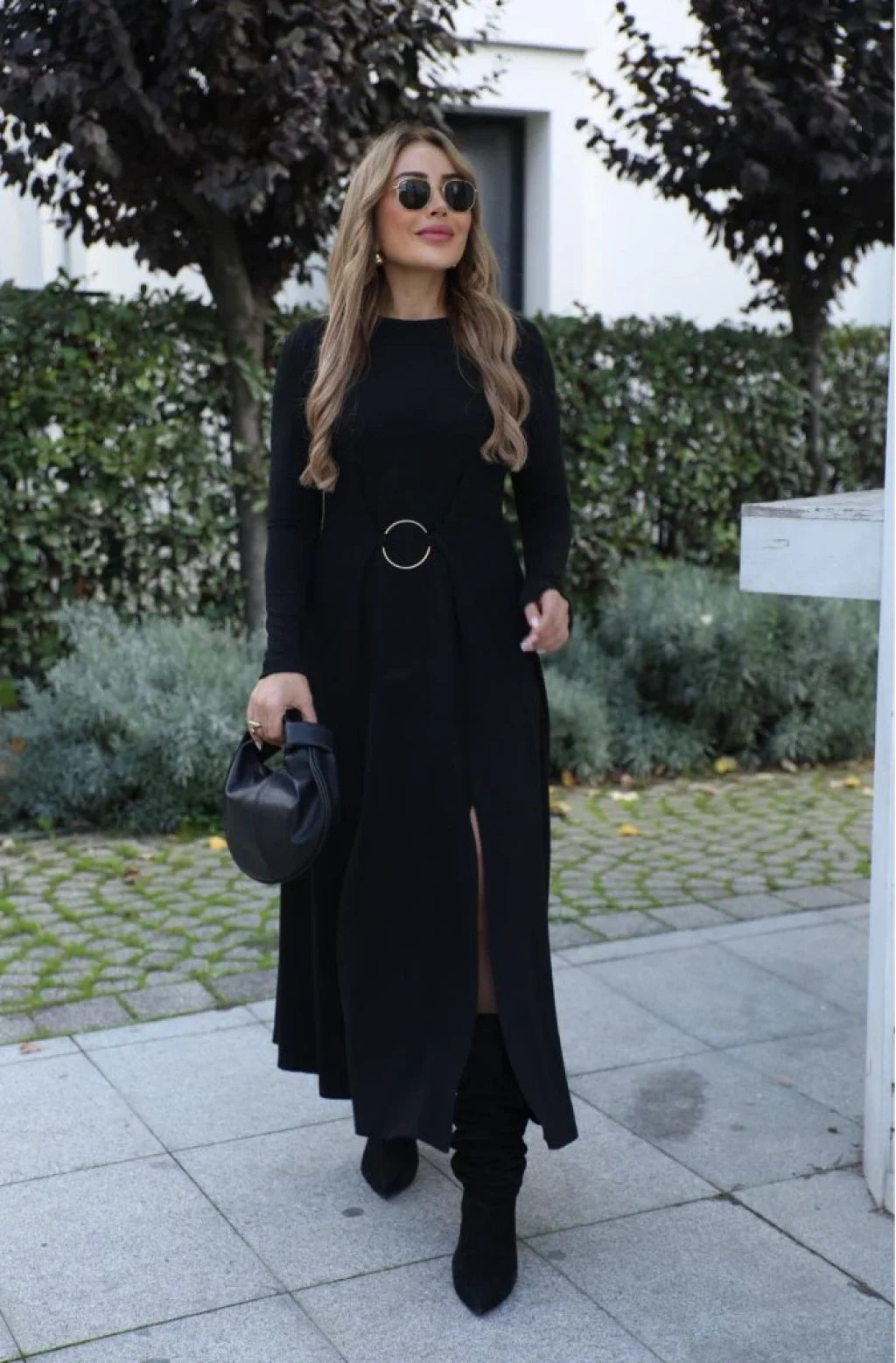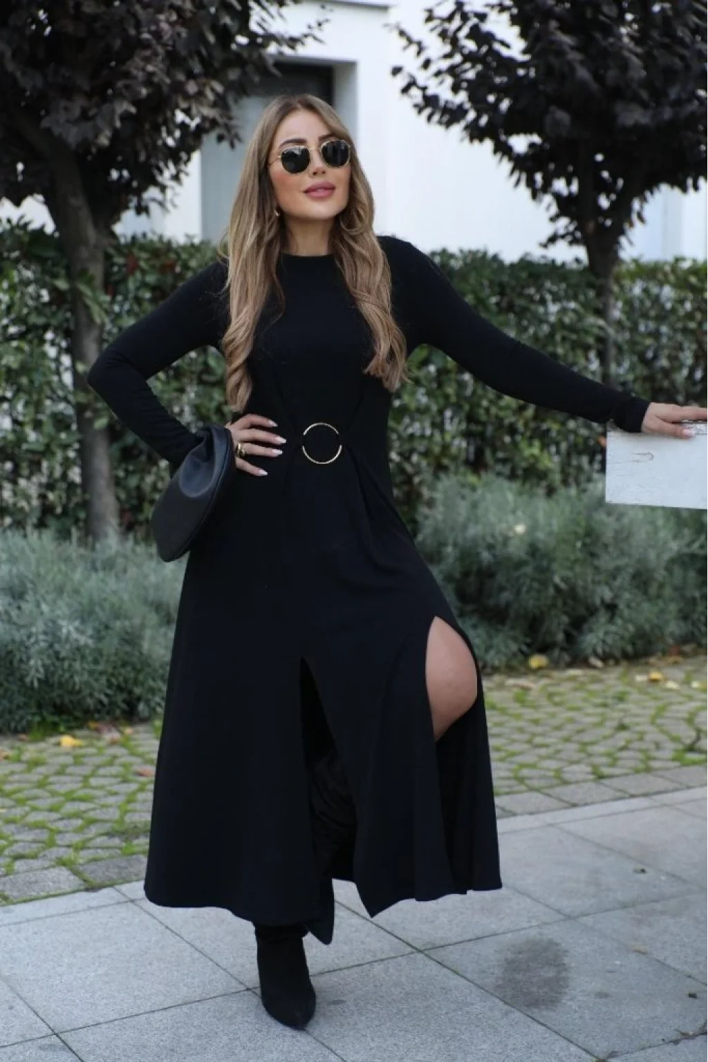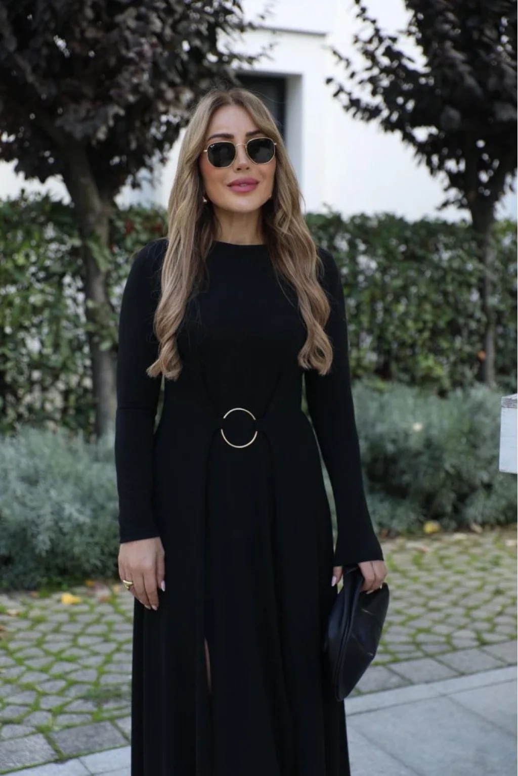 Kadın Uzun Kollu Bisiklet Yaka önden Halka Detaylı Yırtmaçlı Uzun Viskon Iki Iplik Elbise