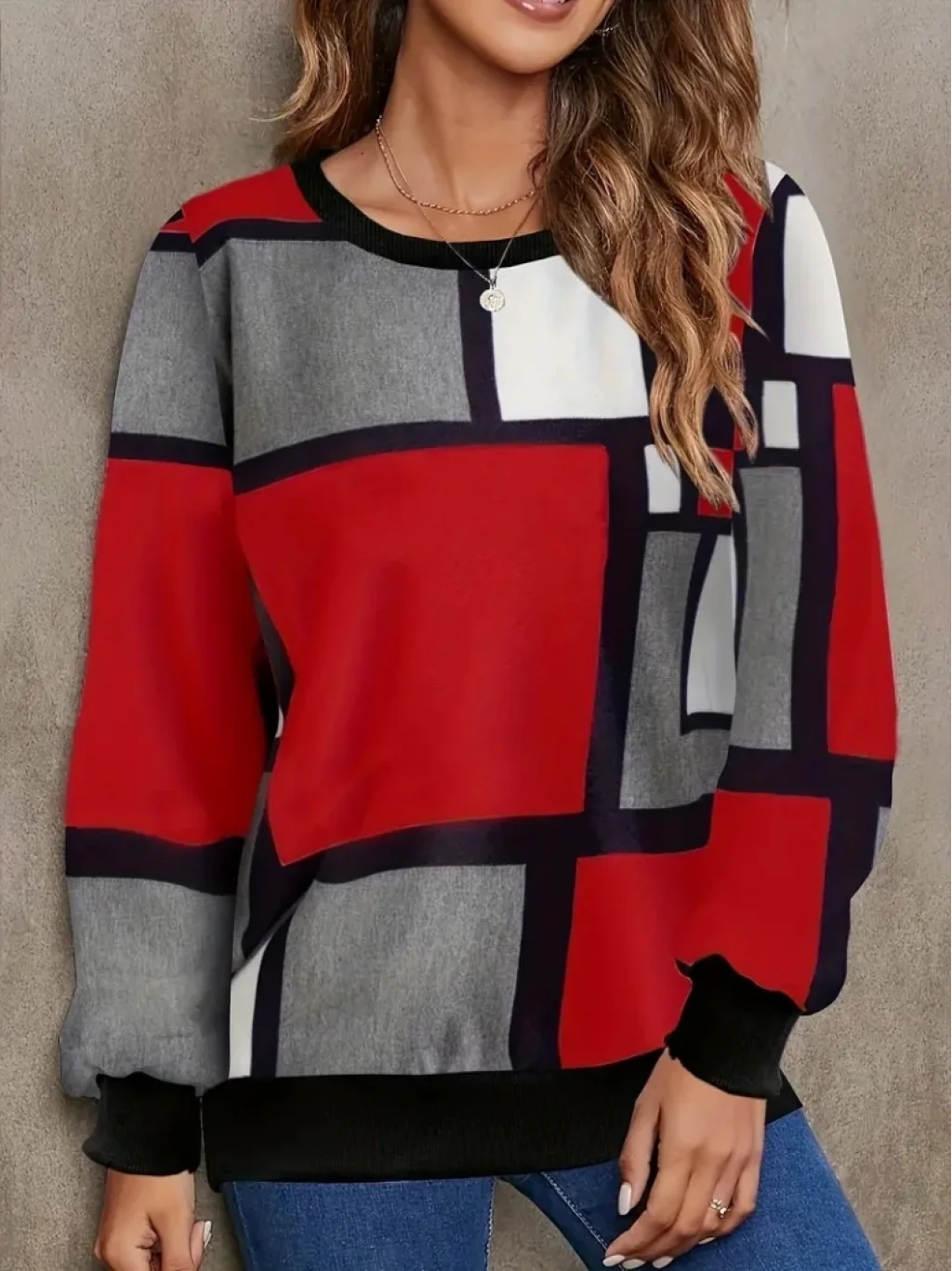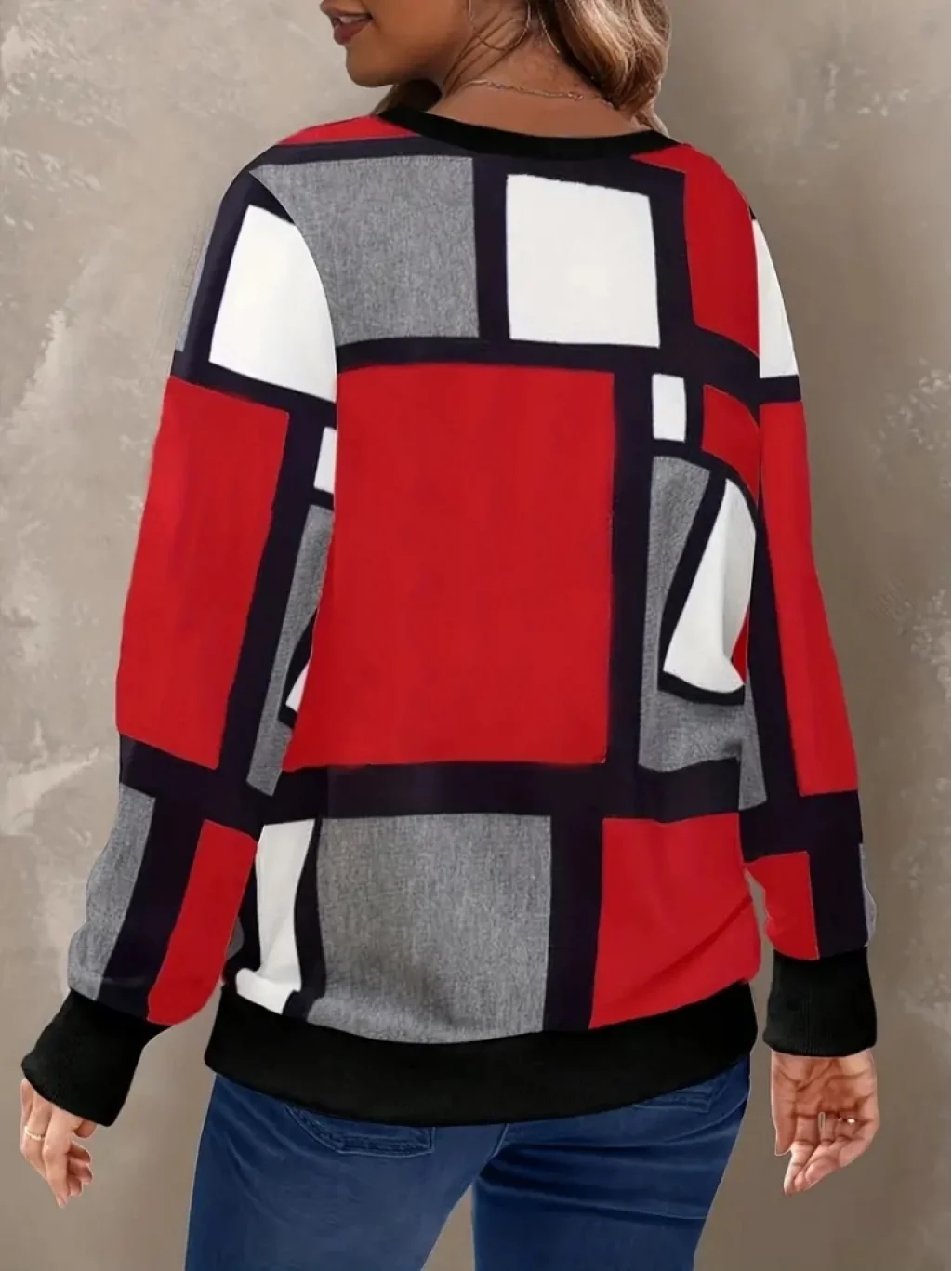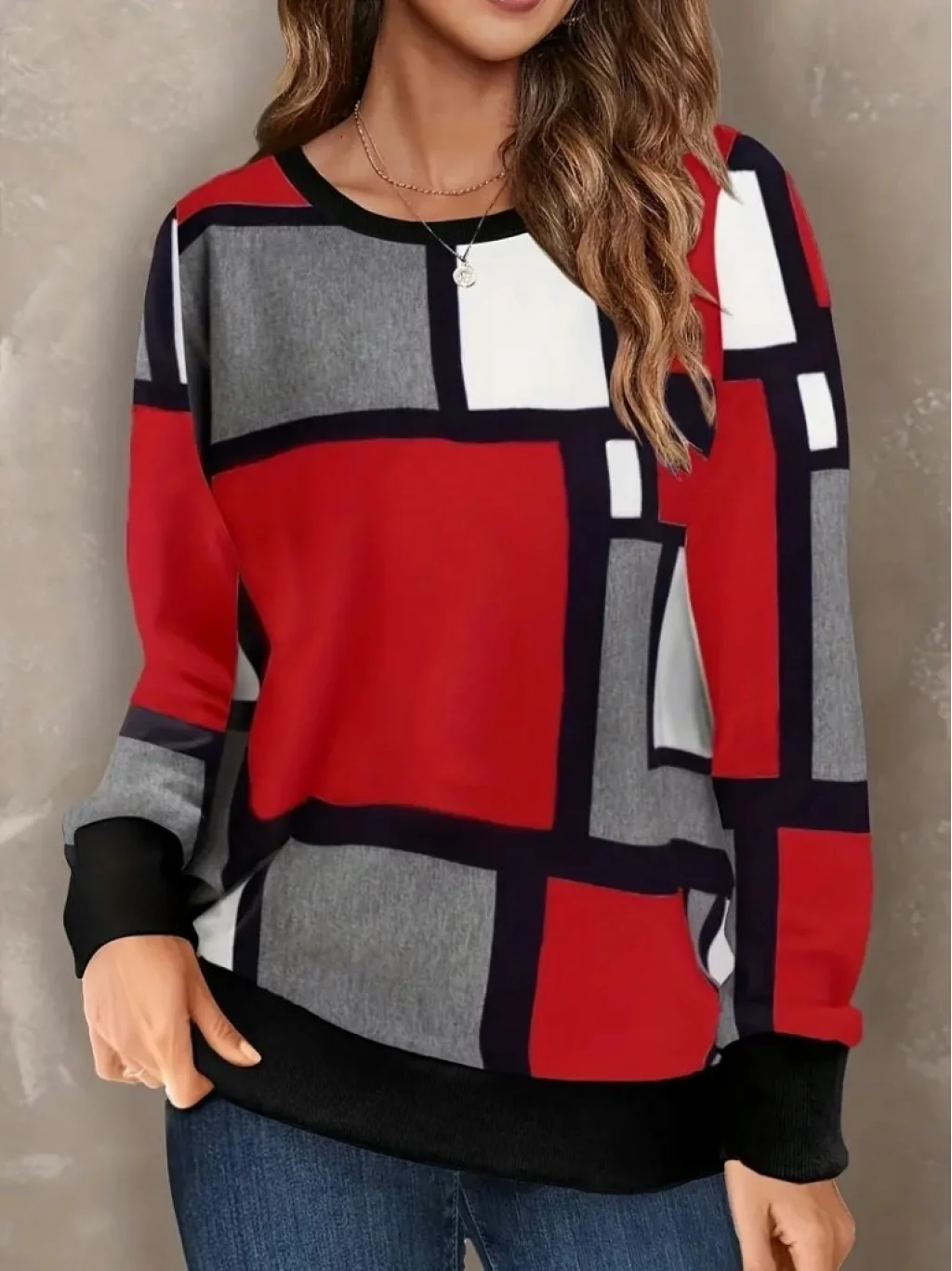Kadın Uzun Kollu Bisiklet Yaka Renkli Blok Baskı Dalgıç Bluz
