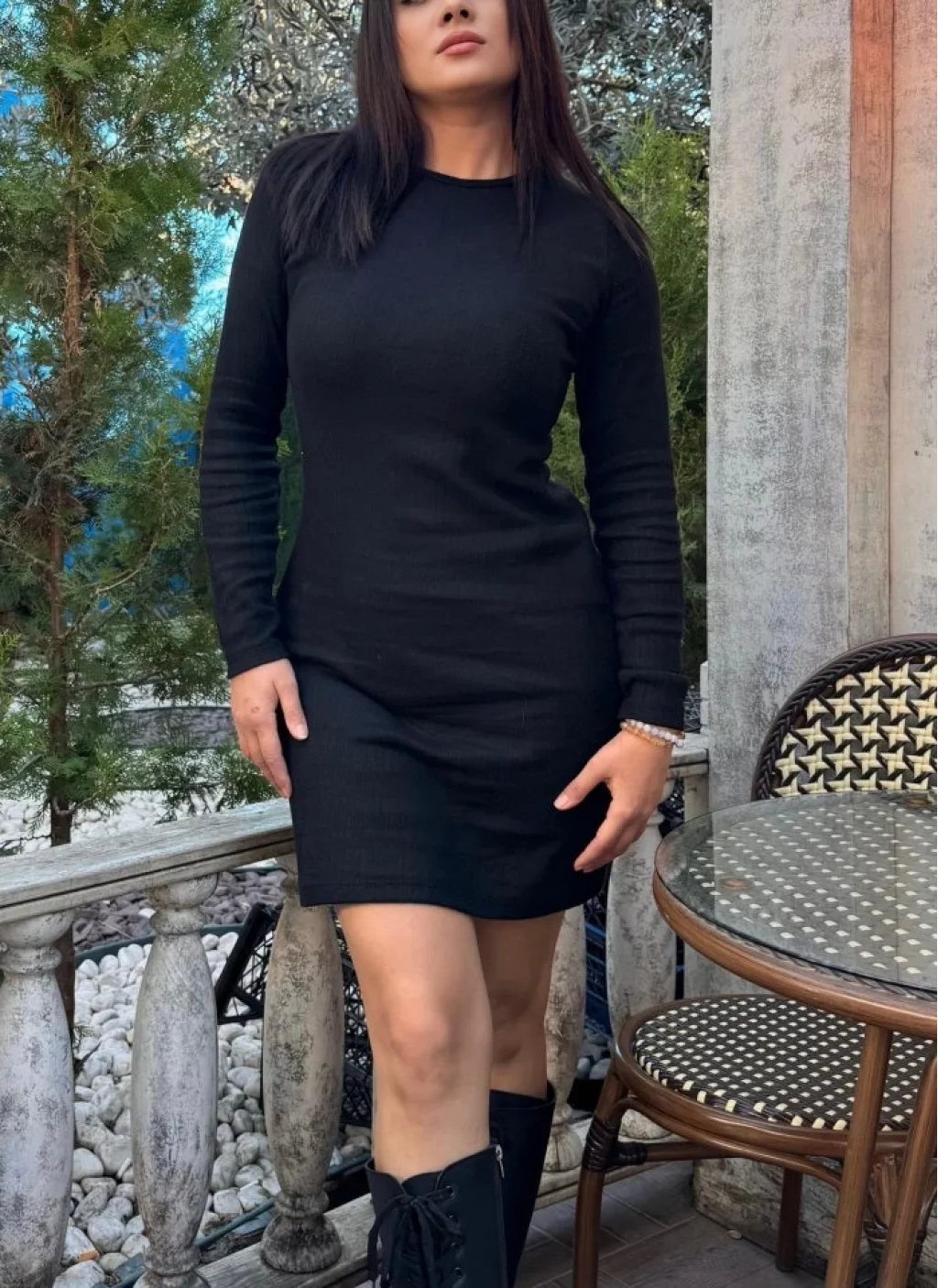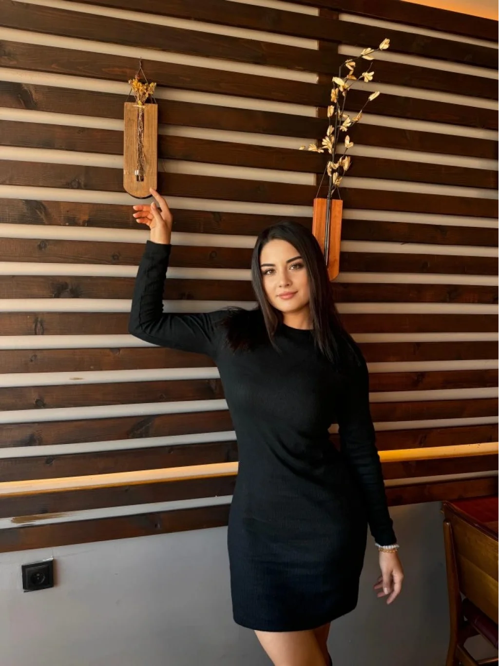 Kadın Uzun Kollu Bisiklet Yaka şardonlu Kalın Fitilli Kaşkorse Mini Boy Elbise