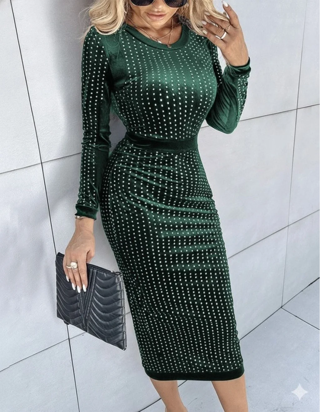 Kadın Uzun Kollu Bisiklet Yaka Taşlı Midi Kadife Elbise