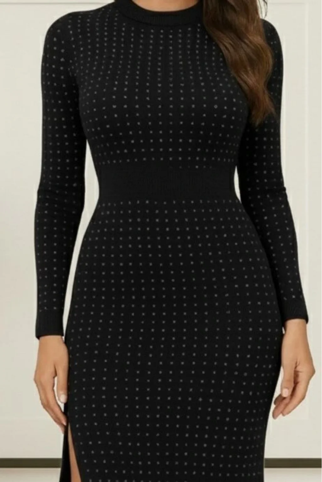 Kadın Uzun Kollu Bisiklet Yaka Taşlı Midi Kadife Elbise