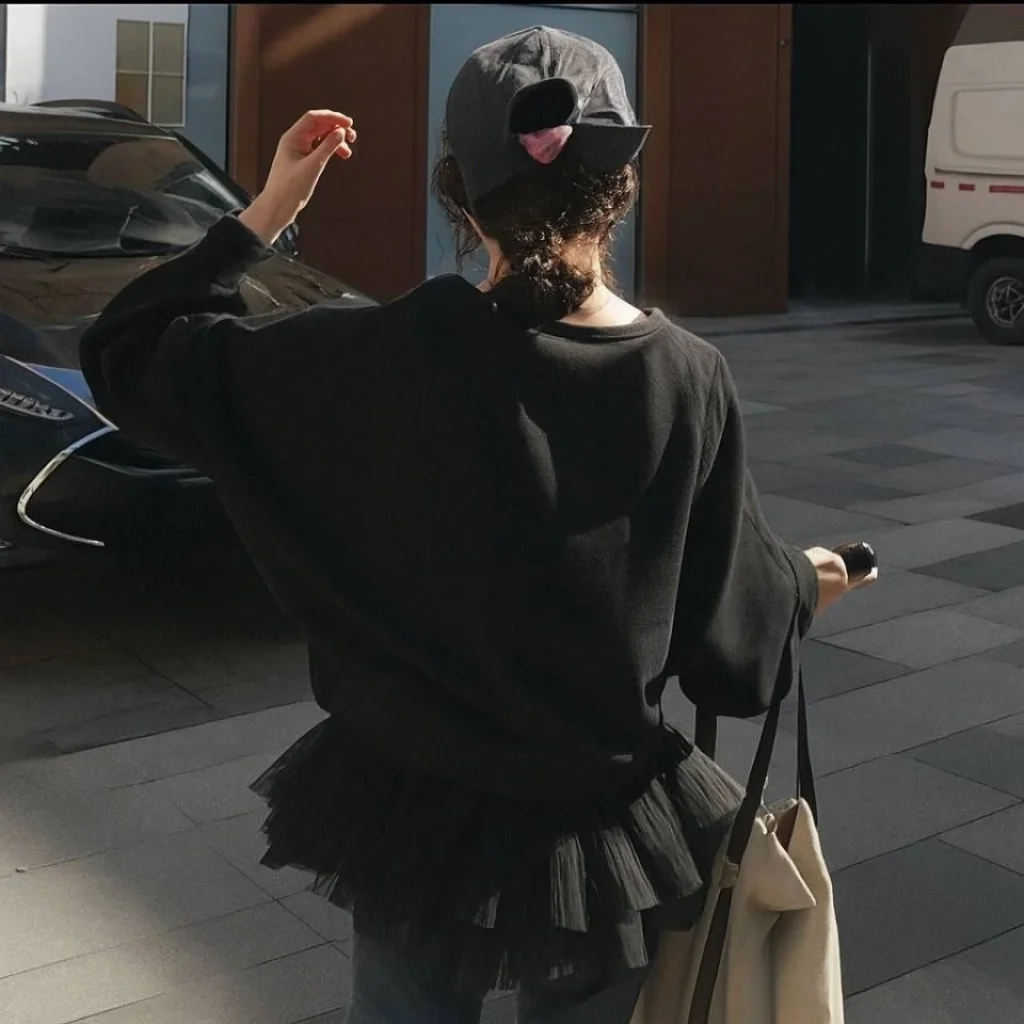 Kadın Uzun Kollu Bisiklet Yaka Tül Volan Detay üç Iplik Sweat
