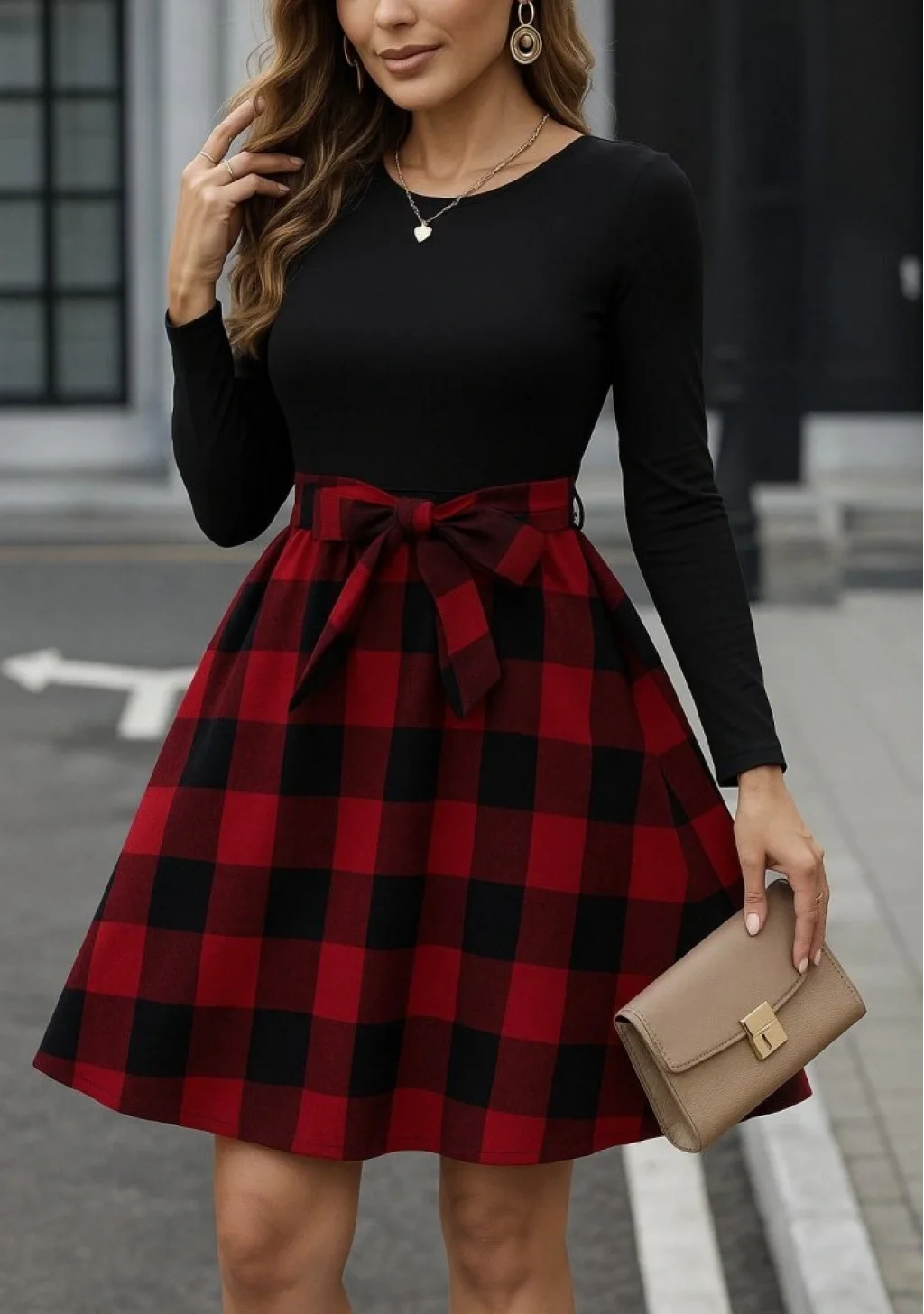 Kadın Uzun Kollu Bisiklet Yaka üst Viskon Alt Ekose Kısa Elbise