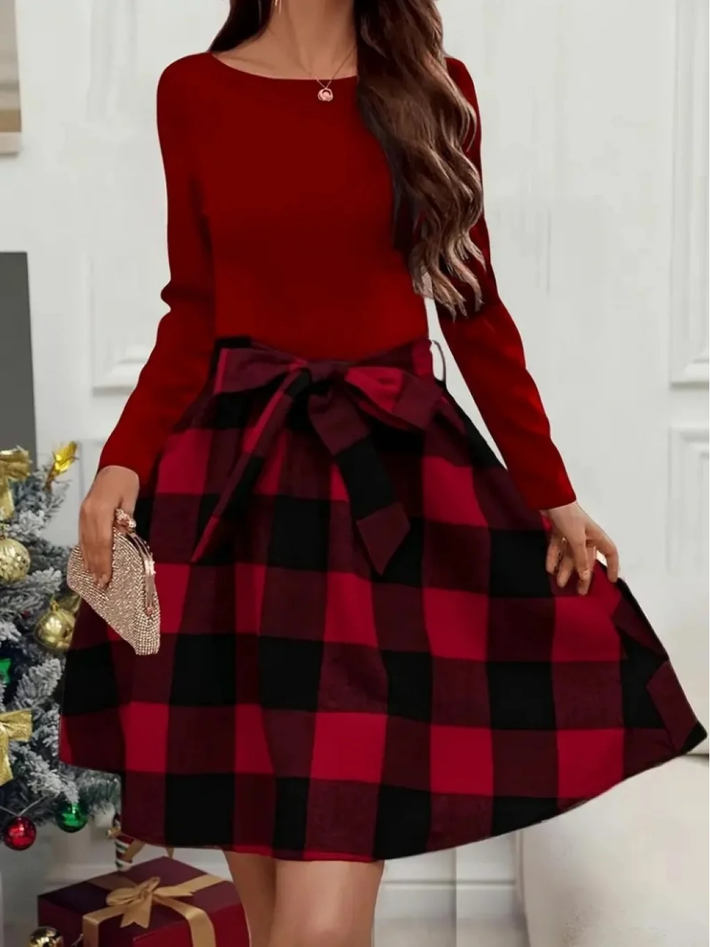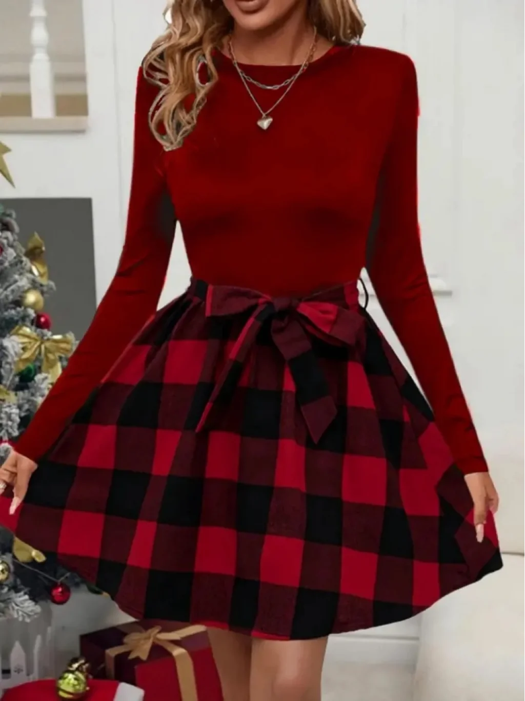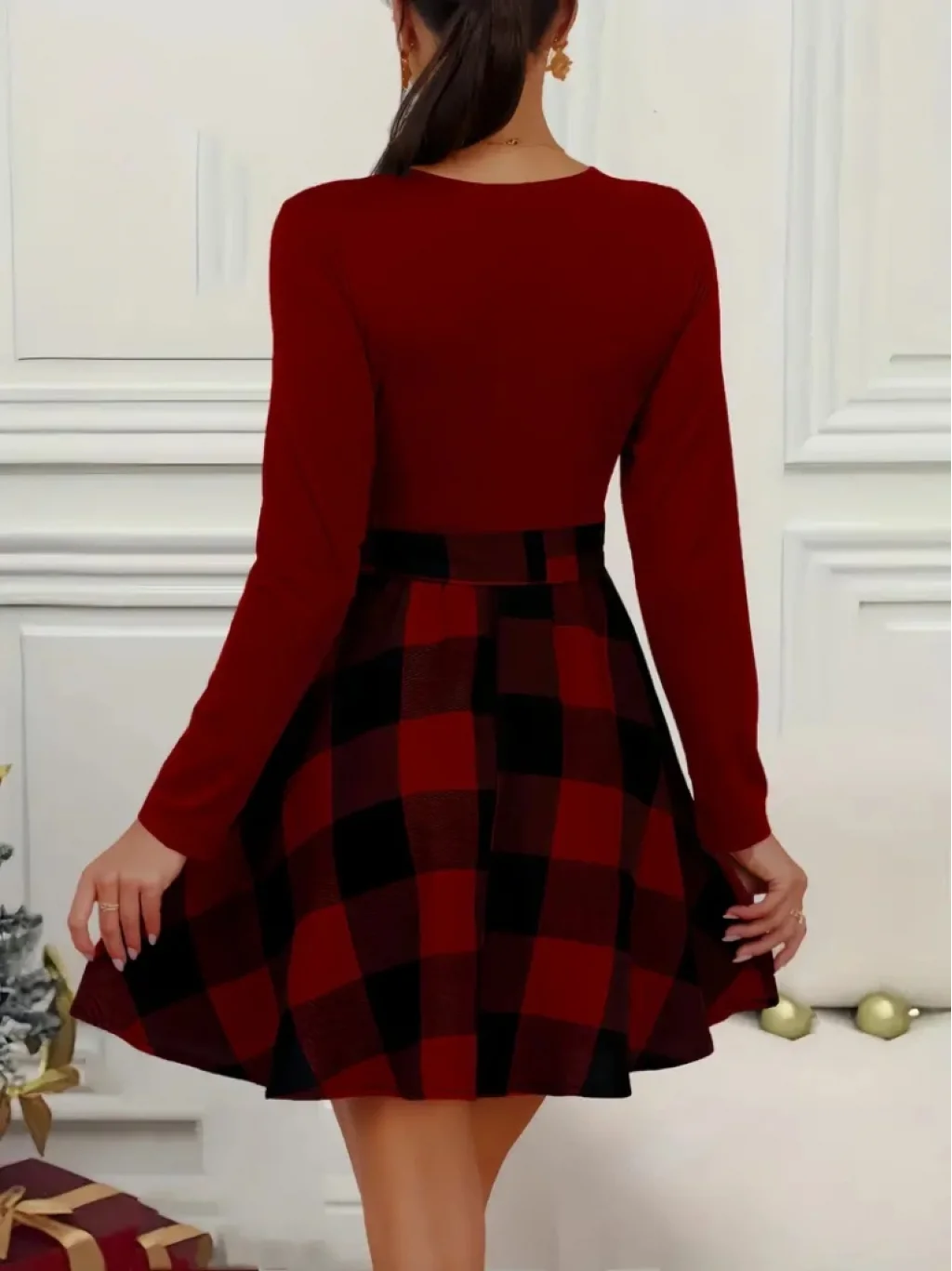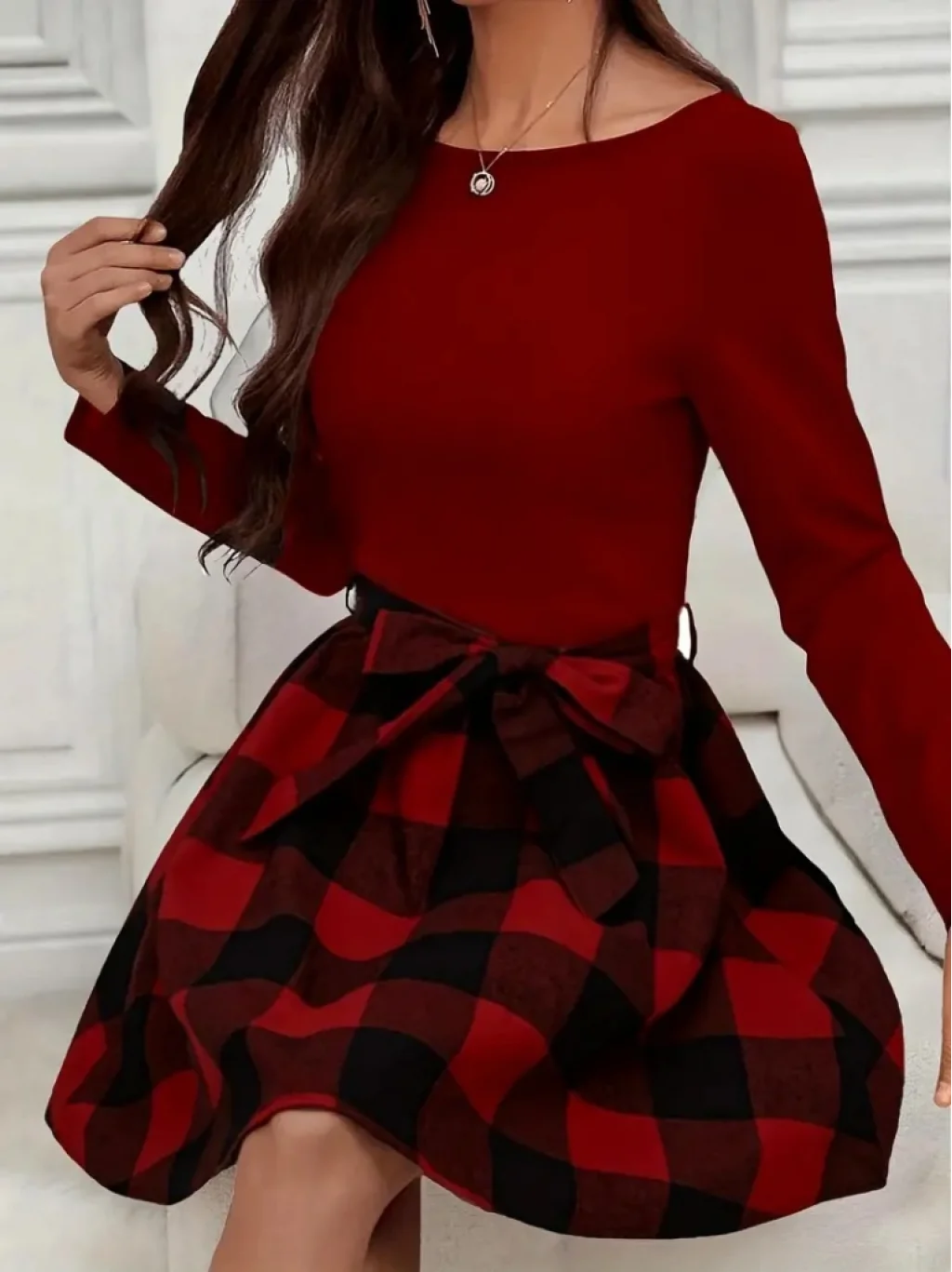 Kadın Uzun Kollu Bisiklet Yaka üst Viskon Alt Ekose Kısa Elbise