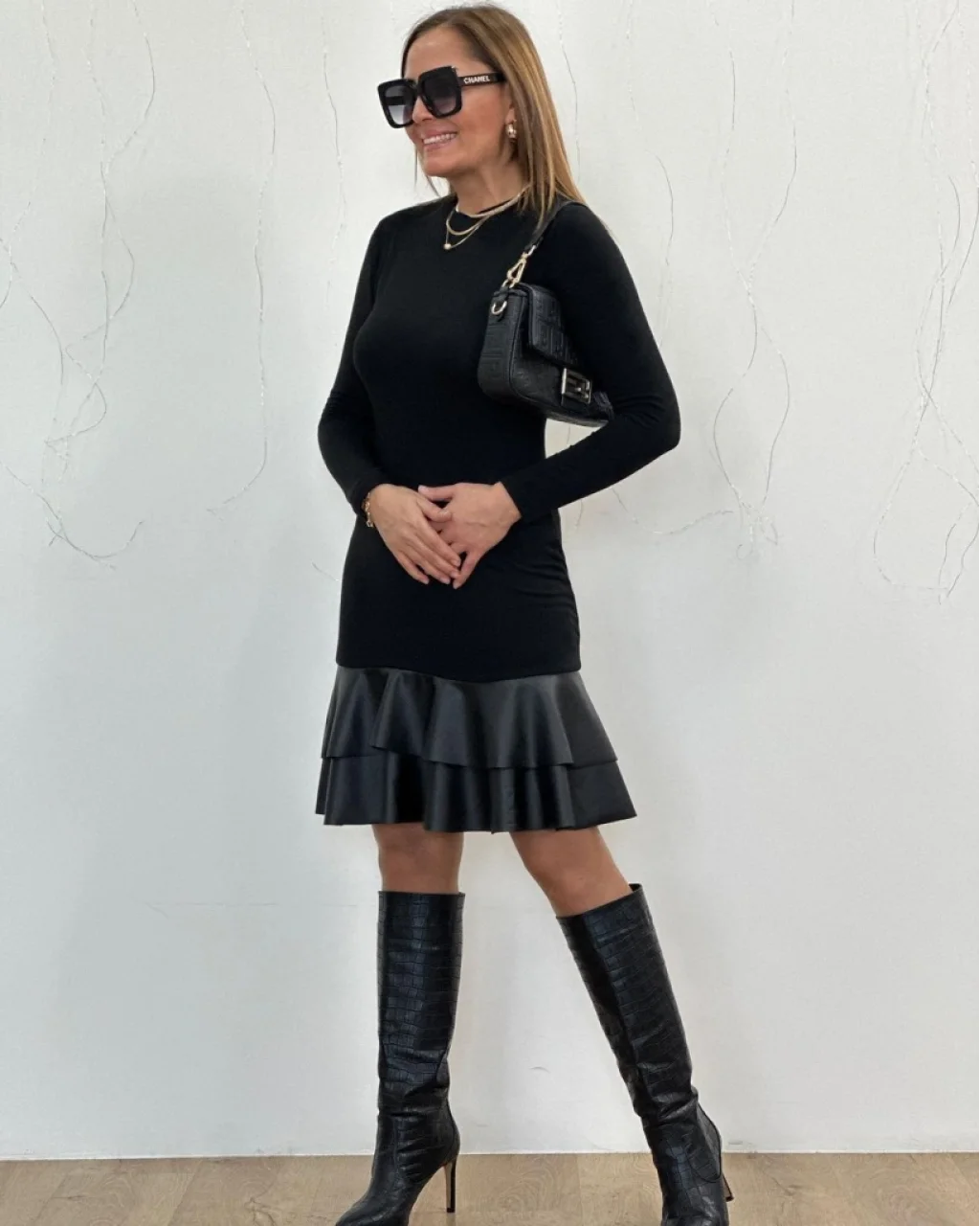 Kadın Uzun Kollu Bisiklet Yaka üst Viskon Etek Ucu Deri Kısa Elbise