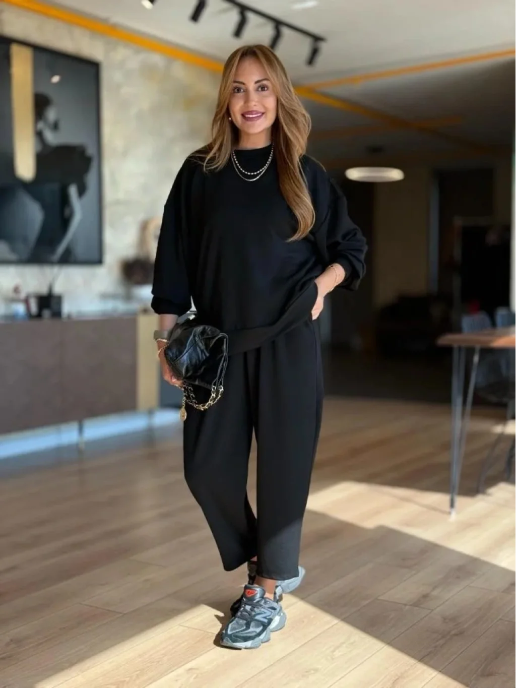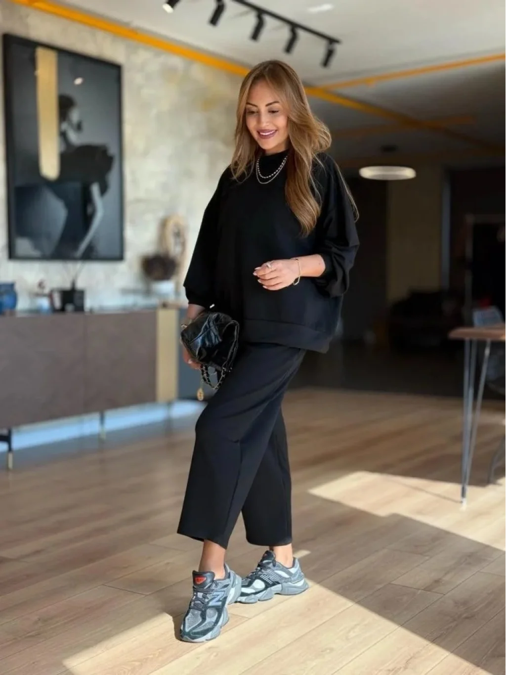 Kadın Uzun Kollu Bisiklet Yaka Viskon Iki Iplik Bluz Ve Pantolon Ikili Takım
