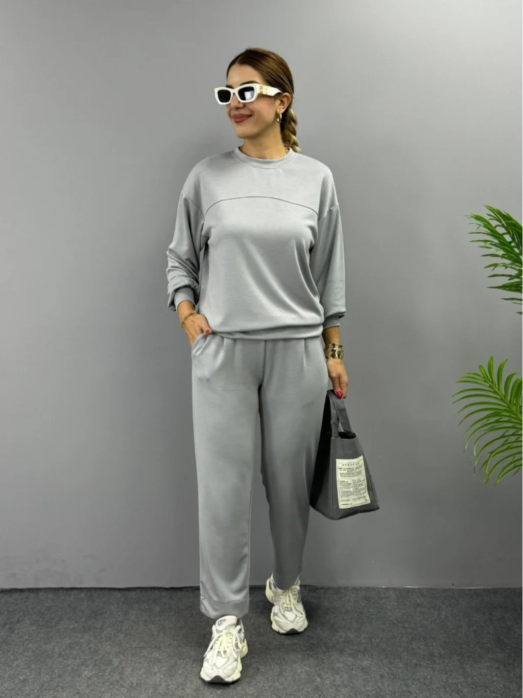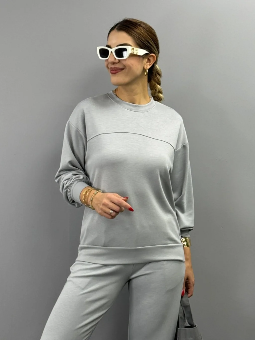 Kadın Uzun Kollu Bisiklet Yaka Viskon Iki Iplik Bluz Ve Pantolon Ikili Takım