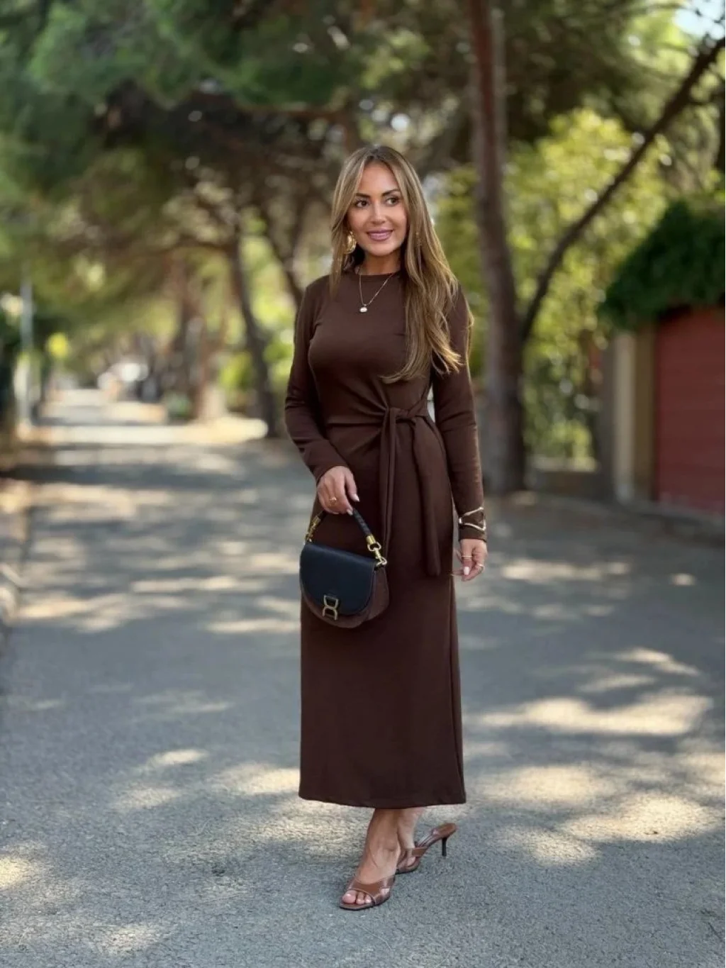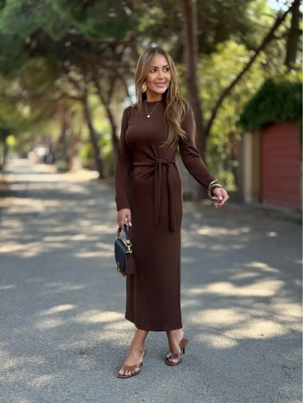 Kadın Uzun Kollu Bisiklet Yaka Yandan Bağlamalı Uzun Modal Elbise