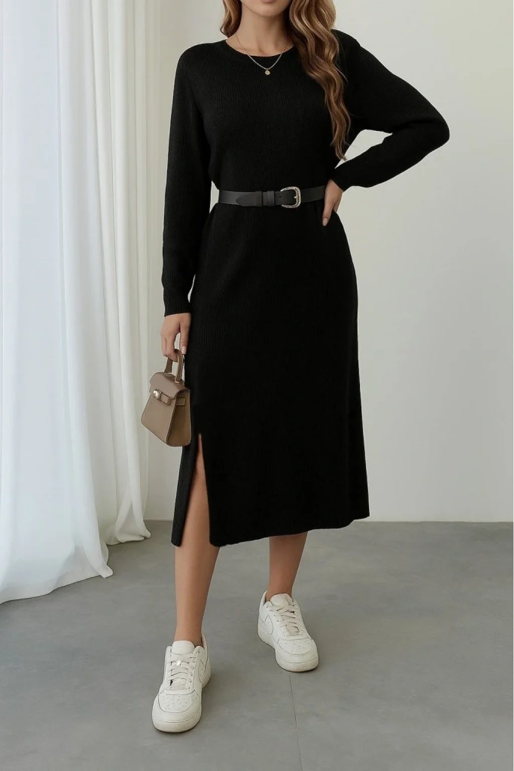 Kadın Uzun Kollu Bisiklet Yaka Yandan Yırtmaçlı Midi Triko Elbise